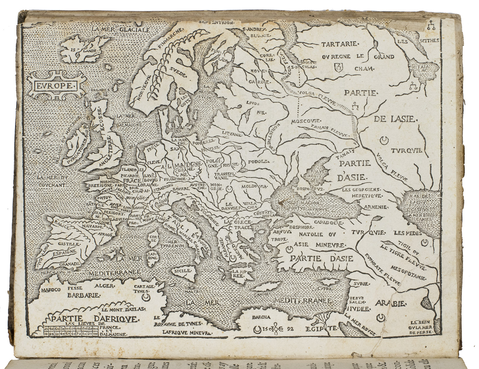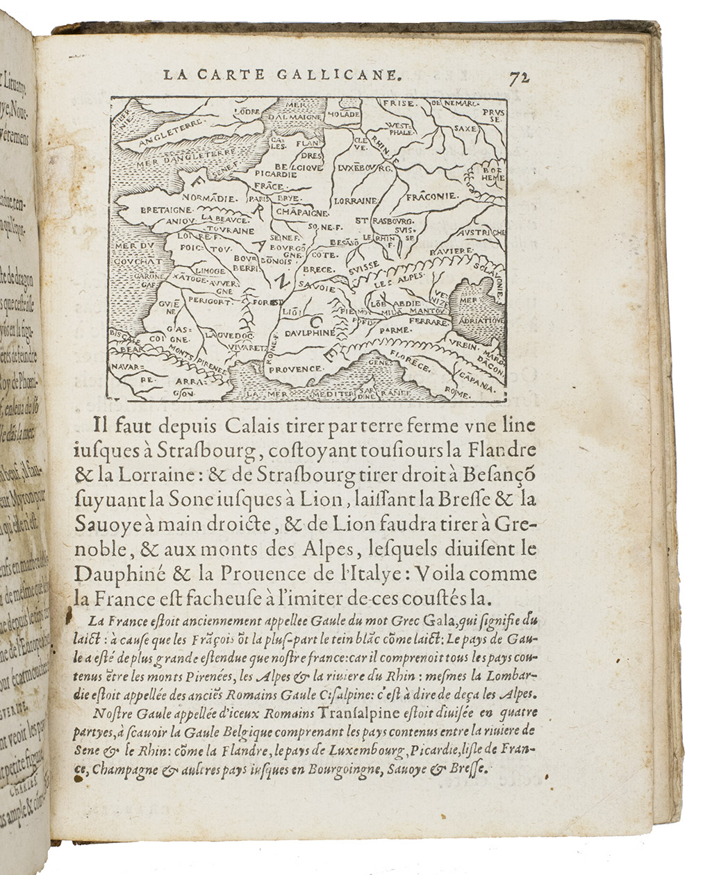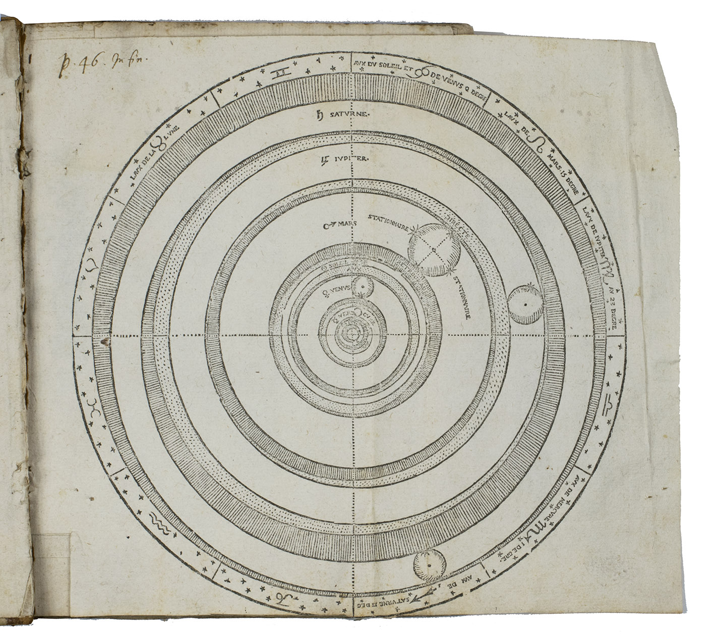 Langres, Jean des Preyz, 1592. 4to. With a woodcut on the title-page showing an armillary sphere, 3 woodcut folding plates of the solar system, a celestial chart in two hemispheres and a (terrestrial) map of the world in two hemispheres, 4 woodcut maps in the text (including a map of Europe), many astronomical and cosmographical woodcut figures and tables in the text and woodcut head- and tailpieces and initials. 18th-century half brown sheepskin, brown paper sides. 92 ll.