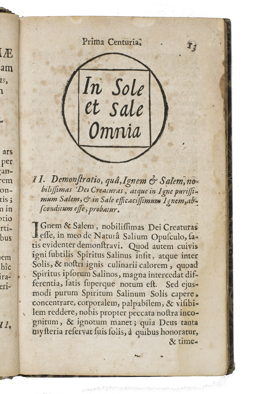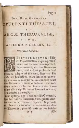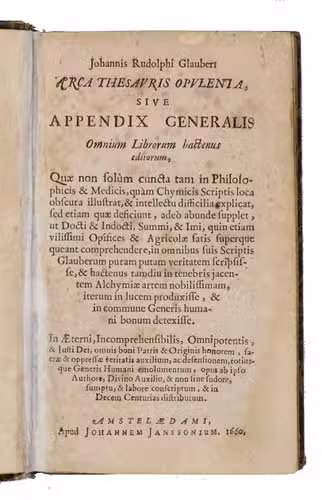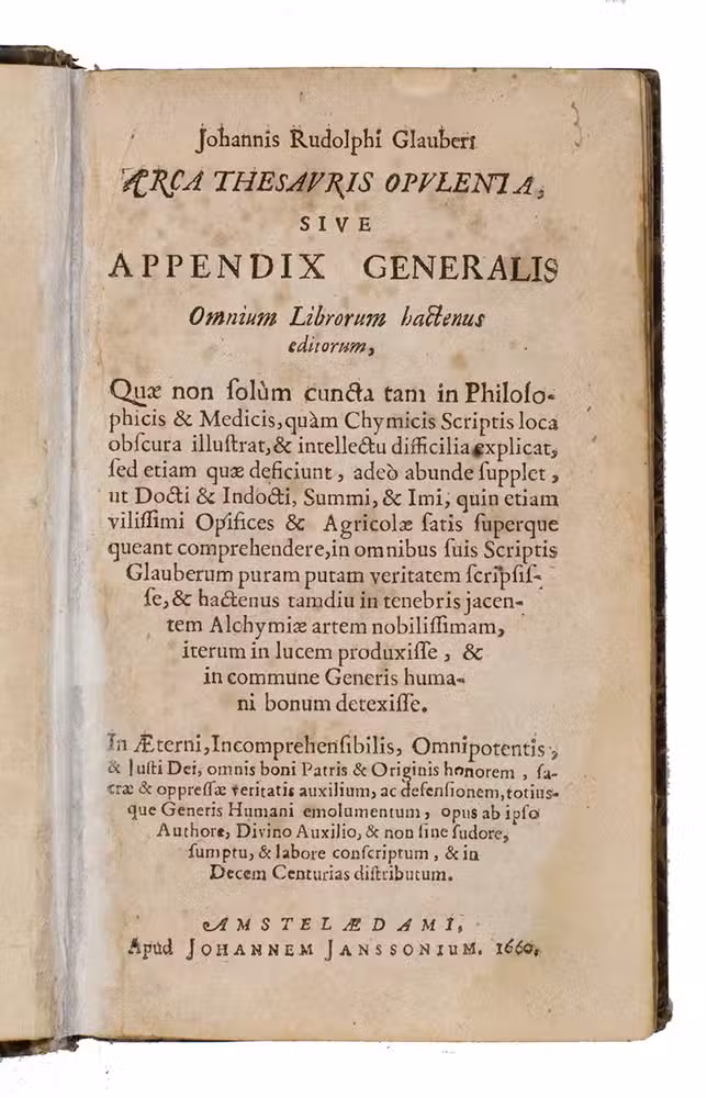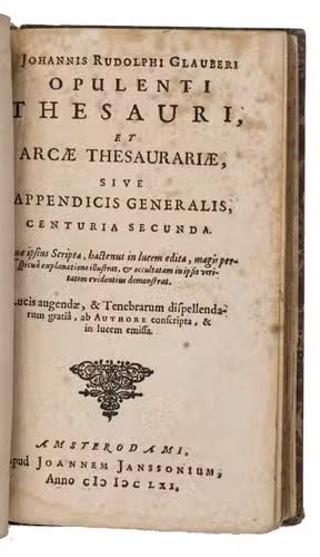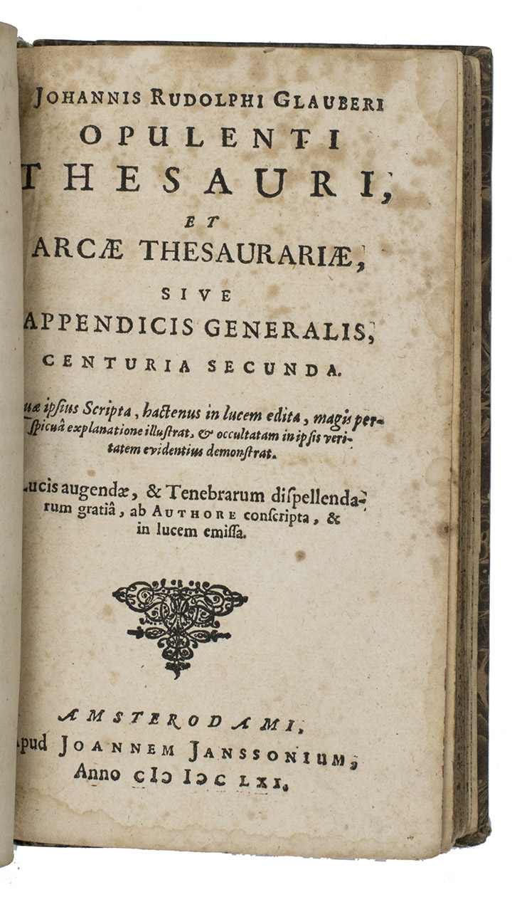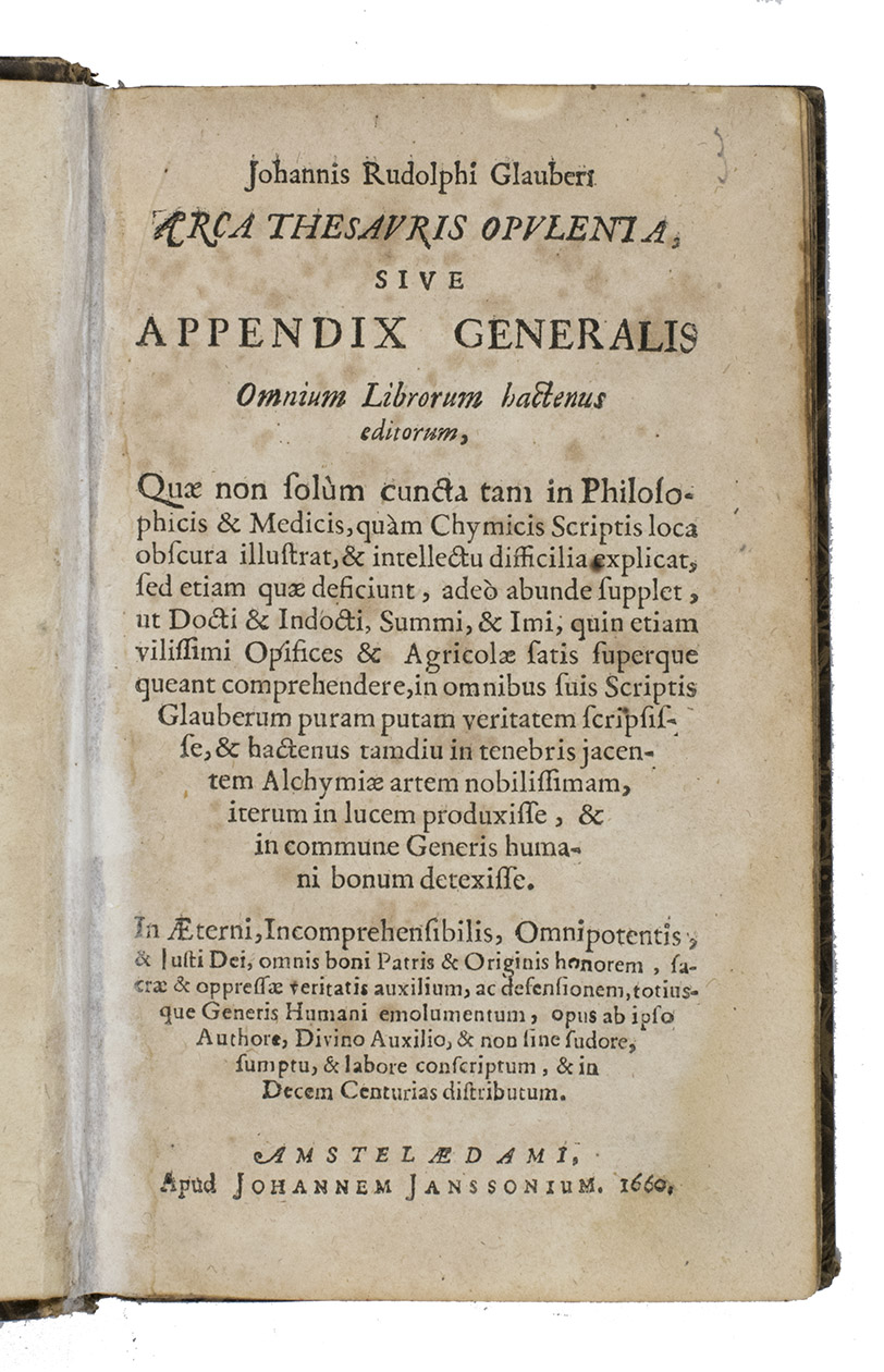 First edition of the Latin translation of the first edition in the original German: Reicher Schatz- und Sammelkasten oder Appendix generalis, published by Janssonius in the same year. It summarizes the contents all of Glaubers works published to that date, in 200 chapters. Although the title-page was supposed to cover ten "centurias", only these two were published until 1668 (the drop-titles and running heads indicat the prima or secunda centuria), when the third, fourth and fifth were published together in a single volume of only 87 pages.