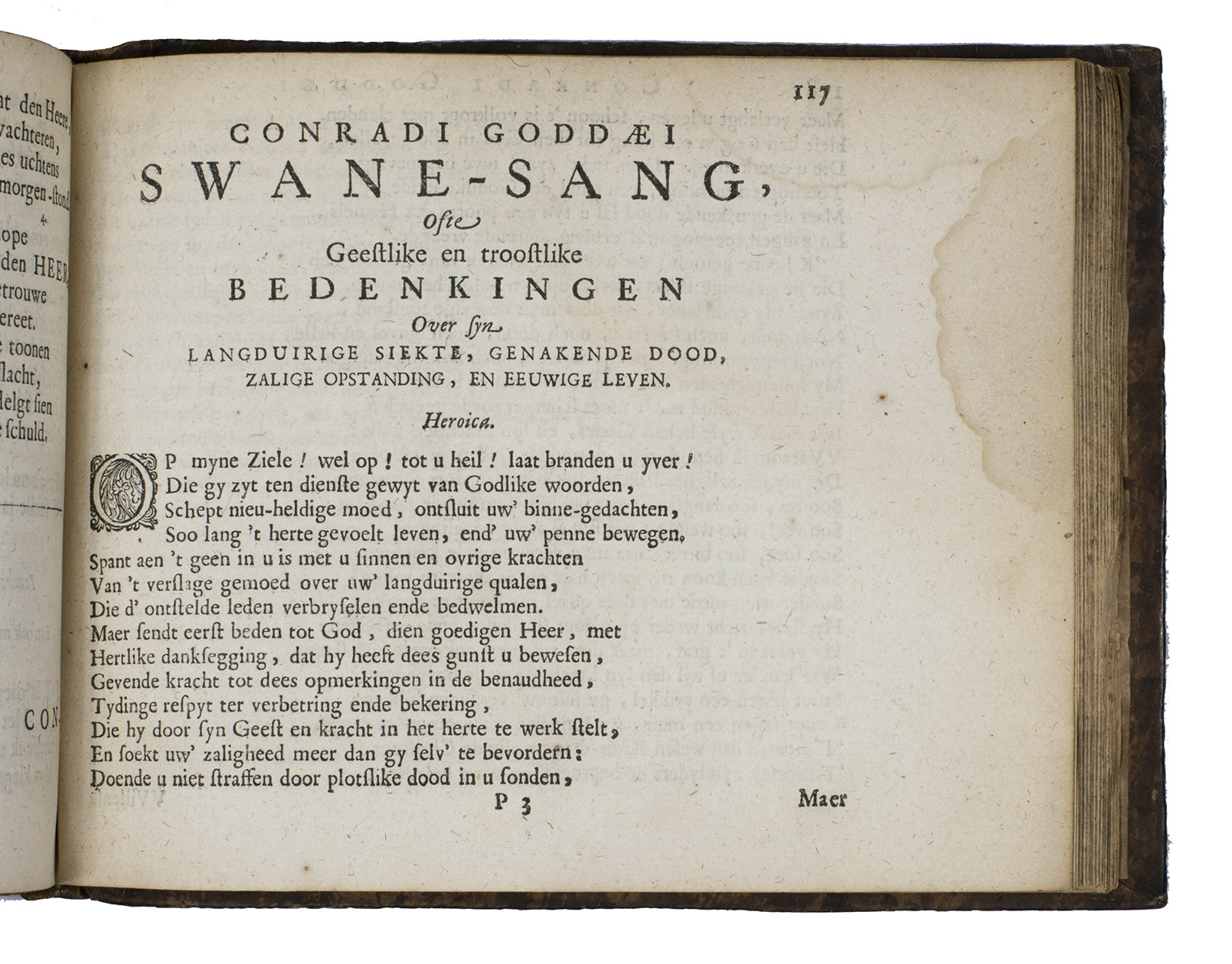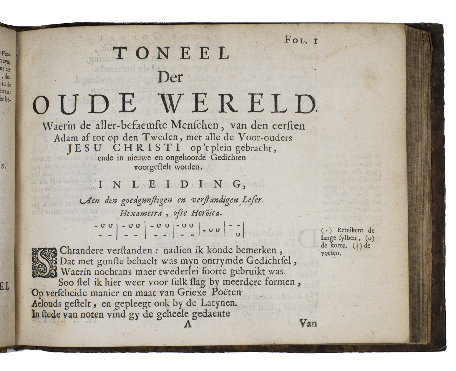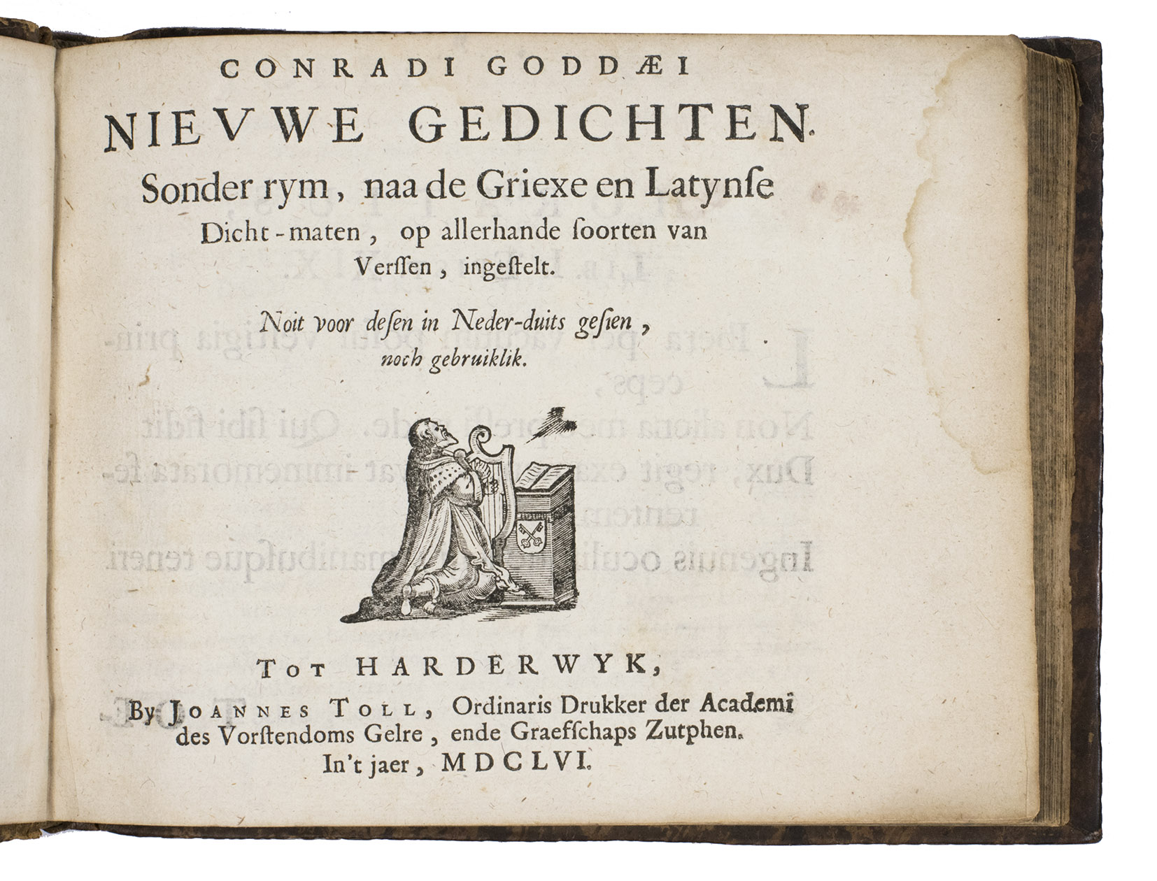 Very rare Dutch songbook and an important contribution to Dutch poetic art, with all songs strictly based on classical metrics, and without rhyme. In his dedication to the States of Gelre and Zutphen the author presents his work as the new and perfect form for all Dutch poetry, and a model for future poets. In the preface, which in fact gives an extensive comparative study of prosody, the poet's method is explained to the reader, and most of the poems are accompanied by metrical signs. Conrad Goddaeus was Minister of the Church at Vaassen from 1634 to his death in 1658. He was a valued friend of Pieter Cornelisz. Hooft, and in the present songbook Goddaeus also transposed Hooft's Granida into the "correct metre", under the title "Rei van Jofferen".