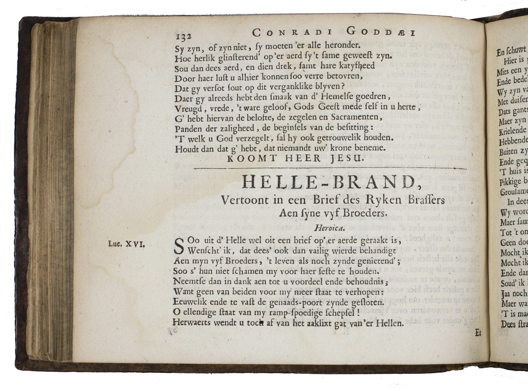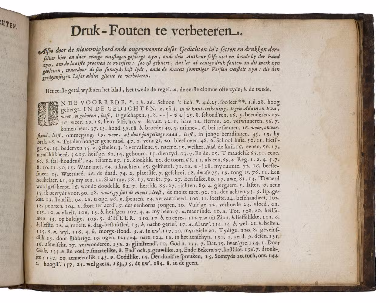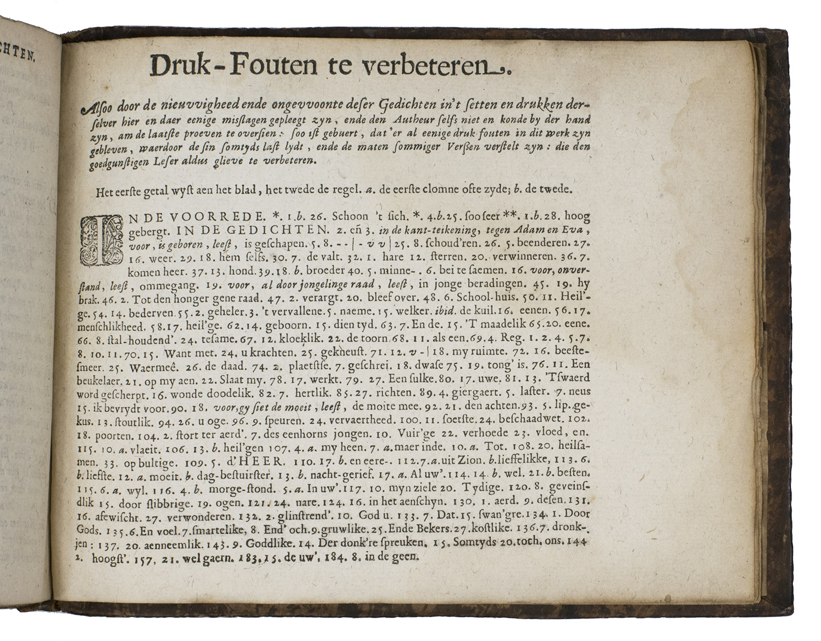 Very rare Dutch songbook and an important contribution to Dutch poetic art, with all songs strictly based on classical metrics, and without rhyme. In his dedication to the States of Gelre and Zutphen the author presents his work as the new and perfect form for all Dutch poetry, and a model for future poets. In the preface, which in fact gives an extensive comparative study of prosody, the poet's method is explained to the reader, and most of the poems are accompanied by metrical signs. Conrad Goddaeus was Minister of the Church at Vaassen from 1634 to his death in 1658. He was a valued friend of Pieter Cornelisz. Hooft, and in the present songbook Goddaeus also transposed Hooft's Granida into the "correct metre", under the title "Rei van Jofferen".