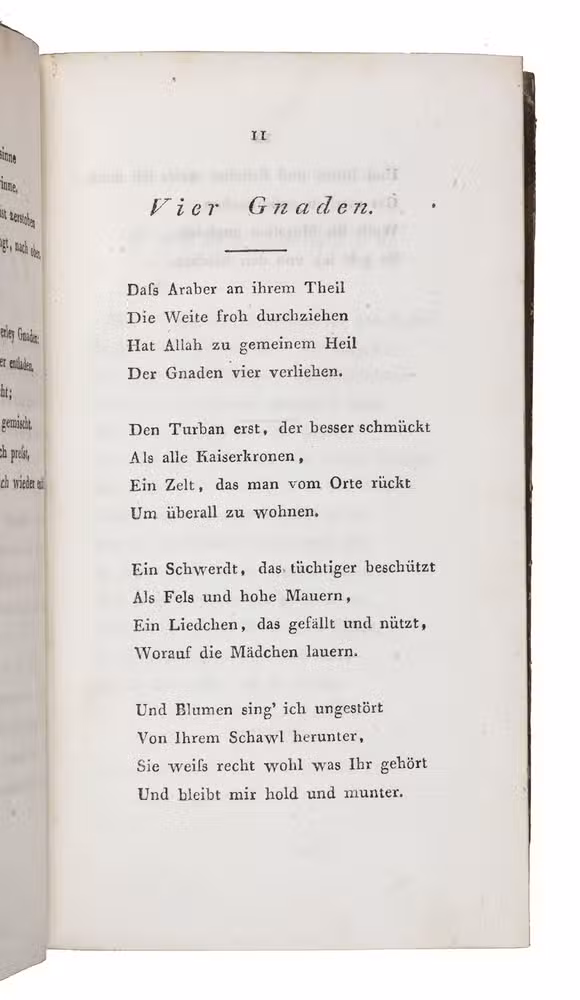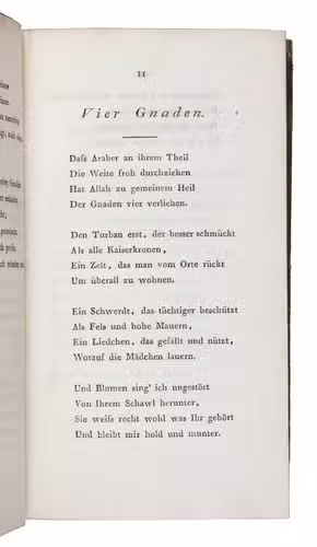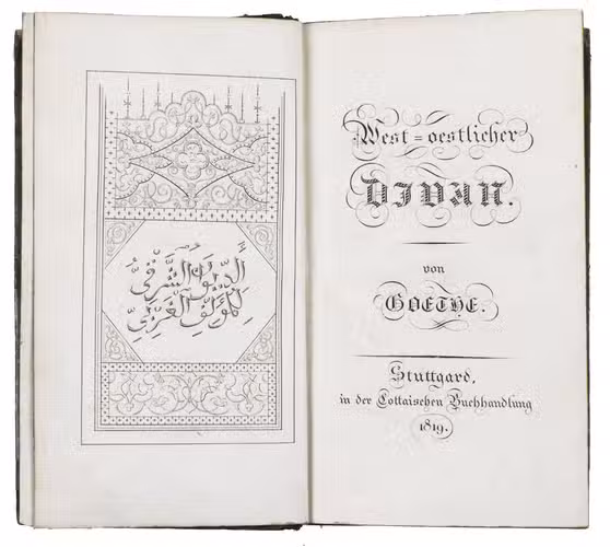 First edition of Goethe's lyrical poems inspired by the work of the great Persian poet Hafez (ca. 1325-1390). The work was intended to enact a dialogue between Eastern and Western poetry, but also captures Goethe's feelings for the Austrian dancer Marianne von Willemer (1784-1860), who wrote some of the poems. It is the most famous interaction with Eastern poetry in German Romantic literature, and includes some of the best poems of Goethe's later years.