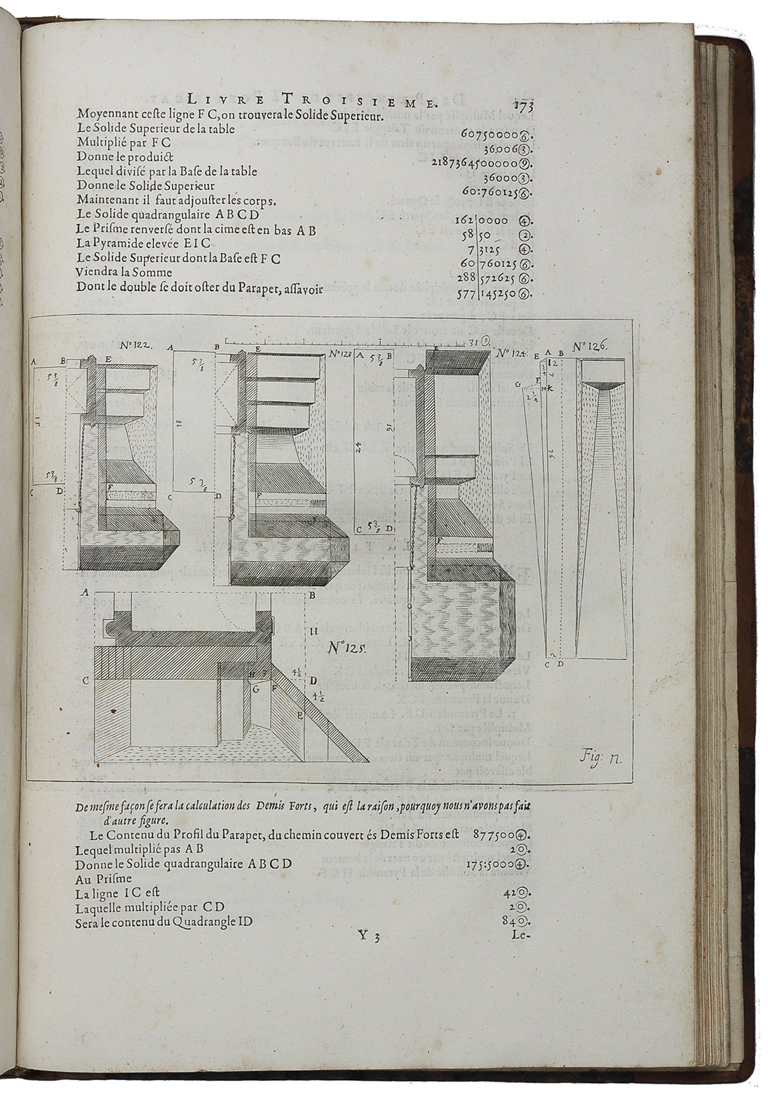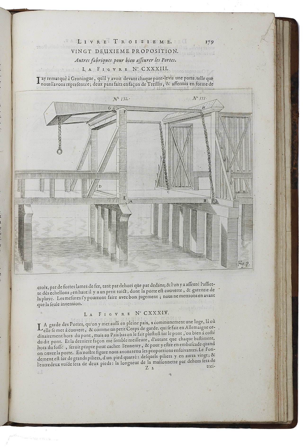 First French edition (with the engraved title-page new for this edition) of an instruction manual for designing fortifications, with an emphasis on drawing their plans, profiles, perspective views, etc., first published in Latin (also by the Elzeviers) in 1643 using the same illustration plates. Most of the illustrations show fortification plans, profiles, elevations, etc., including many details, but they also include plain and solid geometrical diagrams, drafting instruments, bridges and military buildings. Many of the plans include a scale. The book, dedicated to the Dutch Stadtholder and Prince of Orange Frederick Hendrick, shows the Leiden Elzeviers at their high point, with stunning woodcut decorations and initials, and good presswork. Nicolaus Goldman (1611-1665) was born in Breslau but studied in Leiden and settled there permanently, teaching military engineering.