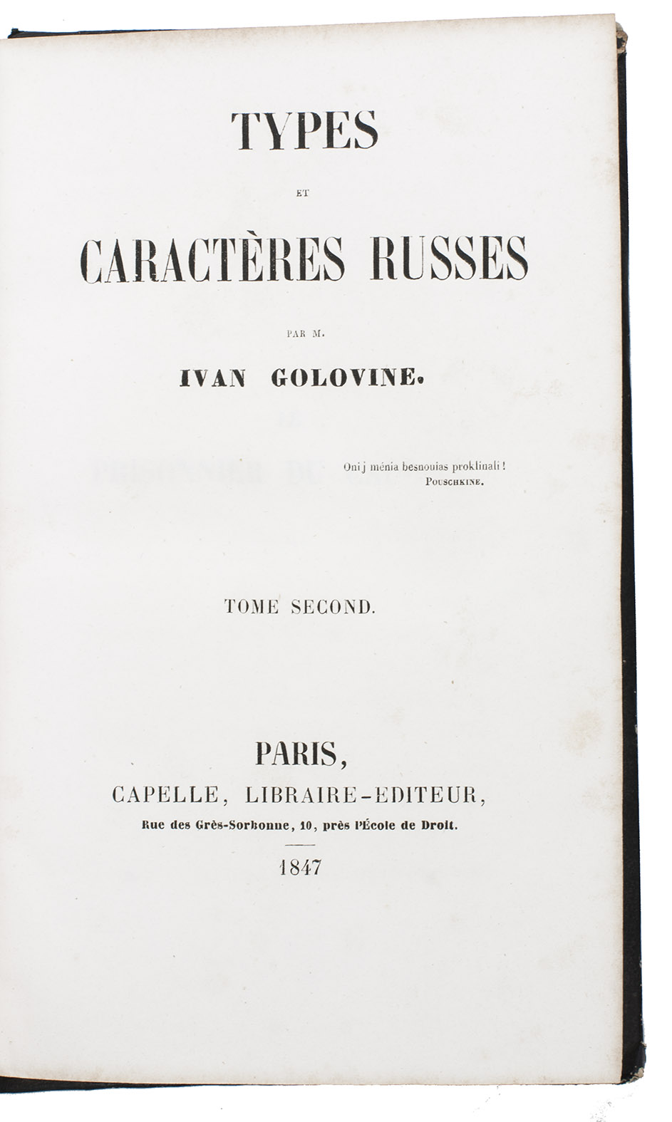 First edition of a critical political work on Russia by Ivan Golovine (1816-1890), a Russian exile living in England, France, Germany and eventually the United States. It includes several short stories, "the subjects which are principally political, and borrowed from passing events" (English edition), often written in dialogue form. With these stories, perhaps partly fictional, the author tries to point out the shortcomings and maladministration of the Russian government and especially of Tsar Nicolas I and his predecessor, Alexander I. Golovine described Russia as the most "wretched of countries", its population basically being slaves, which didn't make him popular among his fellow Russian exiles. The work was dedicated to Lord Dudley Stuart, who received Golovine during his stay in London.