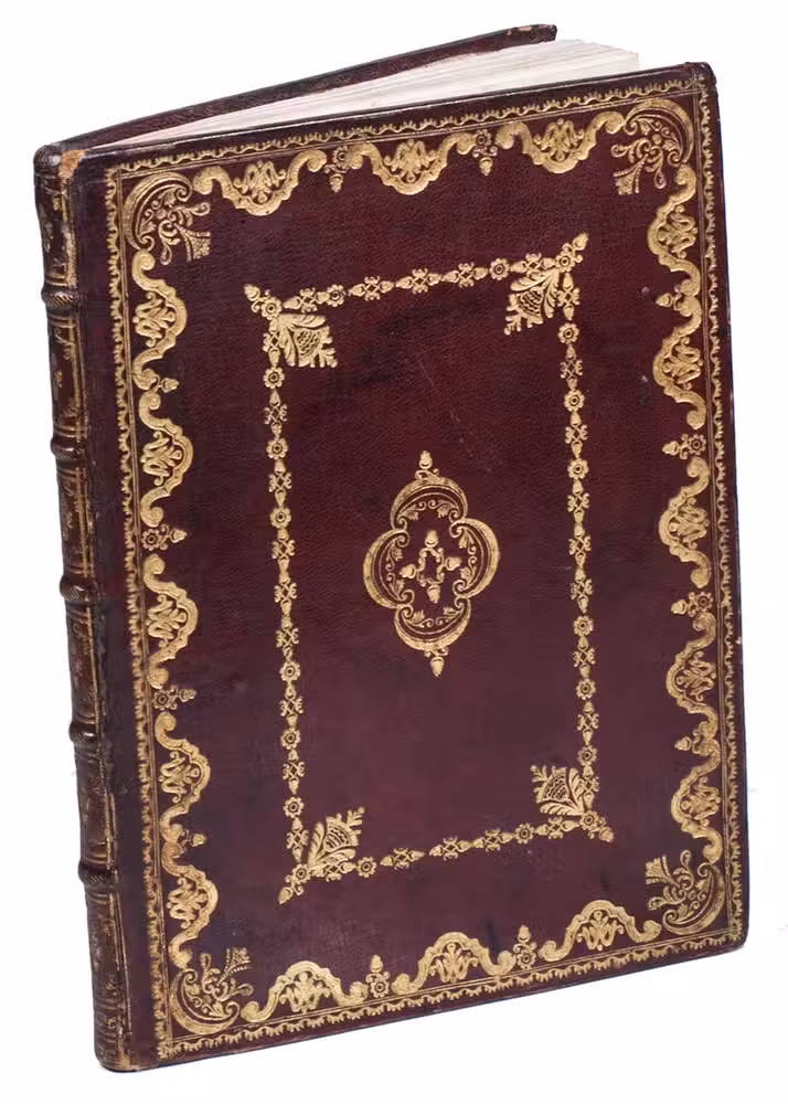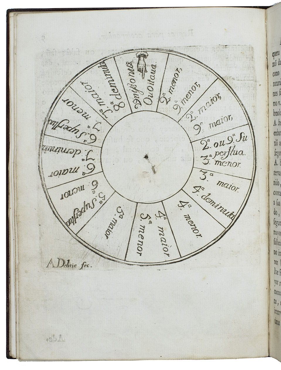 Lisbon, Francisco Luís Ameno, 1758. 4to (21 x 15 cm). With 12 pages of engraved music printed from 12 copper plates on both sides of 6 inserted leaves (mostly polyphonic music with 4 double staves - G and F clef - per page). Further with a full-page engraved dial showing the 12 intervals in all major and minor keys, including diminished and augmented intervals (lacking the inner rotating dial with the twelve notes: photocopy supplied), a woodcut ornament on the title-page, 2 woodcut decorated initials (from 2 different series) and 2 woodcut head pieces. Contemporary, richly gold-tooled red goatskin morocco. [8], “39” [= 47] [pp. 45-47 numbered as 37-39], [1 blank], [2], [2 blank] pp.