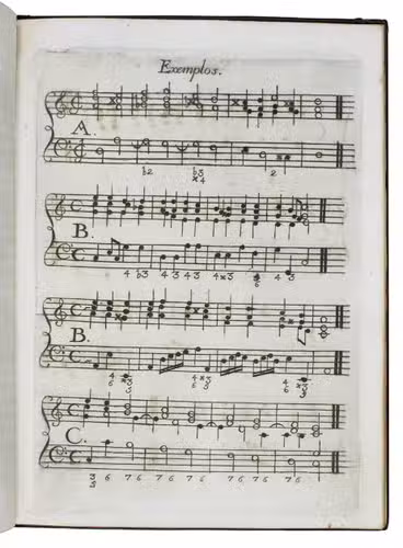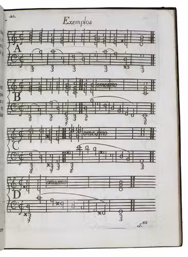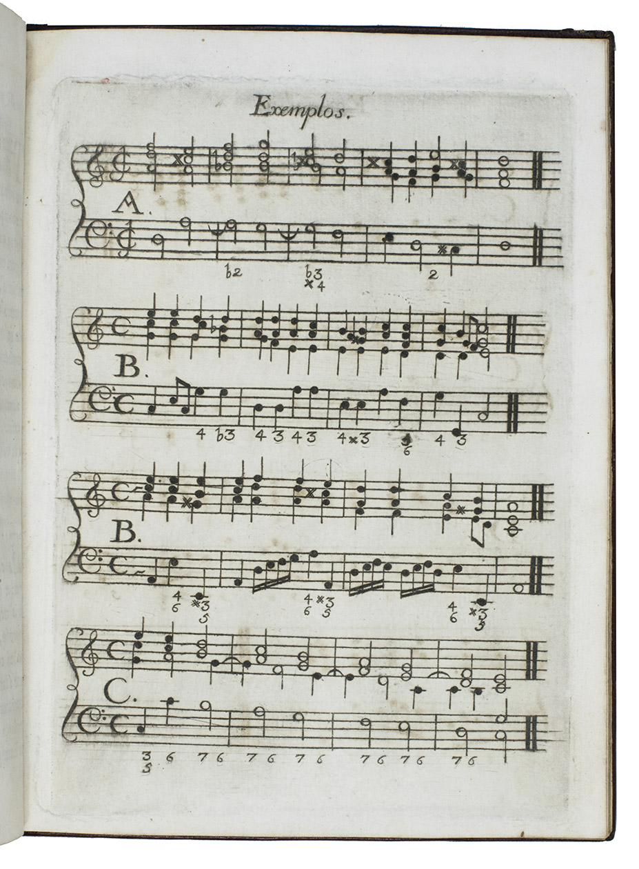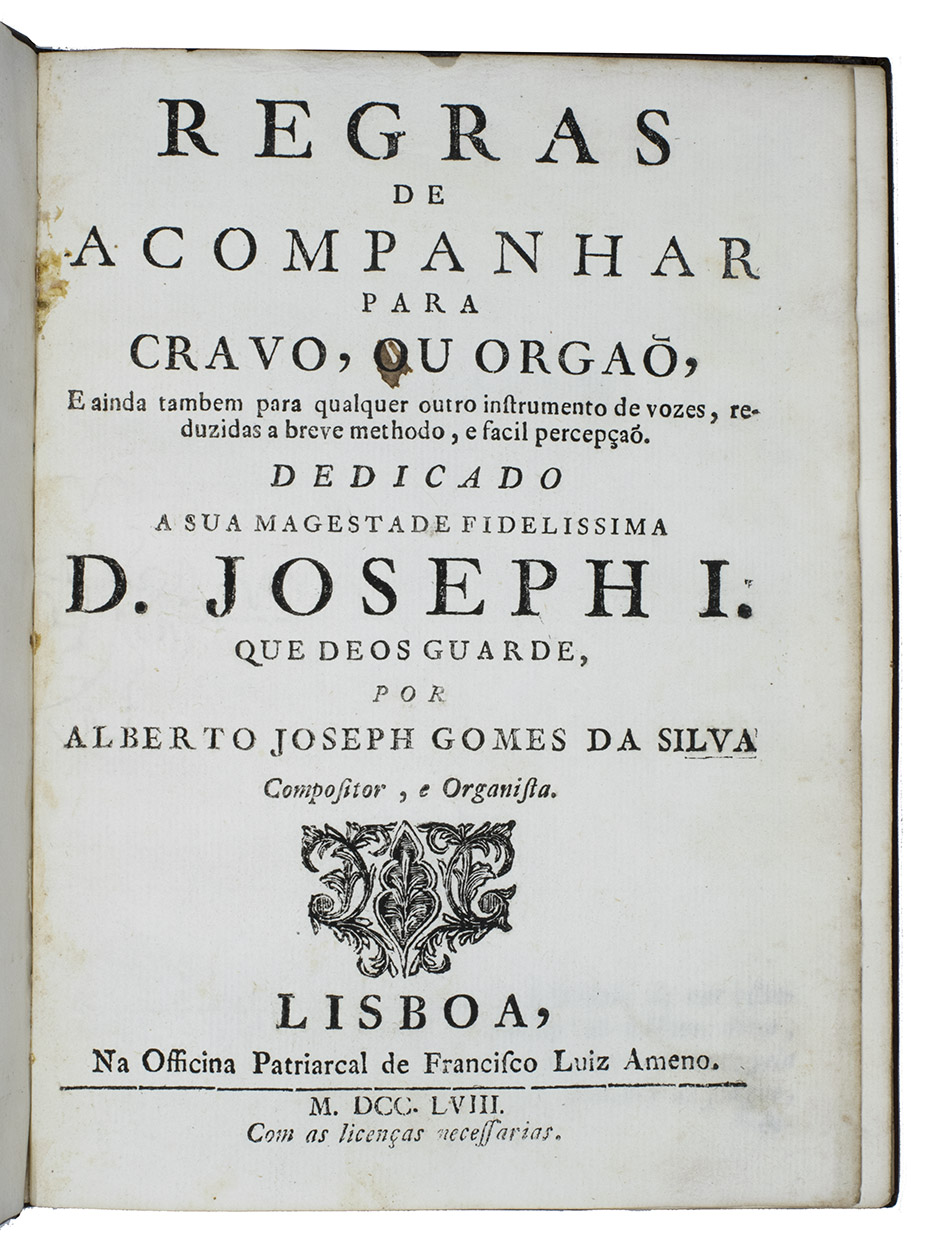 First and only edition of an educational work with rules and a method for accompaniment for harpsichord, organ or other vocal instruments. It was written and composed to be short and easy to understand, for the use of beginners. The illustrations of musical notation were added to clarify the text and to put the theory into practice. Alberto José Gomes da Silva (ca. 1713?-1795) was a Portuguese classical organist and composer. He is known not especially for the present work, published in Lisbon in 1758, but also for several operas, sonatas for piano, and other musical works. One of his operas was staged in a public theatre ("Teatro da Rua dos Condes") in Lisbon in 1775.