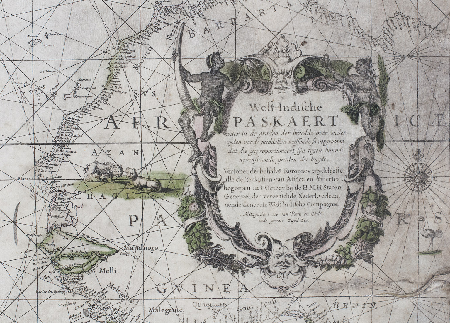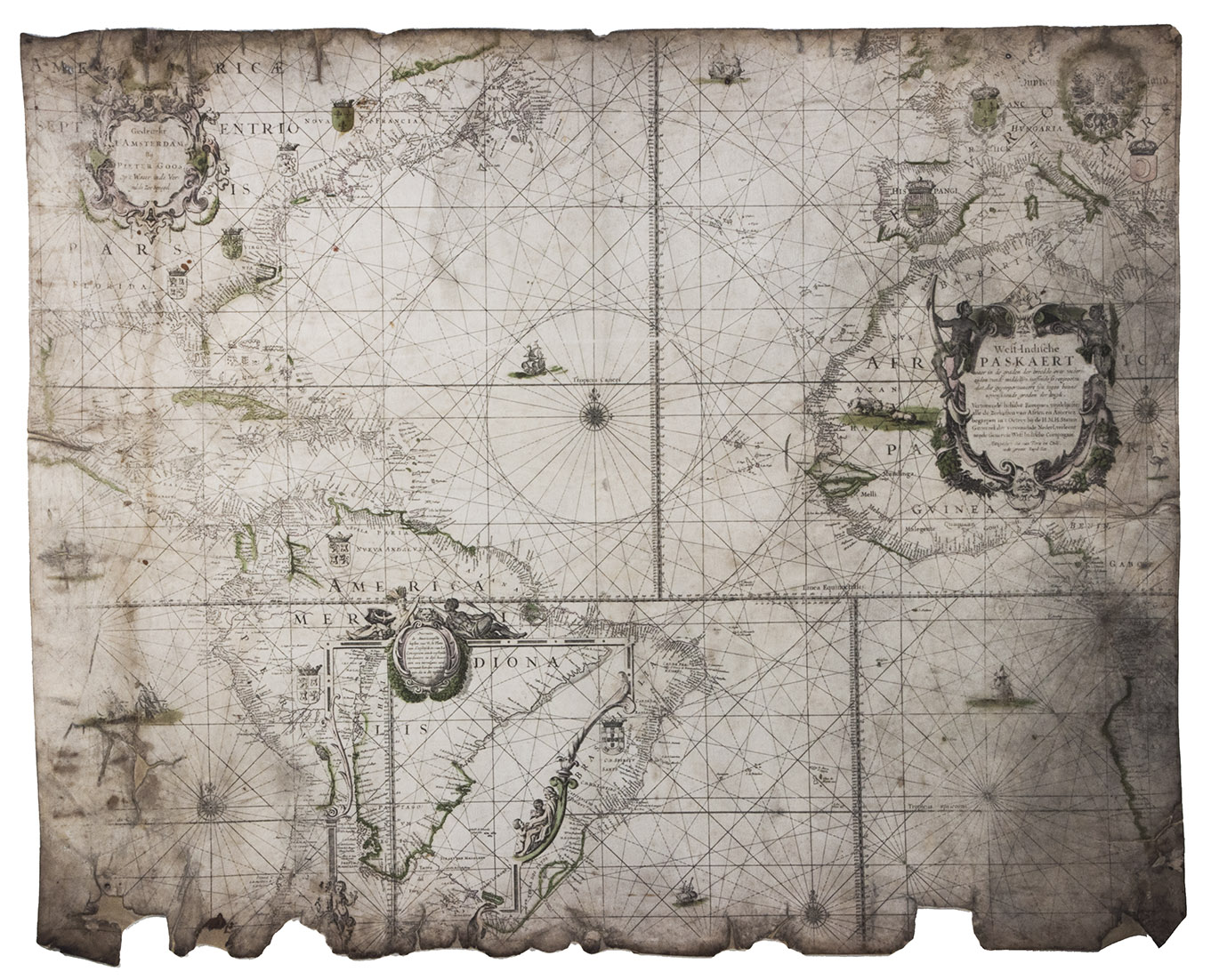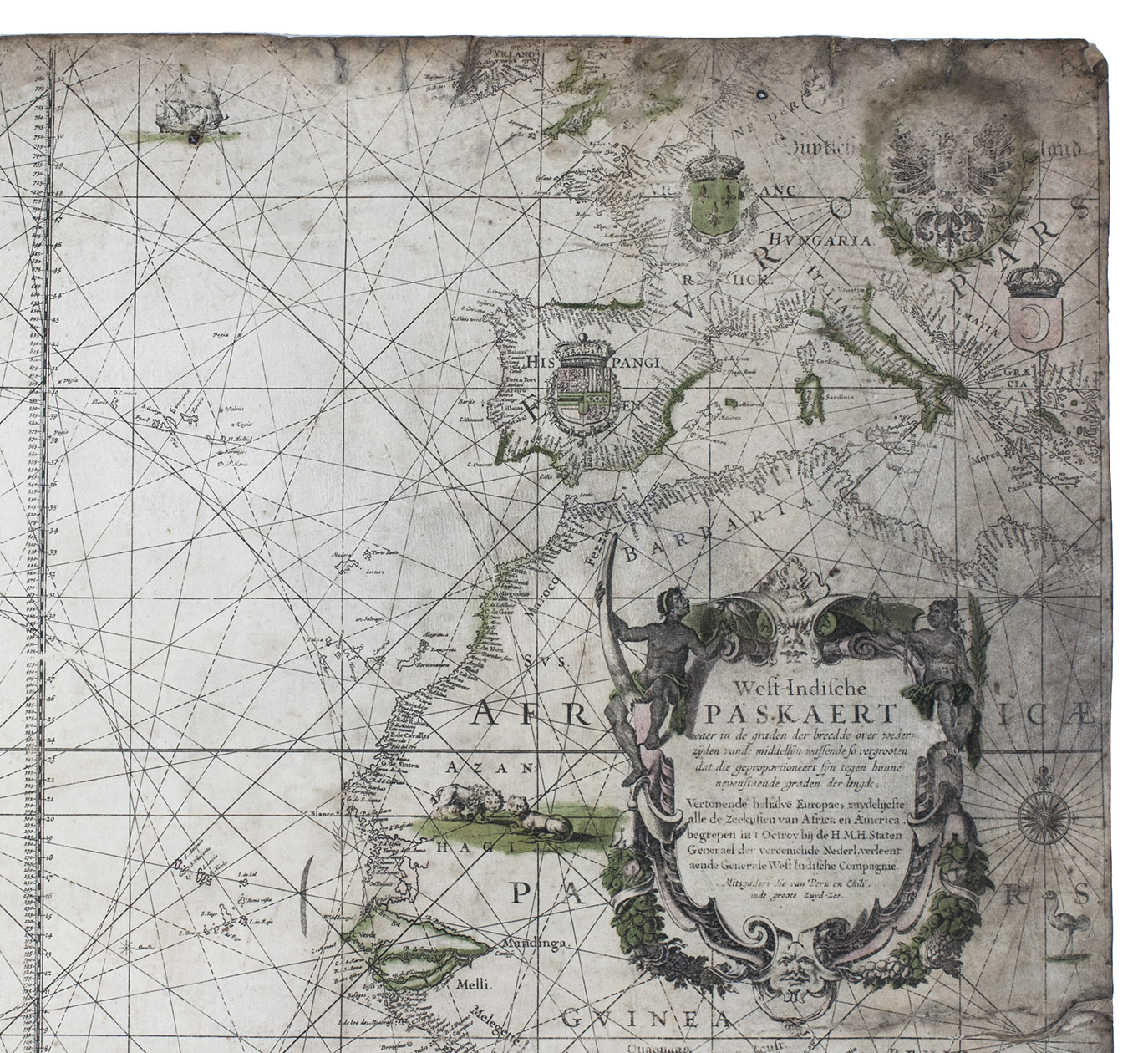 The West-Indische Paskaert engraved by Pieter Goos, in its rare first state, a nautical chart prepared for the Dutch West India Company (WIC) as an aid to crossing the Atlantic Ocean to the trading regions of the Americas and visiting trading posts in Africa. It shows parts of the east coast of North America, both coasts of South America, Mediterranean Europe and the west coast of Africa. Many West-Indische Paskaerten, as these navigational charts were called, were reprinted over and over from new states of the copperplates. For more than a century Dutch and foreign sea farers profited from their use on transatlantic journeys. The great cartographer Willem Jansz. Blaeu (1571-1638) published the first West-Indische Paskaert around 1630 using manuscript charts and other documents of the Atlantic and its coasts, including information provided by the Dutch WIC navigators who sailed these routes. Being one of the first practical uses of the Mercator projection, Blaeu's small-scale nautical chart was the first useful chart for crossing the Atlantic Ocean, making it easier to plot a straight line course for long distances on one map. Around 1660 Pieter Goos engraved four large navigation charts on new copperplates, including the plate for his present West-Indische Paskaert. The present copy shows the plate in its first state, the only copperplate that Goos actually engraved himself.