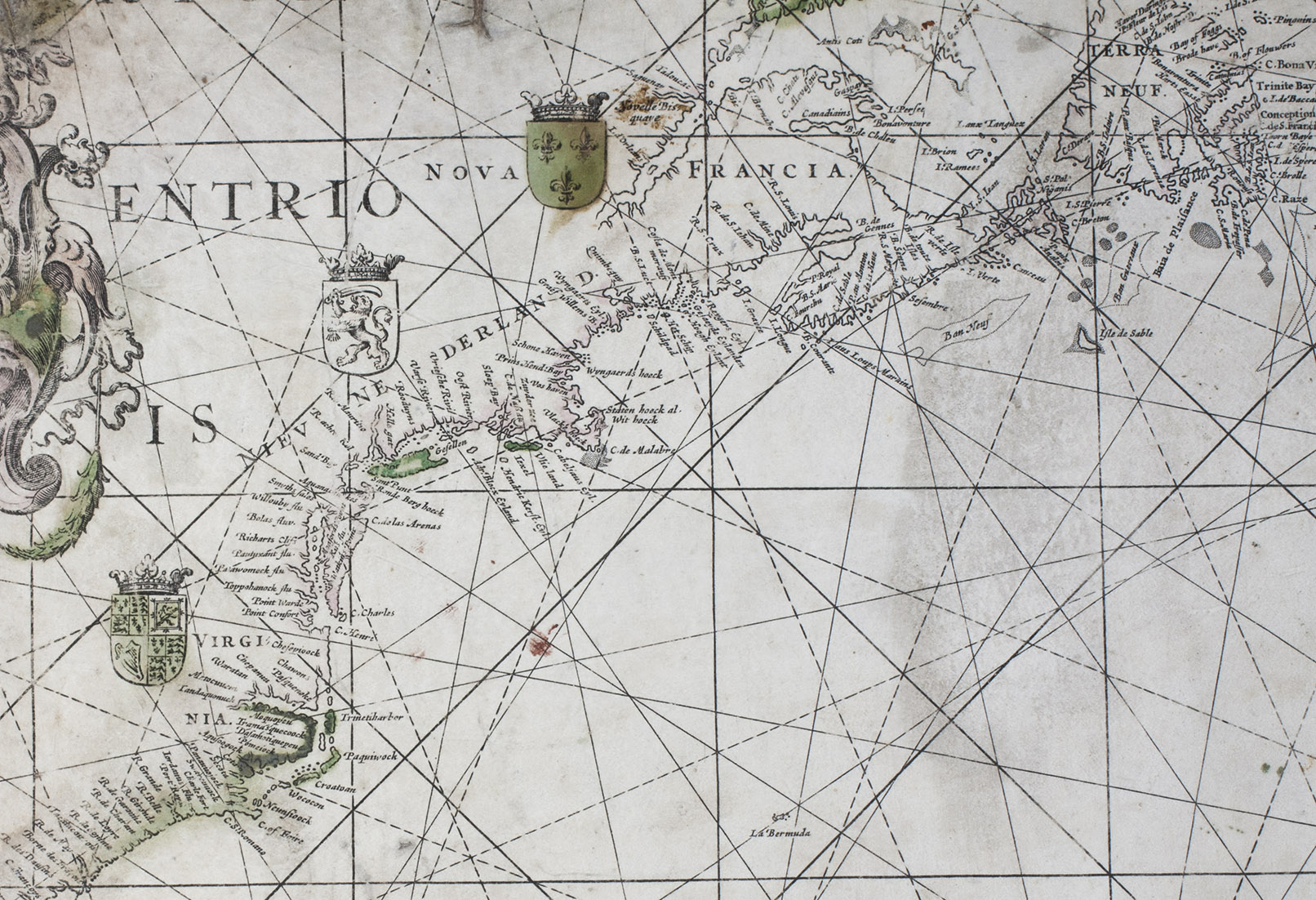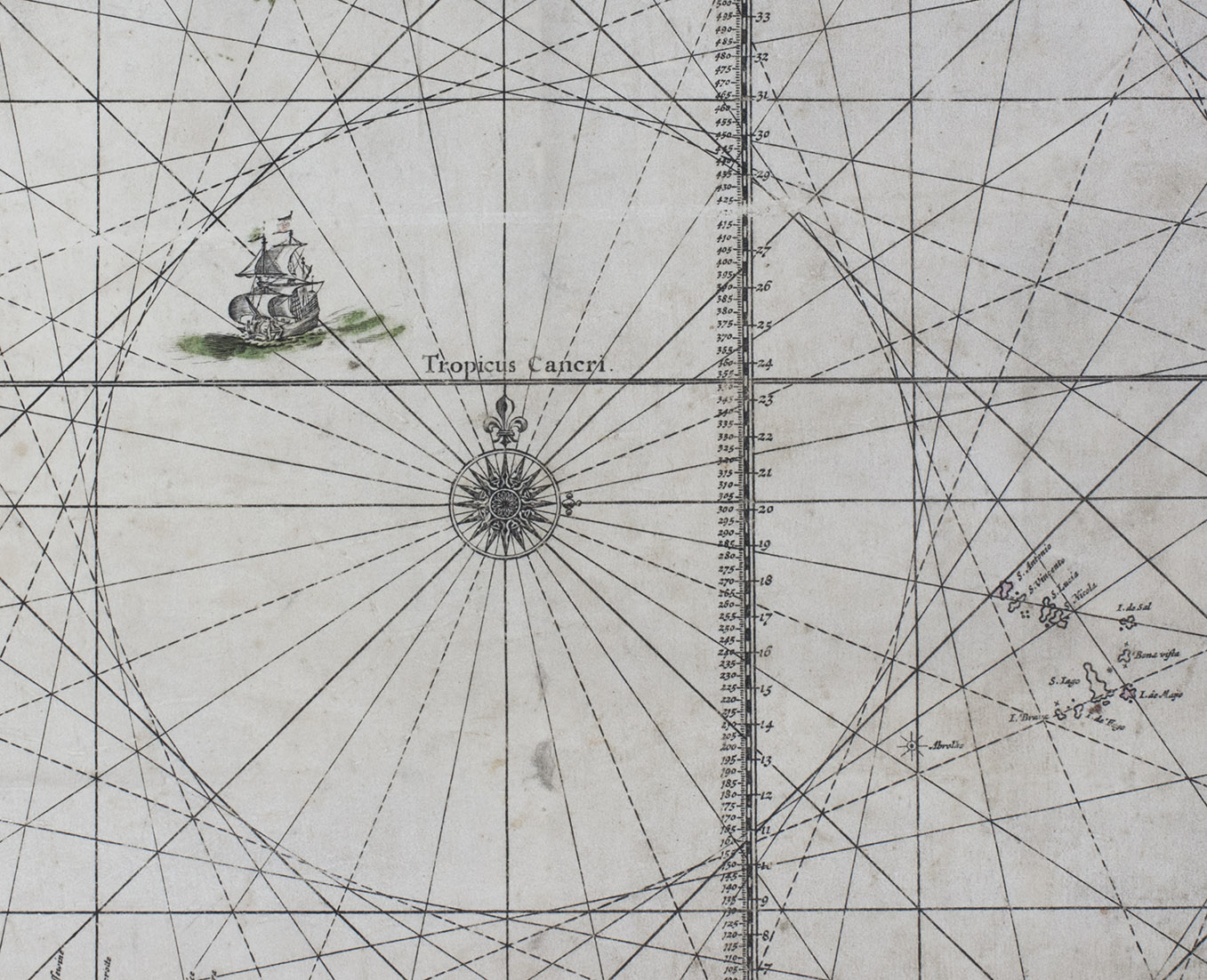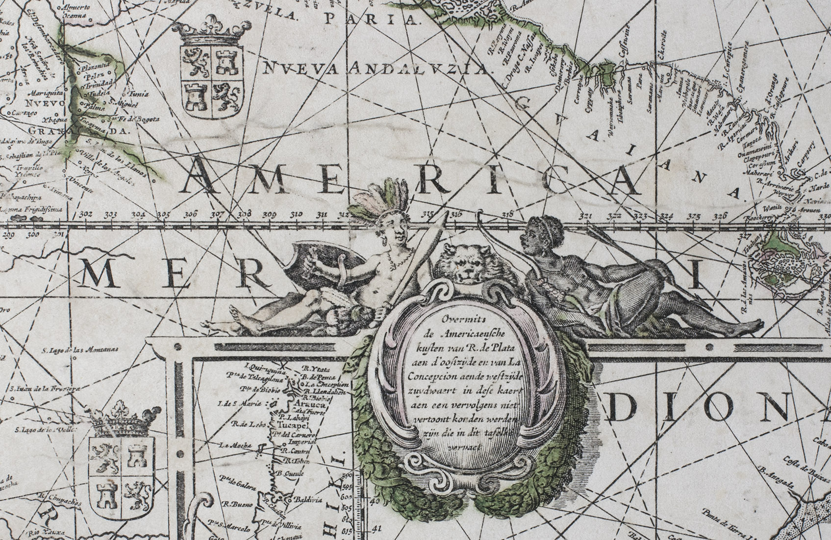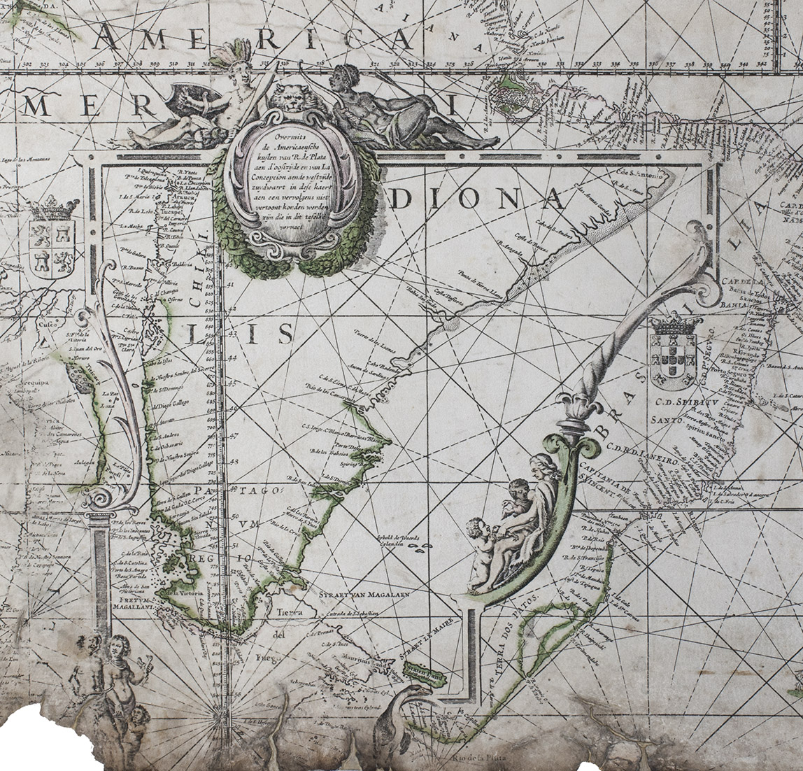 The West-Indische Paskaert engraved by Pieter Goos, in its rare first state, a nautical chart prepared for the Dutch West India Company (WIC) as an aid to crossing the Atlantic Ocean to the trading regions of the Americas and visiting trading posts in Africa. It shows parts of the east coast of North America, both coasts of South America, Mediterranean Europe and the west coast of Africa. Many West-Indische Paskaerten, as these navigational charts were called, were reprinted over and over from new states of the copperplates. For more than a century Dutch and foreign sea farers profited from their use on transatlantic journeys. The great cartographer Willem Jansz. Blaeu (1571-1638) published the first West-Indische Paskaert around 1630 using manuscript charts and other documents of the Atlantic and its coasts, including information provided by the Dutch WIC navigators who sailed these routes. Being one of the first practical uses of the Mercator projection, Blaeu's small-scale nautical chart was the first useful chart for crossing the Atlantic Ocean, making it easier to plot a straight line course for long distances on one map. Around 1660 Pieter Goos engraved four large navigation charts on new copperplates, including the plate for his present West-Indische Paskaert. The present copy shows the plate in its first state, the only copperplate that Goos actually engraved himself.