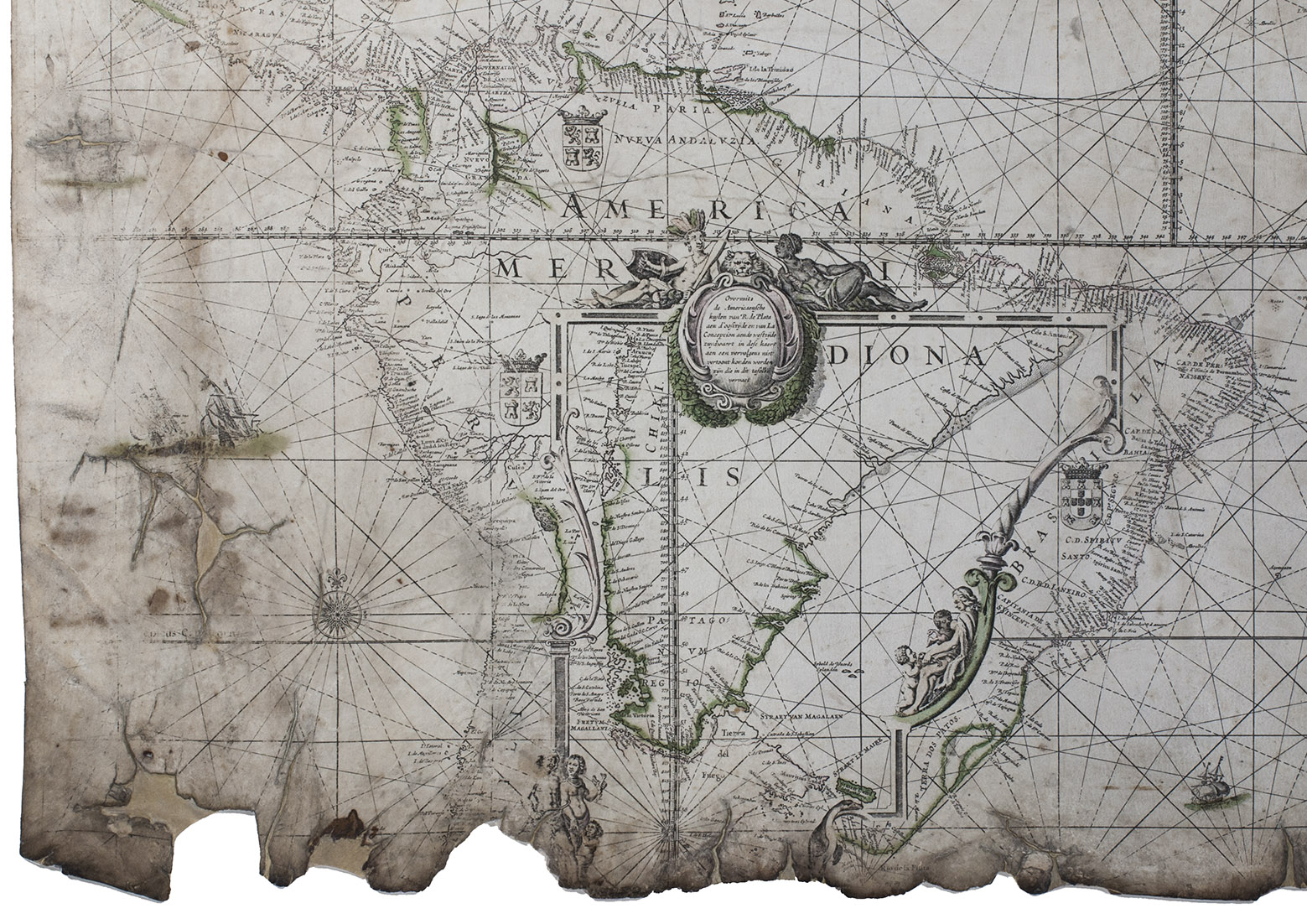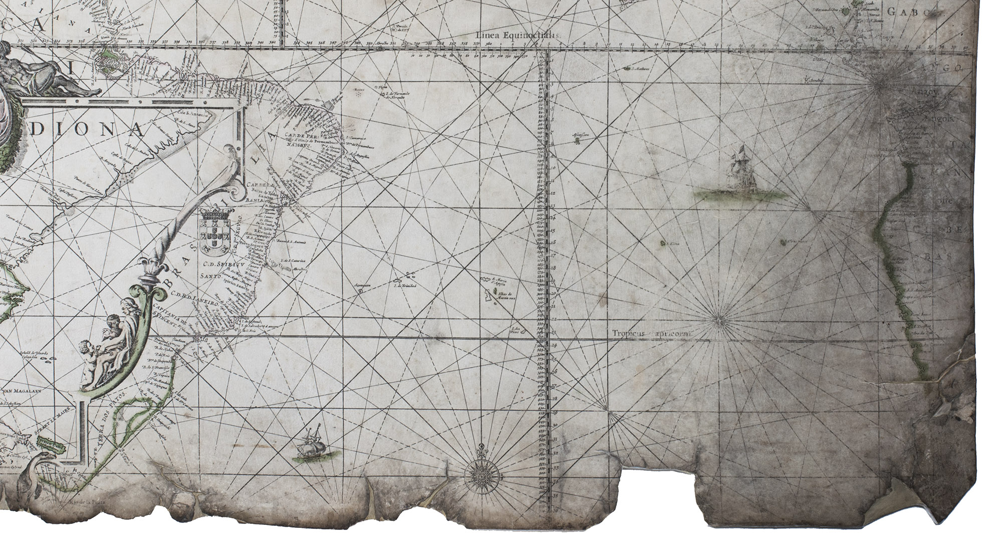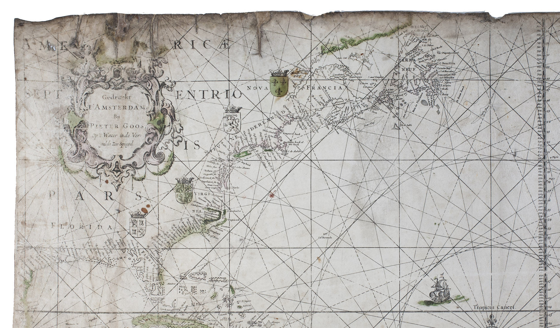 The map has been professionally restored, with the tears along the edges repaired and the brittle parts reinforced with Japanese paper, and the map mounted on museum-quality preservation corrugated board which in turn is mounted on museum-quality honeycomb board. Somewhat faded, with a water stain in the left part, some smaller stains, the foot a little frayed (hardly affecting the map) and a little dust-soiled, but overall in good condition. a very rare state, the first state of the Gooss copperplate nautical chart of the Atlantic in its rare first state and printed on vellum. Burden II, 442 (misdated ca. 1674); Schilder & Kok, Goos 4.1 (8 copies, incl. 2 on paper, 1 missing, 1 incomplete); cf Schilder, Monumenta, 63 (other states), 63.4 (the 1675 Blaeu-Goos state); for the use of nautical charts: Koeman, "17e eeuwse Hollandse bijdragen in de kartering van de Amerikaanse kusten", in: Caert thresoor 1 (1982), pp. 50-51; Schilder & Van Egmond, "Maritime cartography in the Low Countries during the Renaissance", in: The history of cartography, volume 3: cartography in the European Renaissance (2007), pp. 1425-1426.