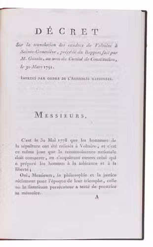 Décret sur la translation des cendres de Voltaire à Sainte-Geneviève, précédé du Rapport fait par M. Gossin, au nom du Comité de Constitution, le 30 Mars 1791.