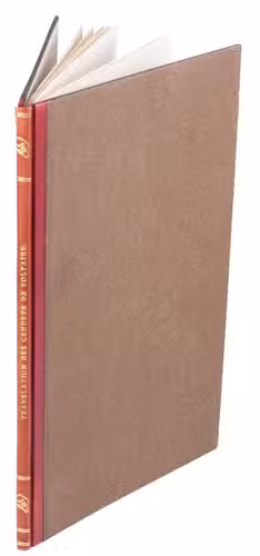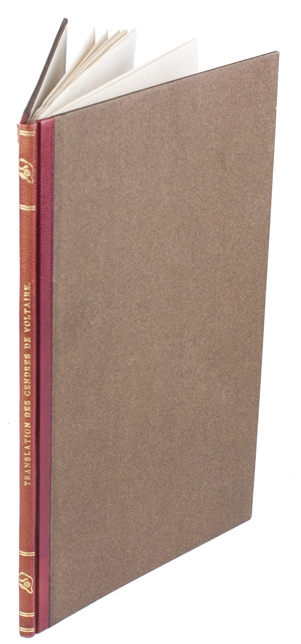 Finely bound in a simple and elegant style for and with the bookplate of Jankarel Gevers (1944-1998). In very good condition, with only some reinforcing in the fold and some very faint marginal stains, not approaching the text. The binding fine. A fascinating document of Voltaire's symbolic role in the French Revolution. De Baecque, Glory and terror (2001; French ed. 1997), pp. 40-52; WorldCat (5 copies); not in Sudoc.