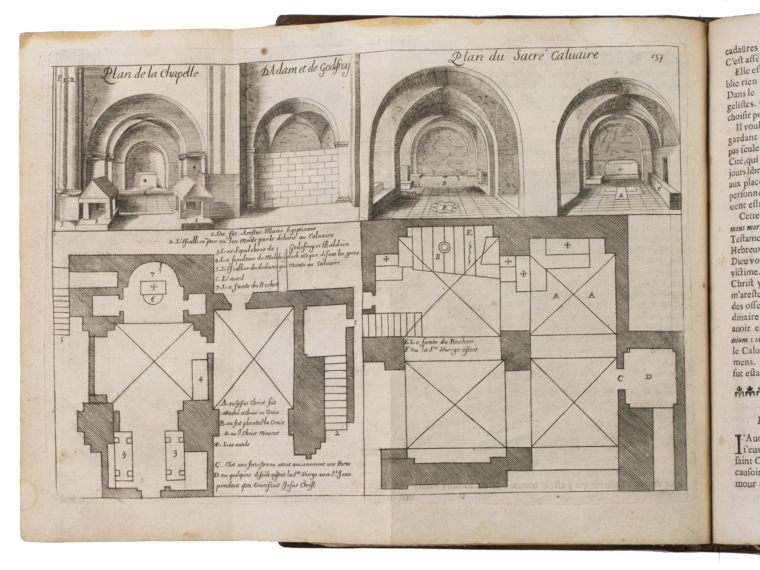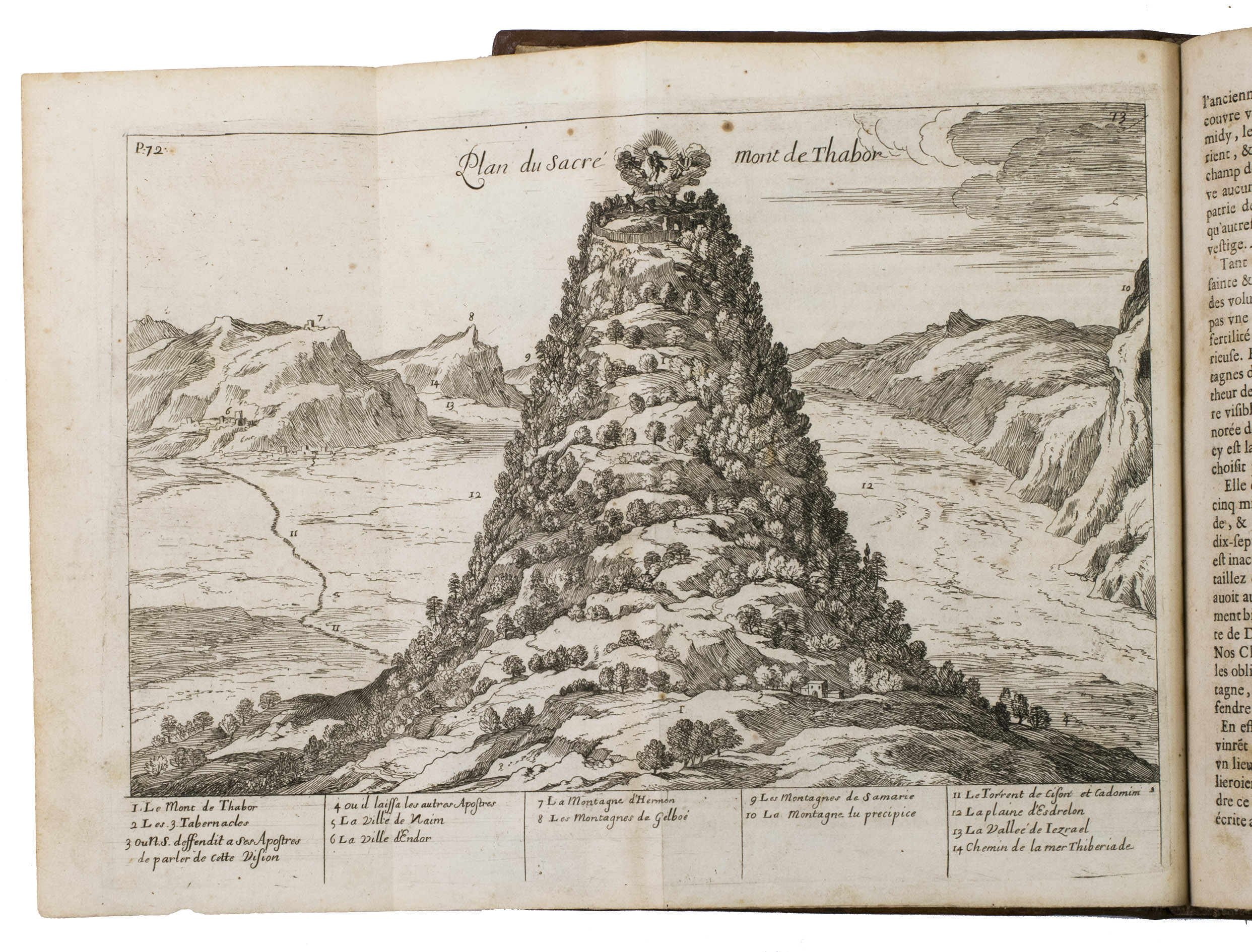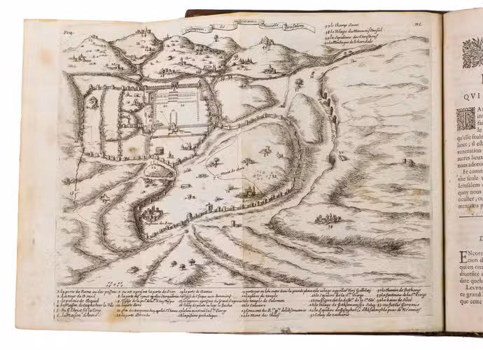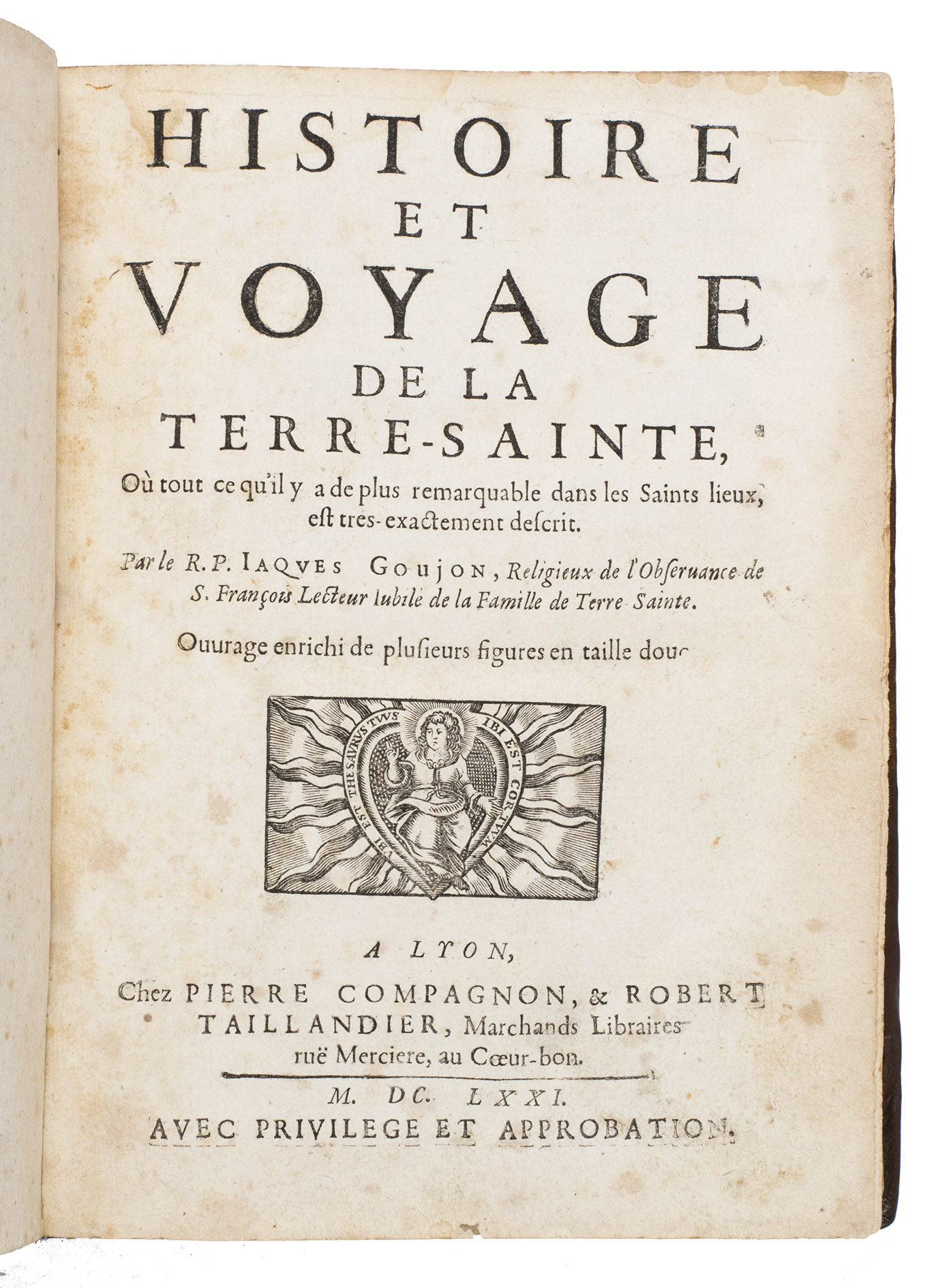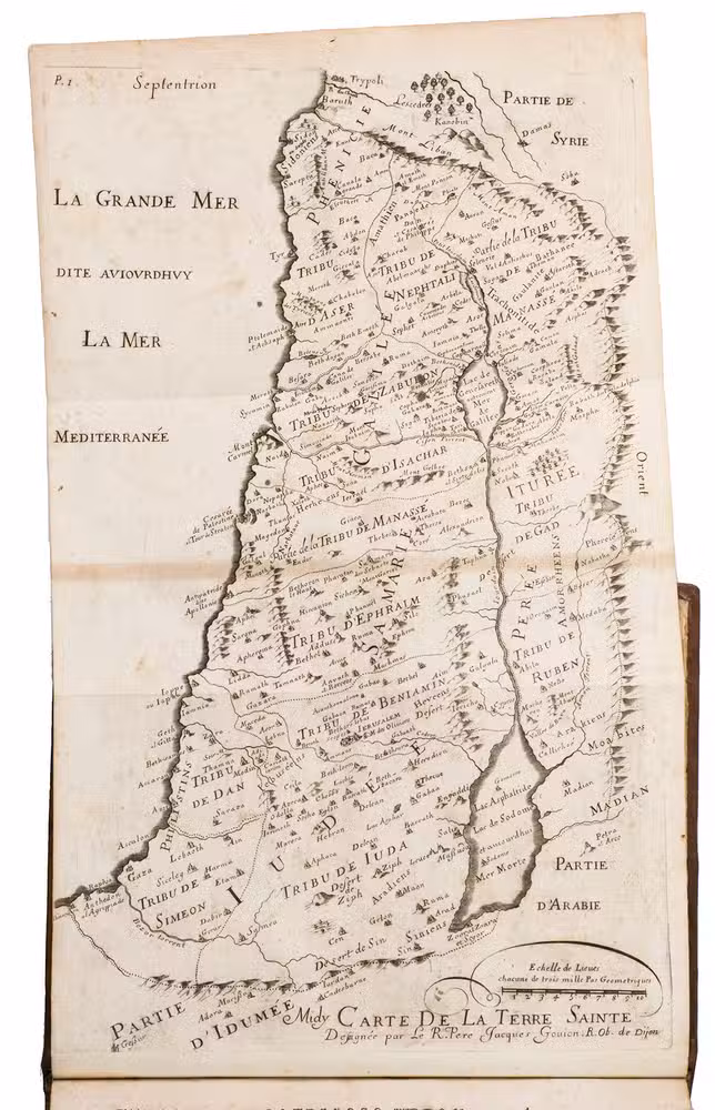 Lyon, Pierre Compagnon & Robert Taillandier, 1671. 4to. With a woodcut vignette on the title-page and 17 folding engraved plates showing maps, views, and plans of regions, mountains and buildings in the Holy Land, further with woodcut decorated initials, and woodcut head- and tailpieces. Contemporary calf. [1], [1 blank], [10], 358, [9], [1 blank] pp.