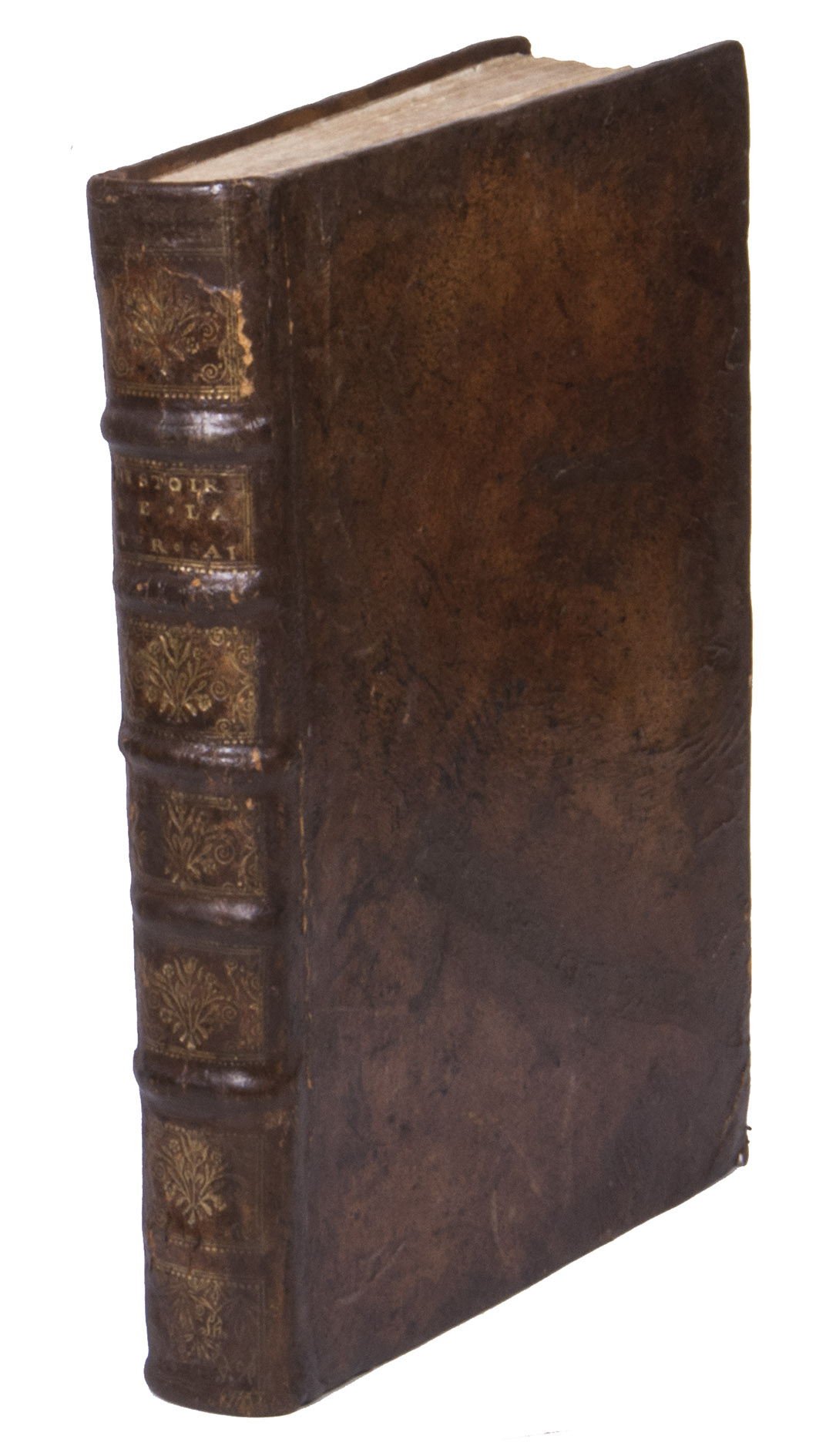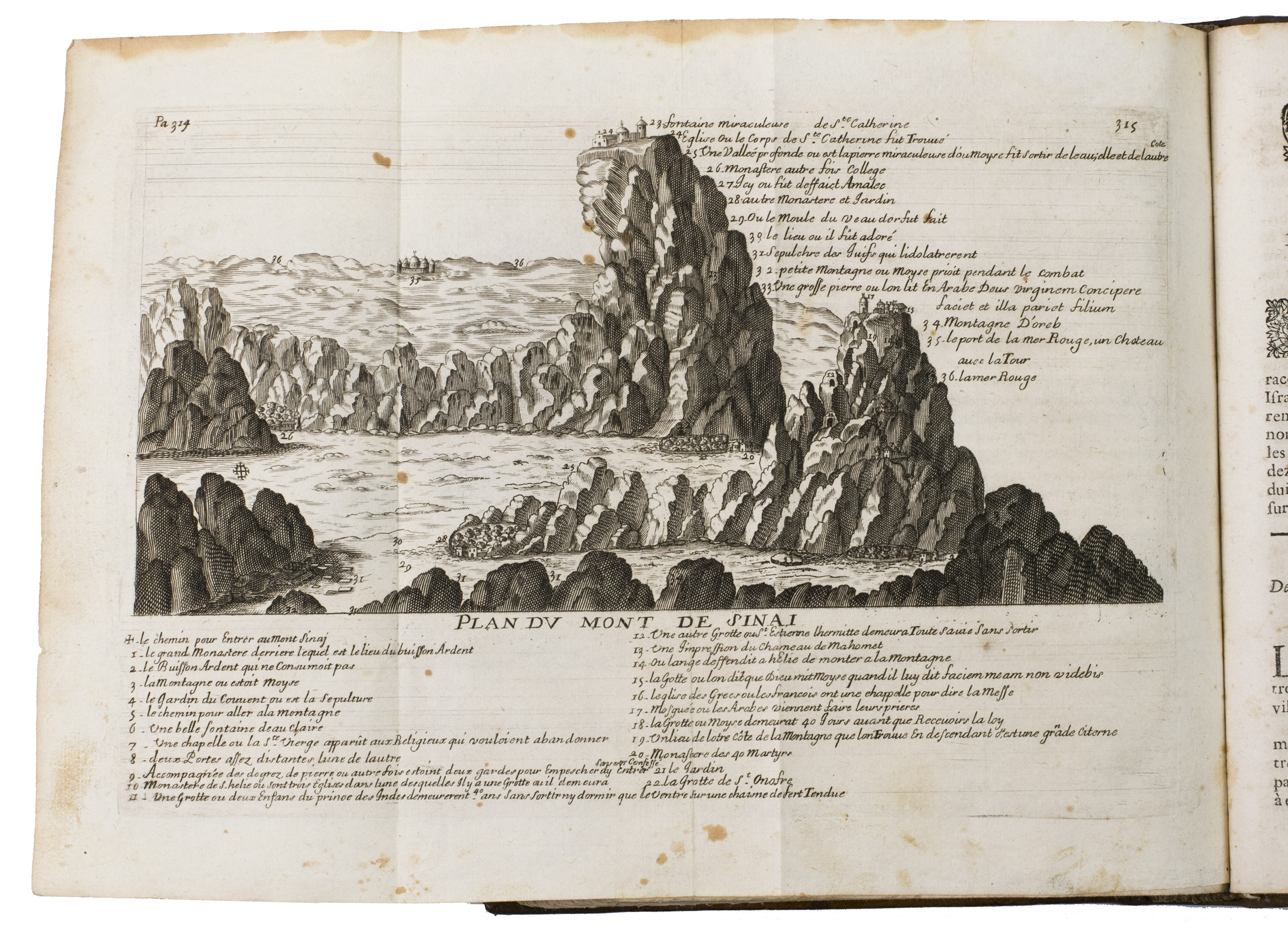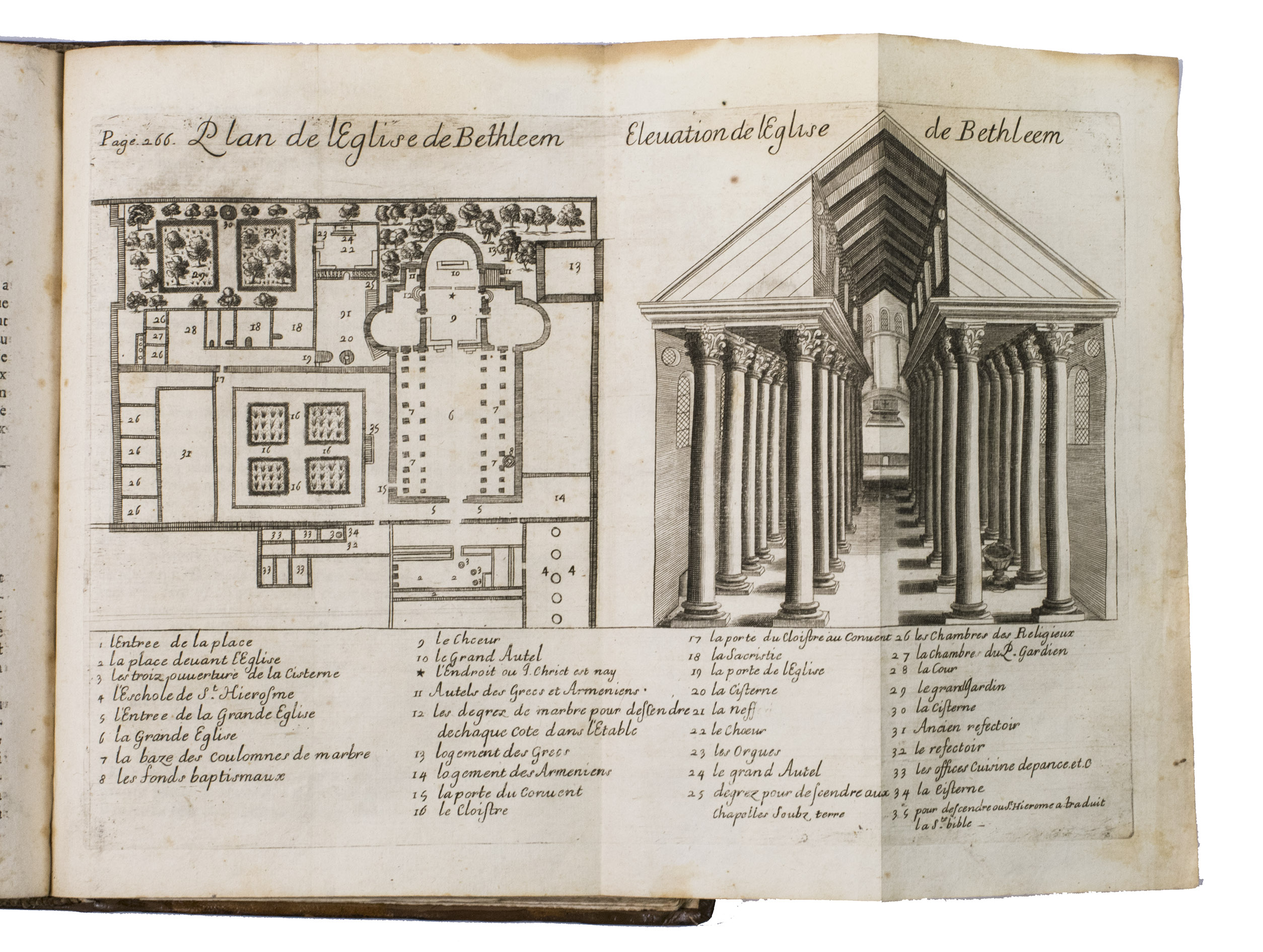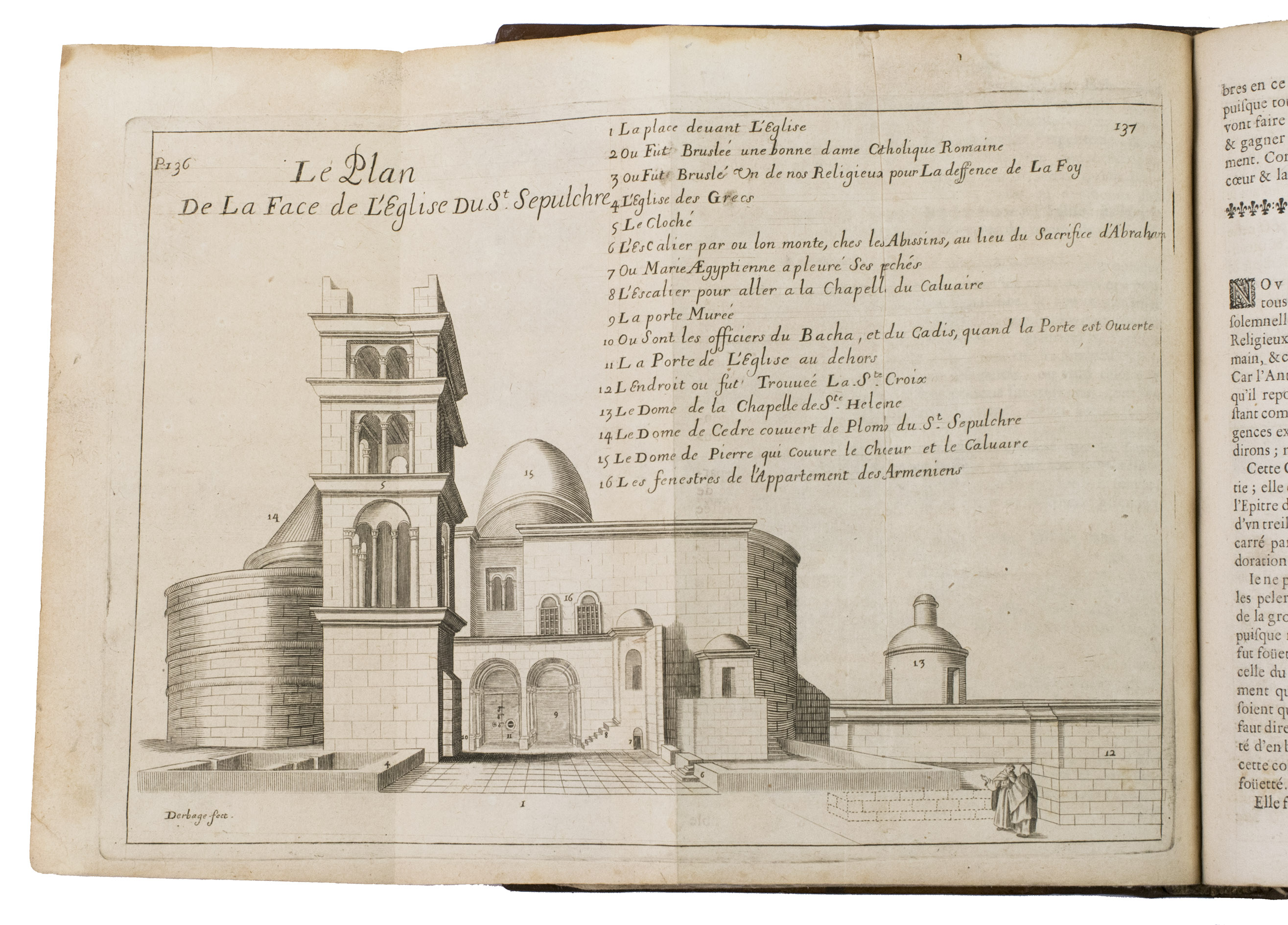 Lyon, Pierre Compagnon & Robert Taillandier, 1671. 4to. With a woodcut vignette on the title-page and 17 folding engraved plates showing maps, views, and plans of regions, mountains and buildings in the Holy Land, further with woodcut decorated initials, and woodcut head- and tailpieces. Contemporary calf. [1], [1 blank], [10], 358, [9], [1 blank] pp.
