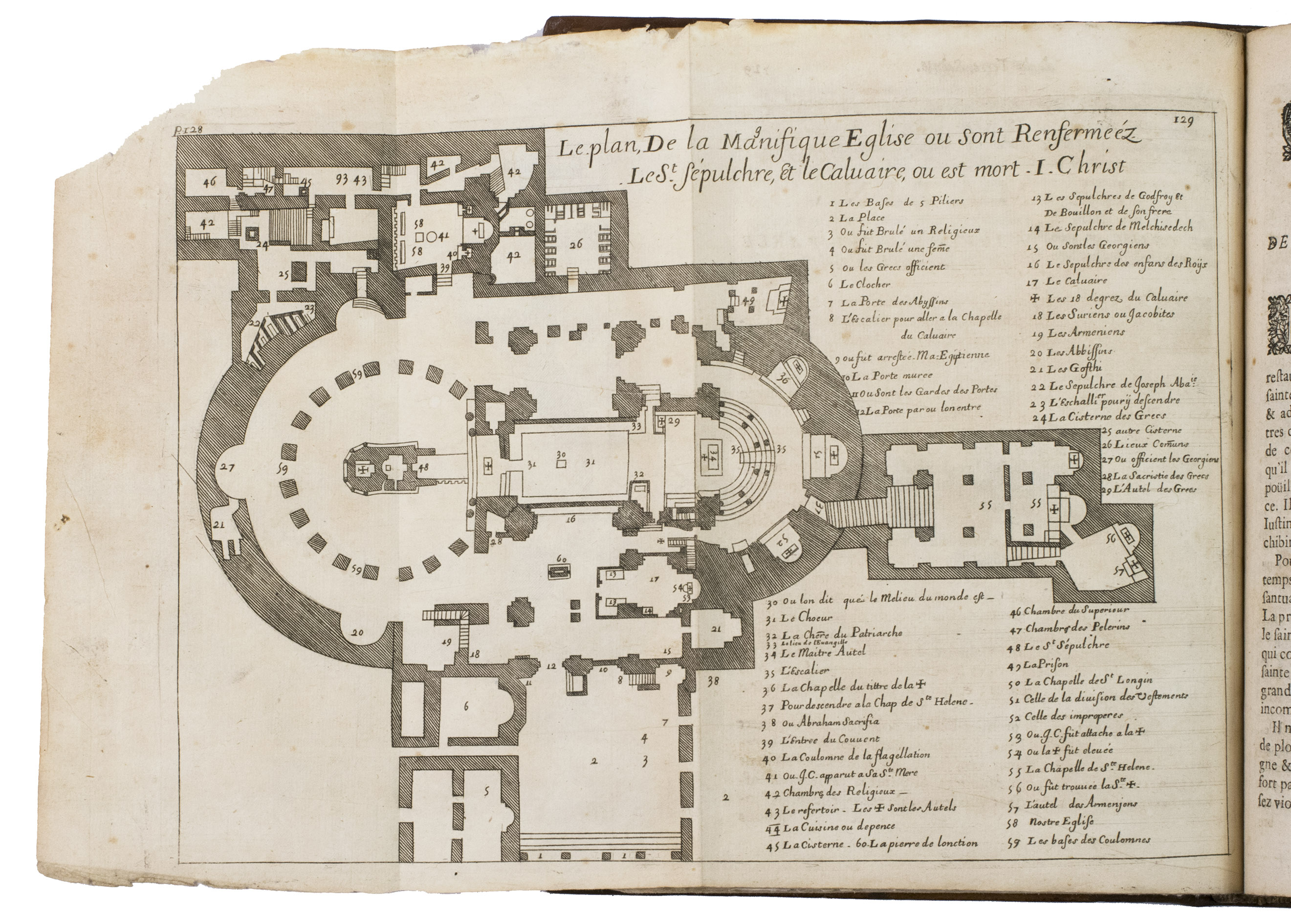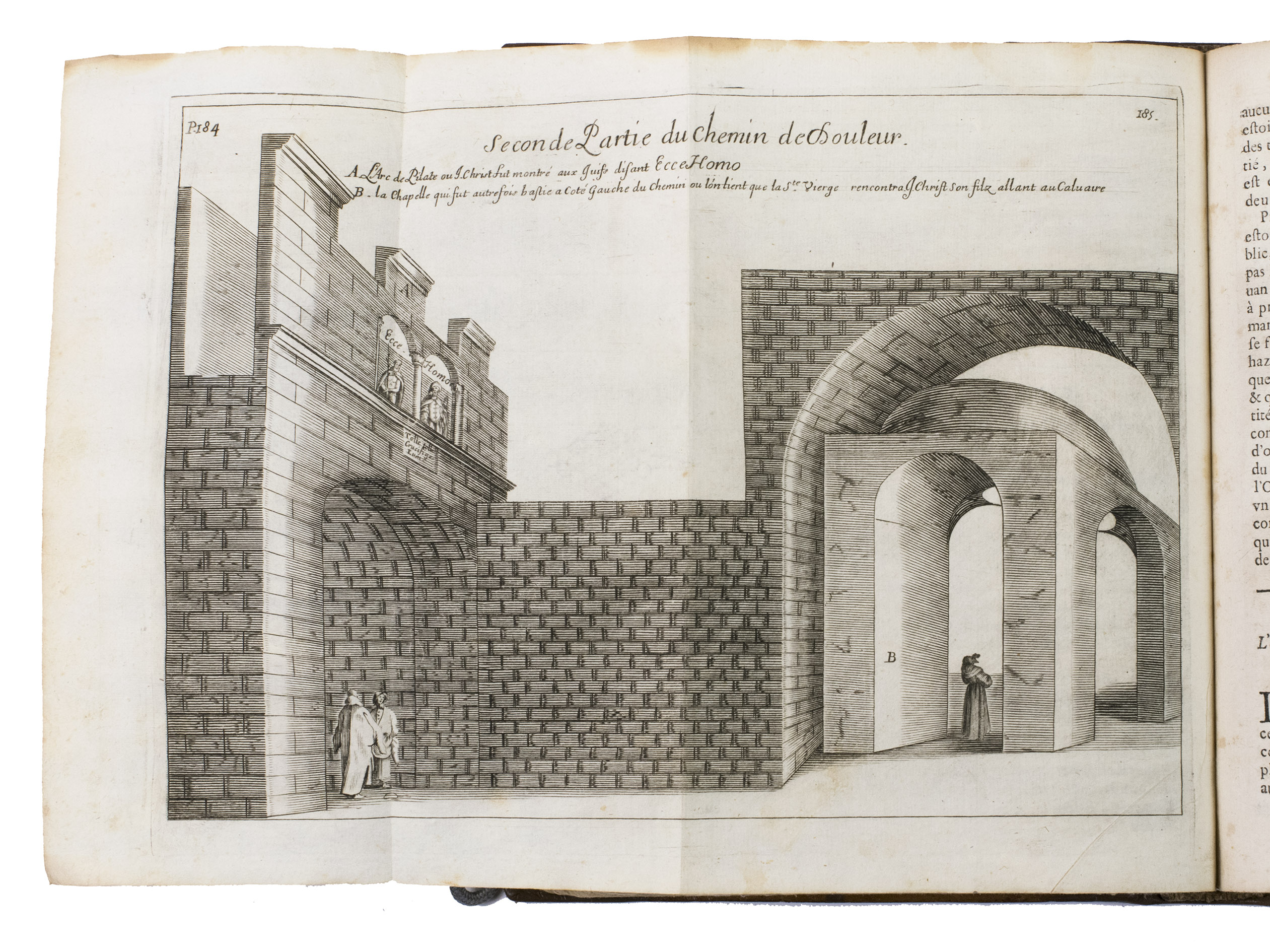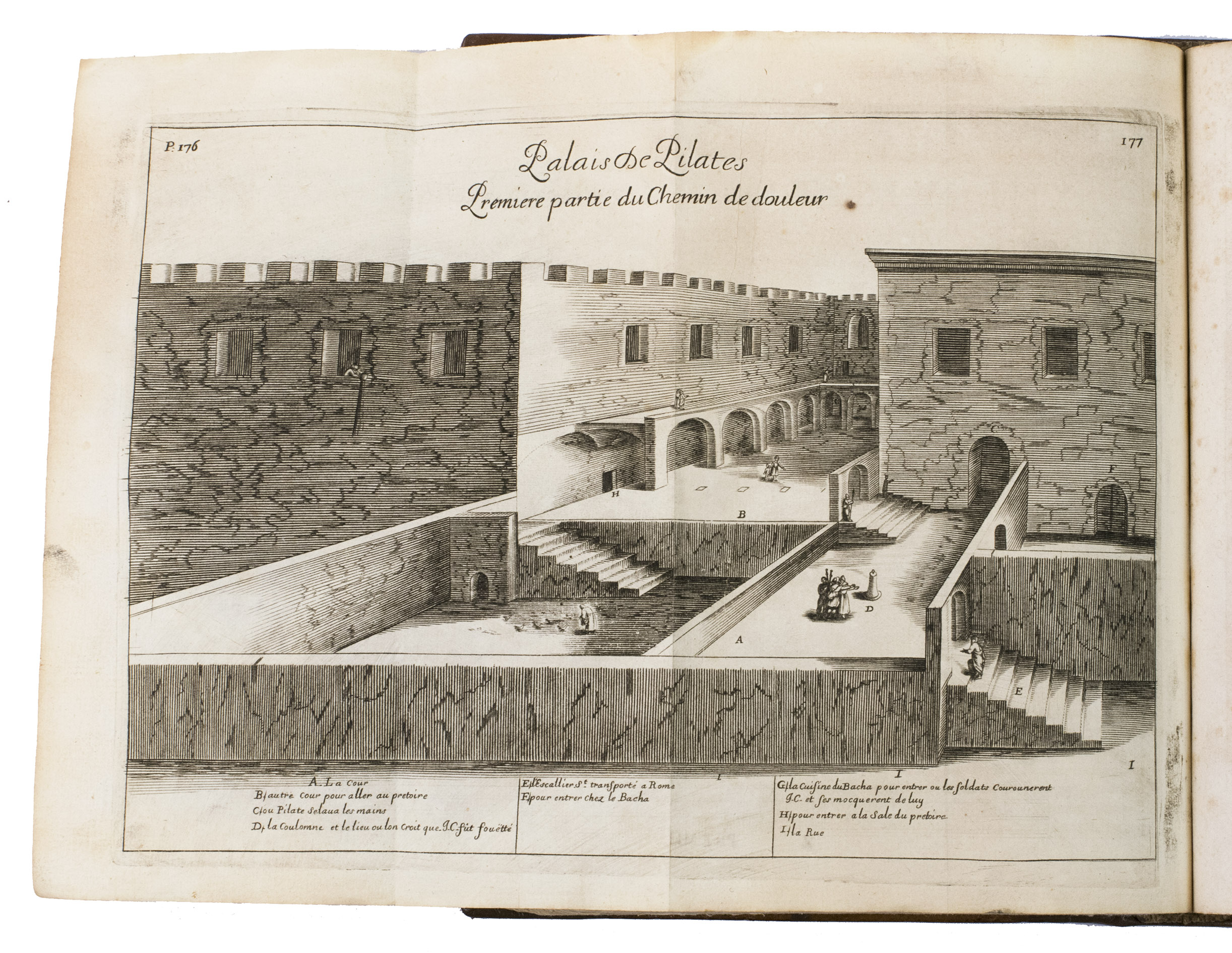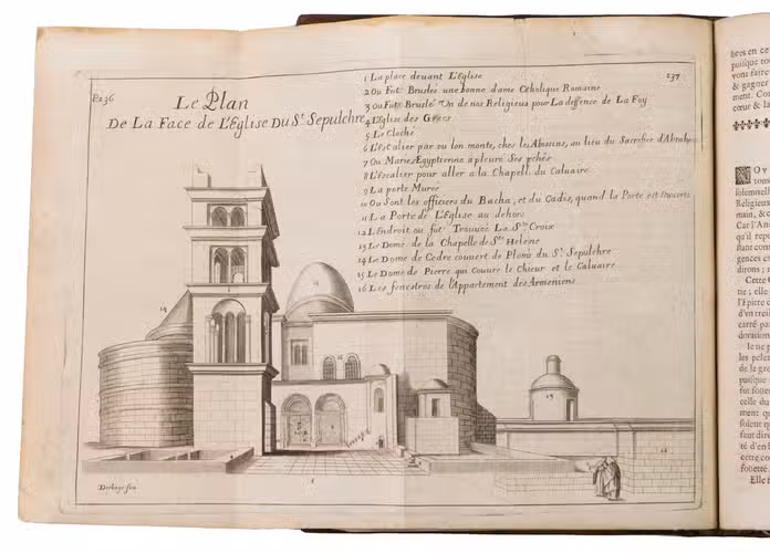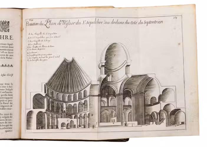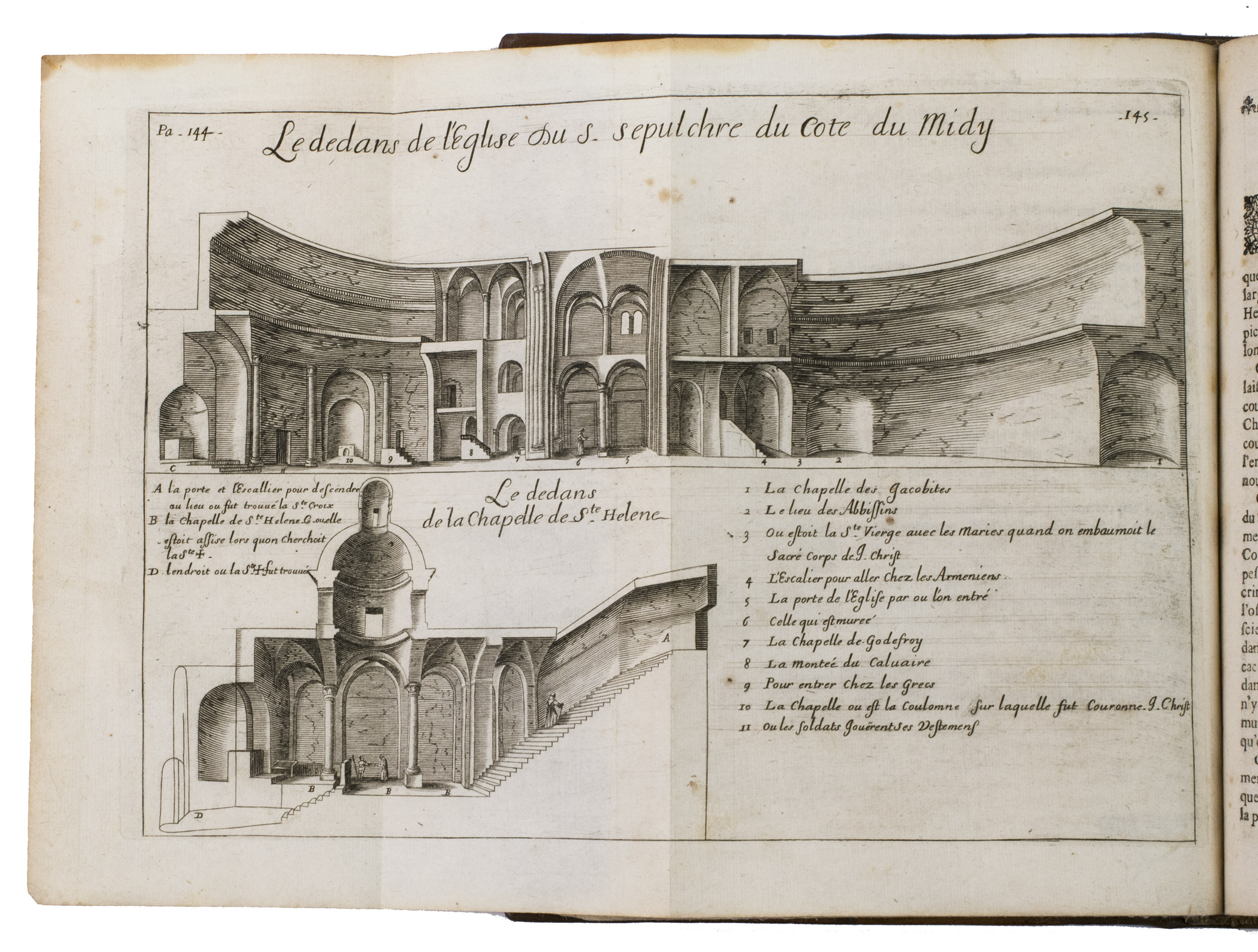 Rare, nicely illustrated second edition of a work containing extensive information about and documentation on sacred places in the Holy Land, by Jacques Goujon. Goujon (1621-1693), a Franciscan born in Dijon, was initially a fur trader, but took part in a crusade to the Holy Land in 1636. In 1666, he returned there and stayed for a while in Jerusalem. On his way back he was shipwrecked and finally came ashore in Marseille, where he finished the present work. The work contains 17 detailed folding engravings, including a map of the Holy Land before page 1. Also included are engraving of Mount Thabor, Mount Sinaï, Old and New Jerusalem, all with a legend detailing the points of interest on and around the mountains and city. 4 other plates depict four parts of the road to Calvary taken by Christ, starting with the palace of Pilatus, followed by an illustration of the arch of Pilatus where the Jews chanted "Ecce Homo", an illustration of part of the route to Calvary (or Golgotha) - for example showing the house of Lazarus - and a fourth plan giving an overview of the city walls with the arch through which Christ marched to Golgotha, the temple of Salomon, the Mount of Olives and other significant religious places around Jerusalem. The remainder of 9 plates all give plans of buildings, like churches, in for example Jerusalem and Bethlehem.