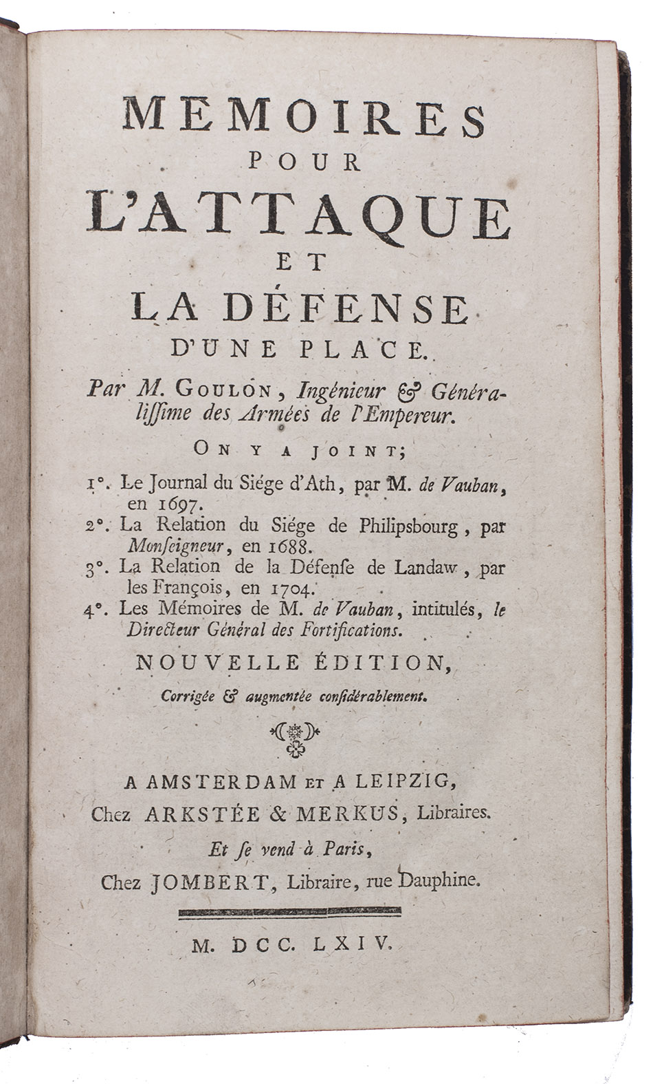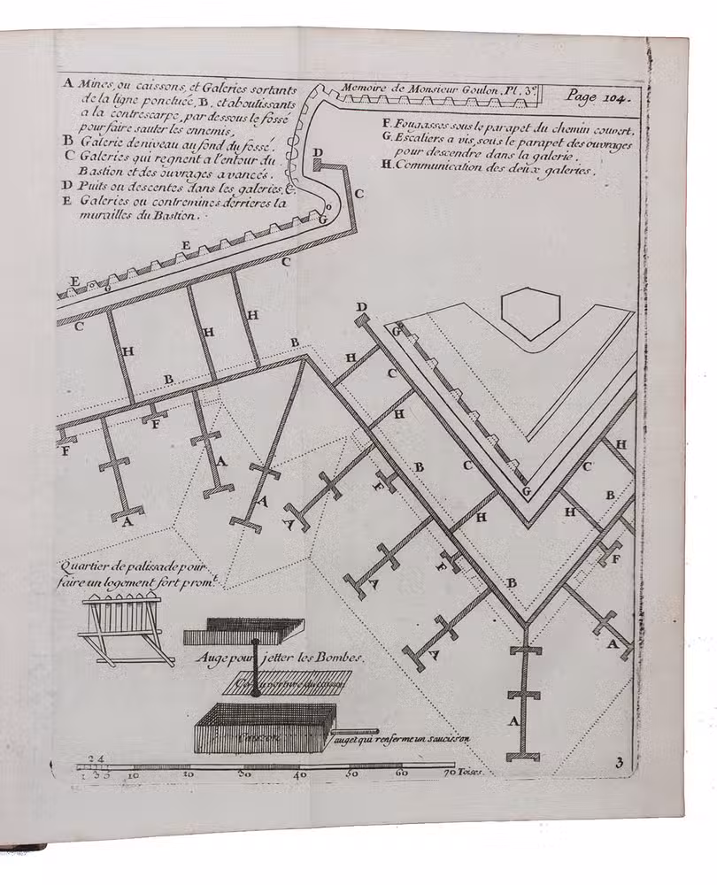 Very rare fourth(?) edition of a collection of treatises on fortification and siege craft, especially related to military mining, first published together in 1730. The main part consists of a treatise written by the Huguenot Charles Goulon (1645-1705). He had been one of Vauban's most talented officers and the chief of his miners. After the revocation of the Edict of Nantes he joined the Dutch army and subsequently, in 1693, the Imperial army. Goulon considered attack and defence as inseparable and in his treatise all examples are presented from the viewpoints of both the attacker and the defender. As a pupil of Vauban and a veteran of the Siege of Candia, the longest siege in history, Goulon was considered an authority by his contemporaries. Among the other treatises are two ascribed to Vauban. The one relating to the Siege of Ath (1697) is one of "the most important published sources" on this "epitome of Louisquatorzian siegecraft" (Ostwald).