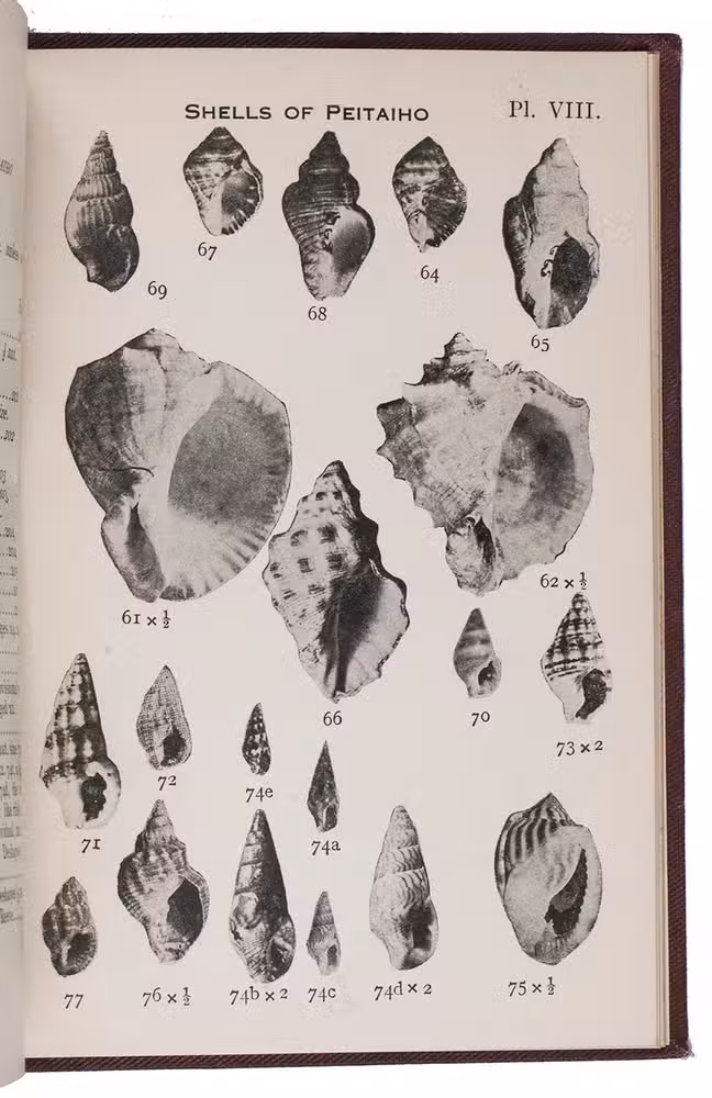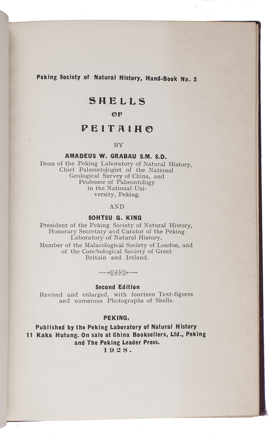 Revised and enlarged second edition of a work on the shells of Peitaiho (Beidaihe), a district in China near the Bohai sea, by the German-American geologist Amadeus William Grabau (1870-1946), often called the father of Chinese geology, and Sohtsu G. King (or Shao-chi Chin, b. 1886), president of the Peking Society of Natural History. It presents itself as a field guide, giving an introduction to classification, a description of the beach of Beidaihe, and methods of cleaning shells. Other chapters describe how and where to find the more common pelecypod and gastropod shells. The last two chapters contain systematic descriptions of these shells, the majority of which are also shown on the plates.