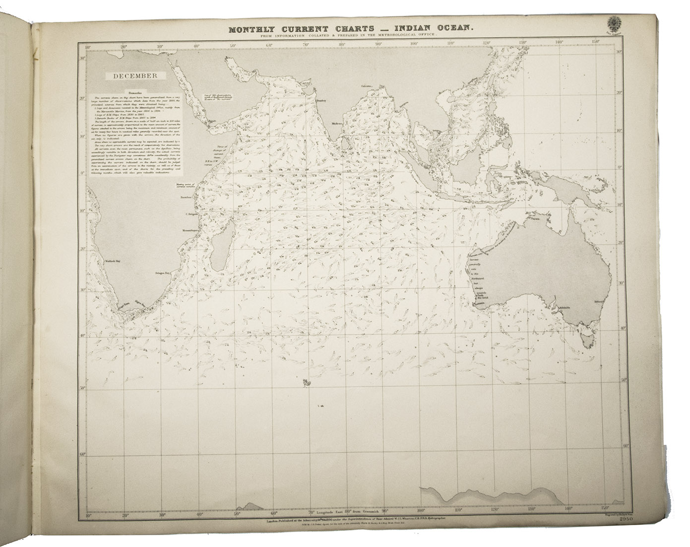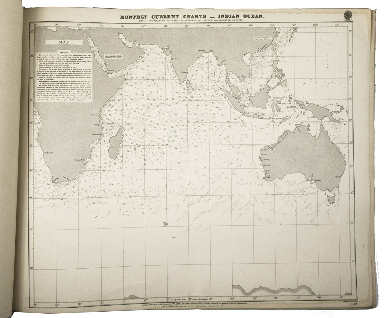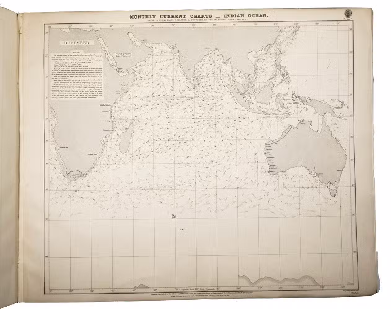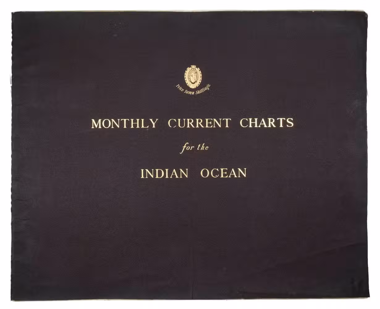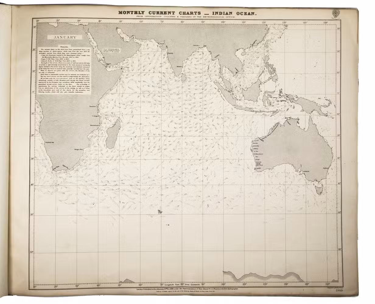 Rare maritime atlas with 12 charts of the Indian Ocean that provide information on currents for each month of the year. The data was gathered from a great number of sources going back to the year 1830. Each chart covers the same area, from Cape Town to Sydney and including the Arabian peninsula, India and China. The currents and explanatory remarks very per chart depending on the meteorological circumstances, such as seasons and monsoons. The twelve charts form part of a long series by the Great Britain Meteorological Office publications, numbered 2939-2950. With an 1896 "Advertisement" by the Admiralty tipped in on the front paste-down, providing a lengthy explanation for the charts.