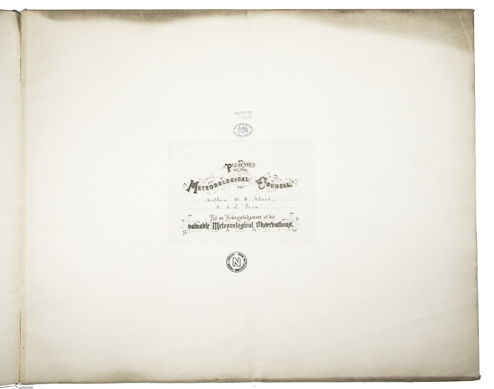 From the library of the British Natural of History Museum, with 3 cancelled library stamps and a large lithographed presentation bookplate with name in manuscript: "Captain W.H. Milner, R.M.S. 'Para'", all neatly on the first blank page. Corners slightly curled, vertical fold in the front cover. Some discolouring at the head of the first blank page. Otherwise in good condition. "New Maps", in: The geographical journal 8, no. 2 (August 1896), pp. 197-200.
