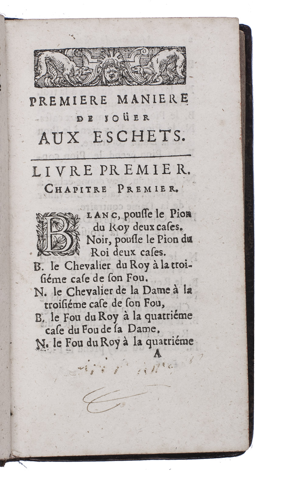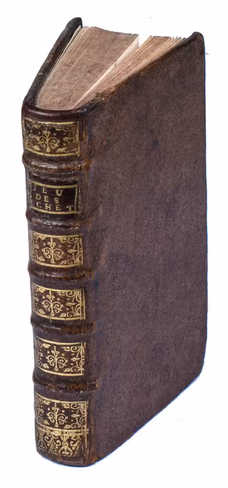Late edition of the French translation of one of the most famous early chess books, originally written in Italian and first presented in manuscript by the author, the famous Calabrian chess player Giocchino Greco (ca. 1600-1635) to the King of Naples in 1619. At first only manuscript transcriptions were made. The first French edition appeared in 1669, after the first English edition of 1656. After a short explanation of the general principles of the game of chess, it teaches chess players by presenting chess games and problems only, often with a possible defense added as well. The book is divided into two parts, the first with 39 games, extensively recorded, and the second part with 55 more advanced chess problems.