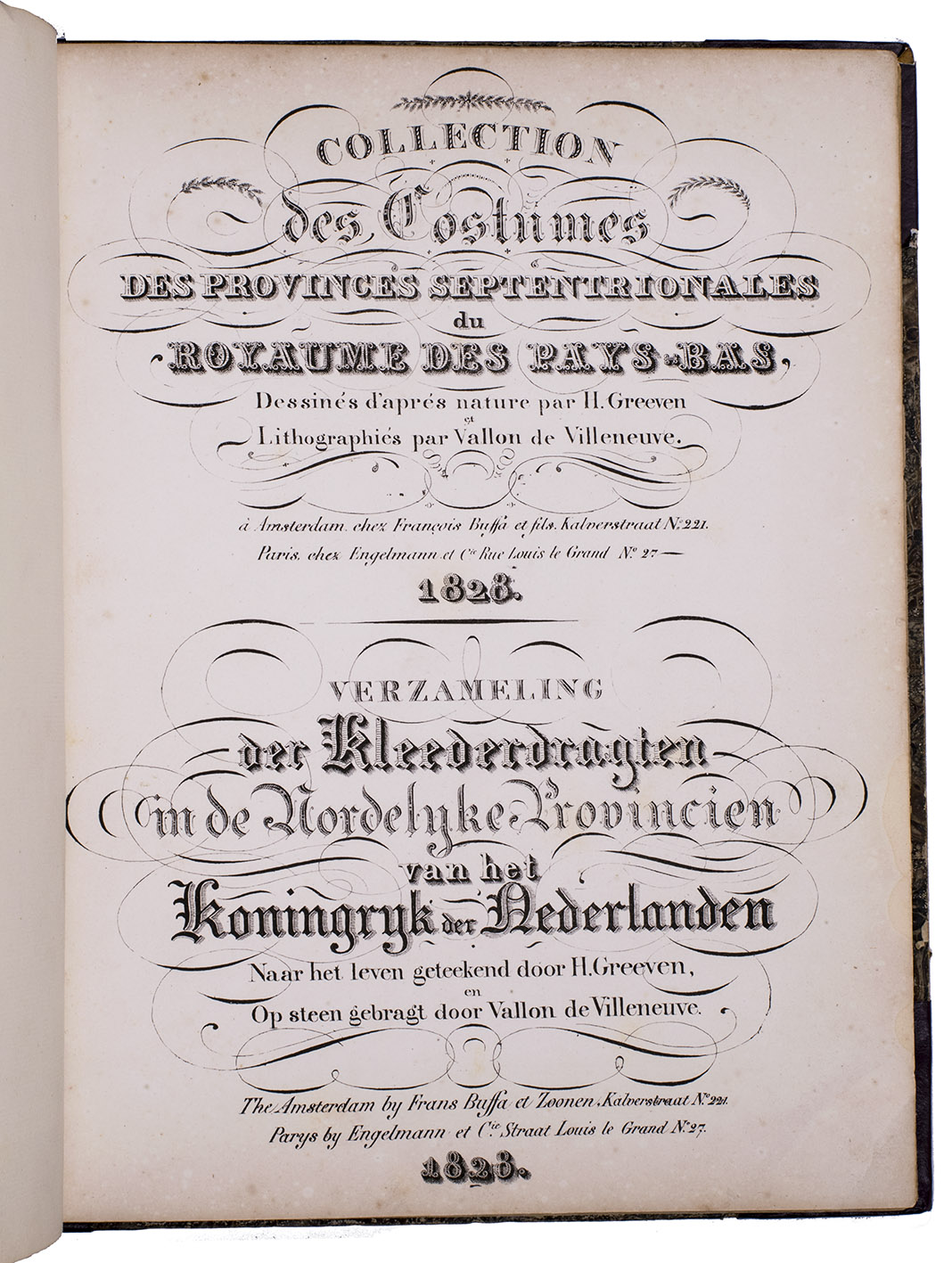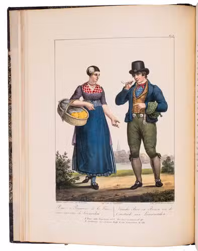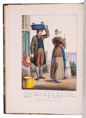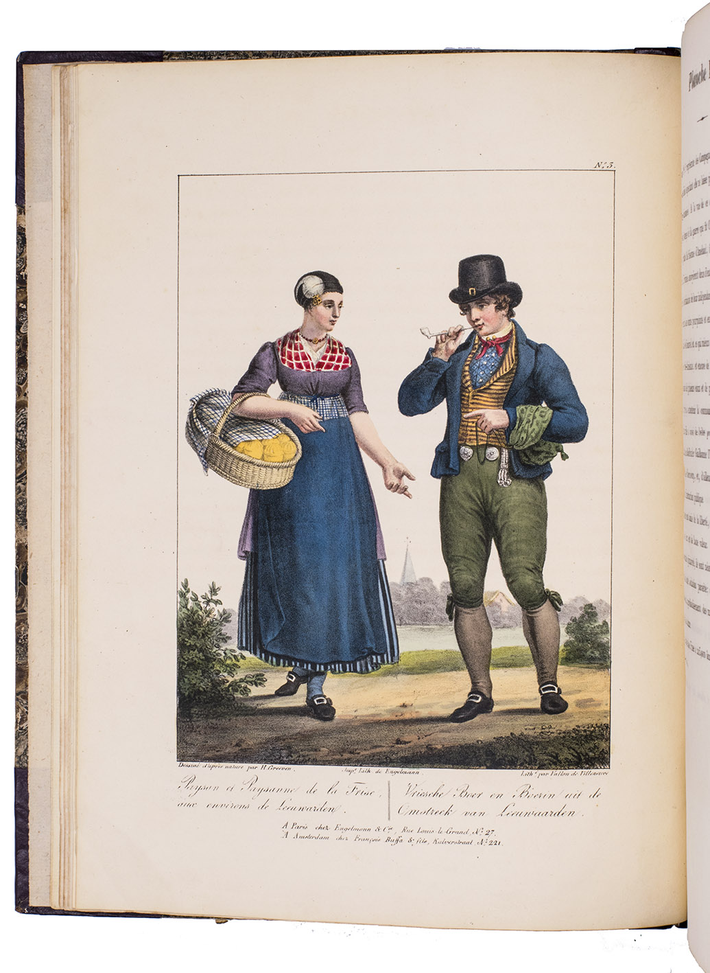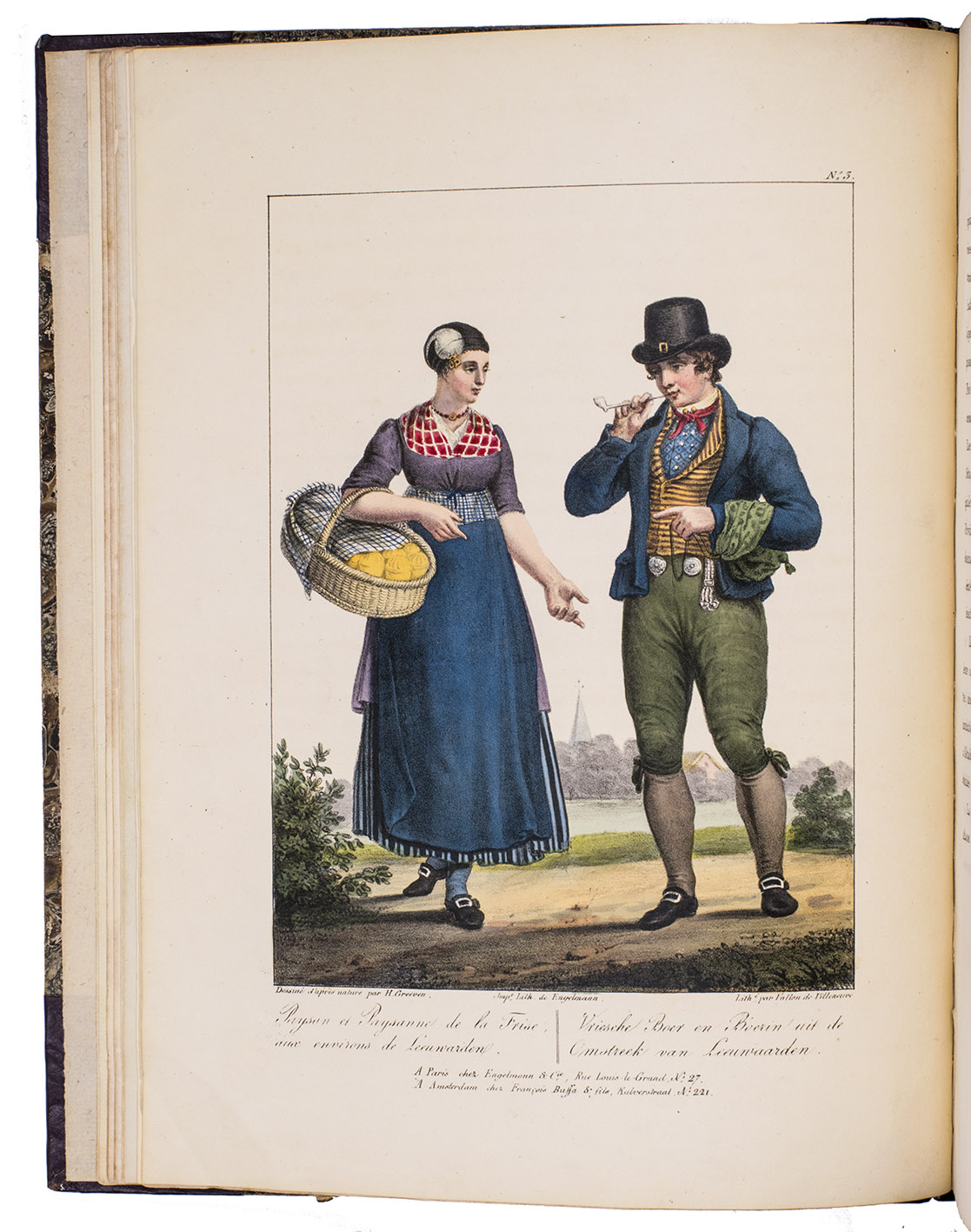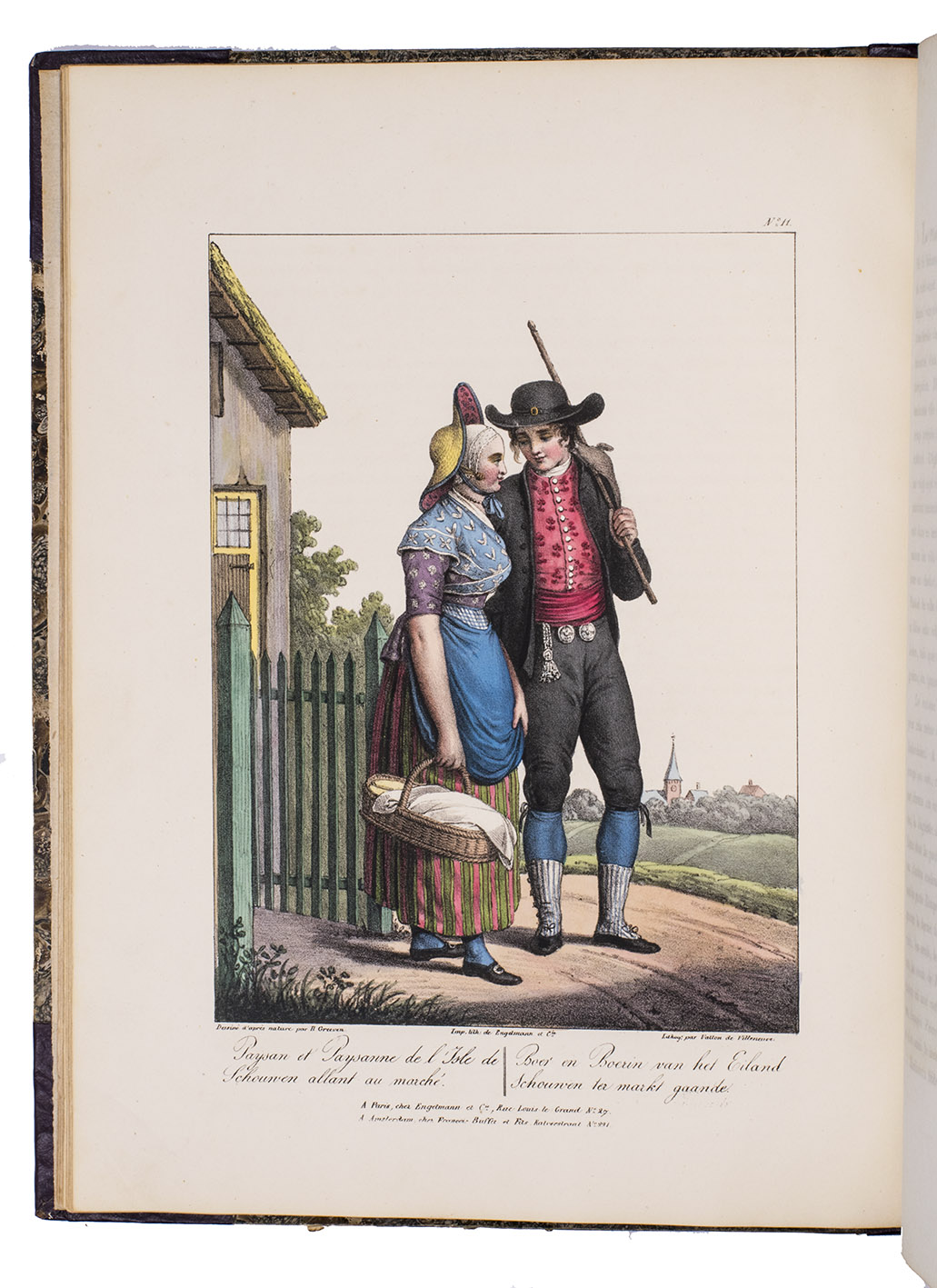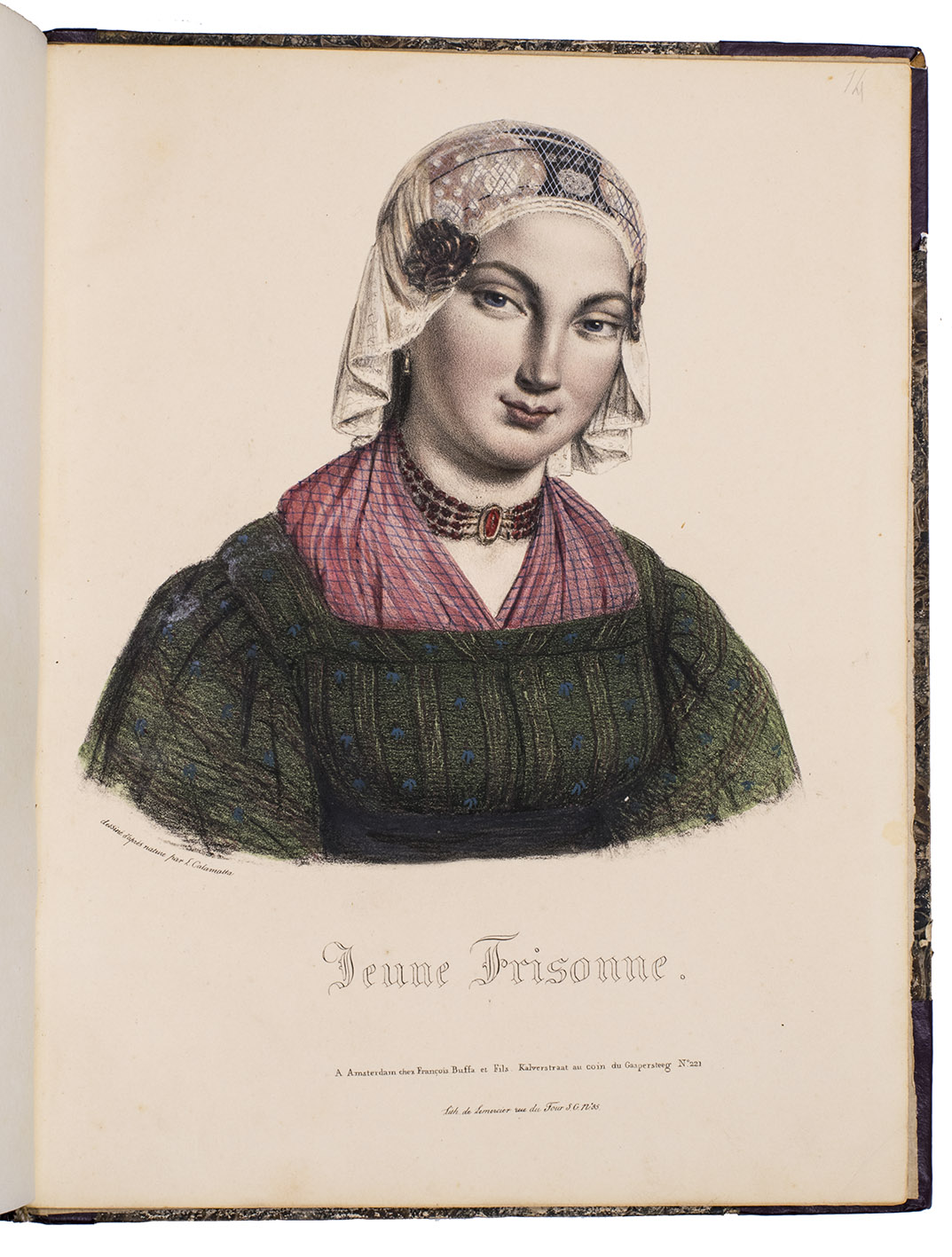 Ad 1: Finely coloured series of folk costumes from the Netherlands (then forming the northern part of a united kingdom with what is now Belgium and Luxemburg), with a preface and explanatory text in French and English. It shows mostly women and couples, but sometimes also children and in one case two men. Heavily inspired by Evert Maaskamp's publications of folk costume prints, the firm of Frans Buffa aimed to compete in this popular genre. The costumes in Buffa's book, drawn by Hendrik Greeven, are nearly identical copies of those in Maaskamp's Afbeelding van kleeding, zeden en gewoonten. However, Greeven's drawings excel in the quality of their composition and drawing and the placement of the figures against scenic backgrounds. The most revolutionary aspect is the use of the modern technique of lithography, produced and coloured in Paris.