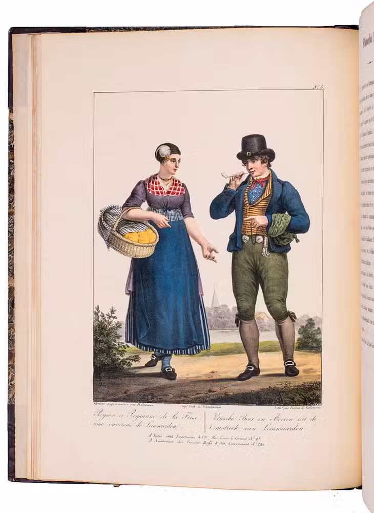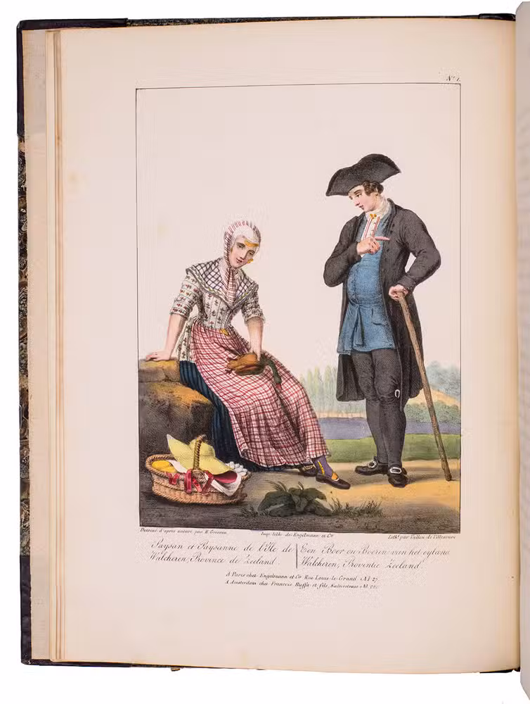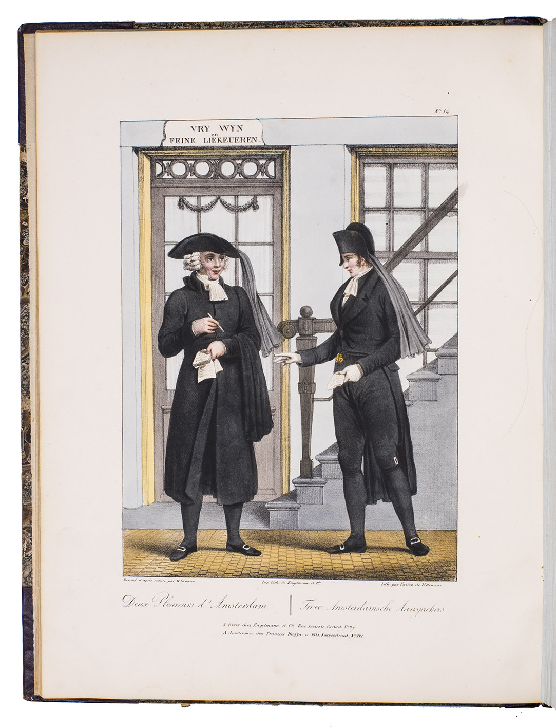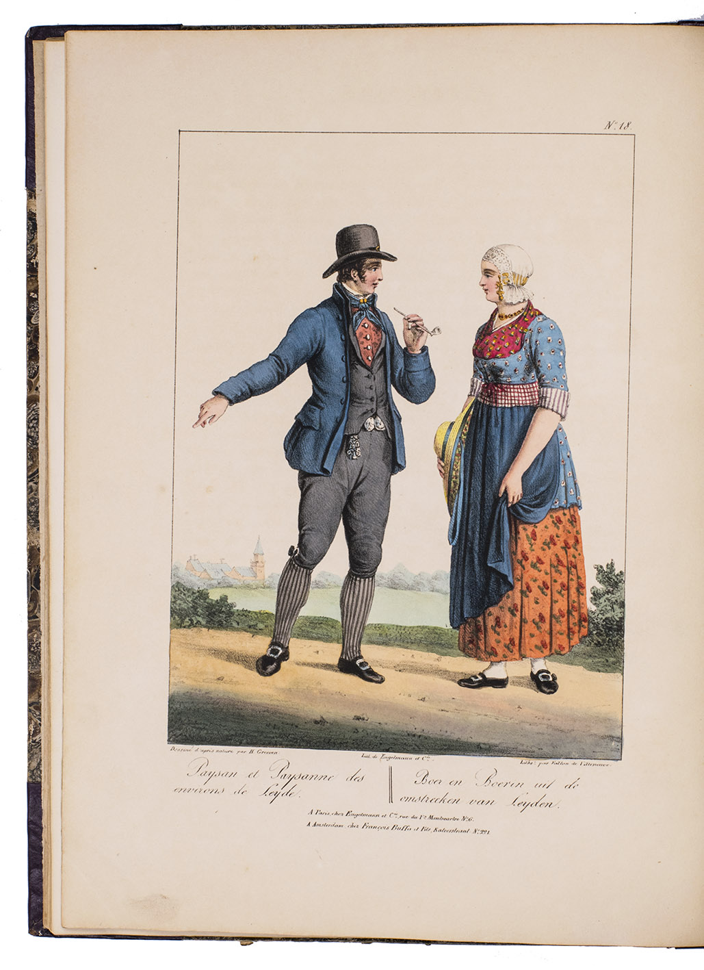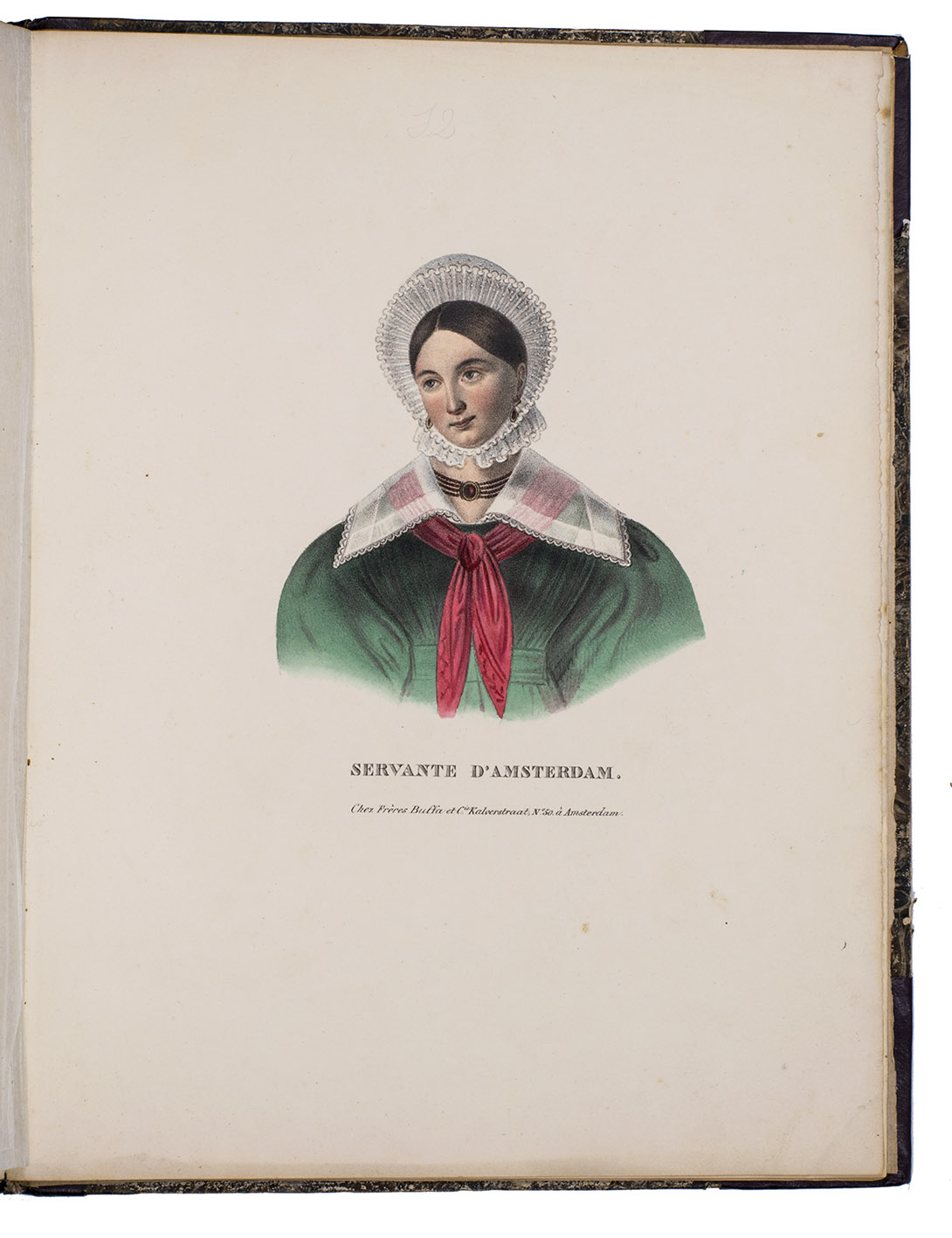 Ad 1: Finely coloured series of folk costumes from the Netherlands (then forming the northern part of a united kingdom with what is now Belgium and Luxemburg), with a preface and explanatory text in French and English. It shows mostly women and couples, but sometimes also children and in one case two men. Heavily inspired by Evert Maaskamp's publications of folk costume prints, the firm of Frans Buffa aimed to compete in this popular genre. The costumes in Buffa's book, drawn by Hendrik Greeven, are nearly identical copies of those in Maaskamp's Afbeelding van kleeding, zeden en gewoonten. However, Greeven's drawings excel in the quality of their composition and drawing and the placement of the figures against scenic backgrounds. The most revolutionary aspect is the use of the modern technique of lithography, produced and coloured in Paris.