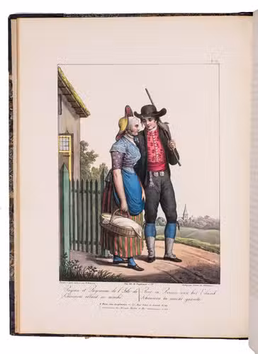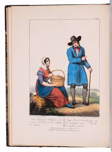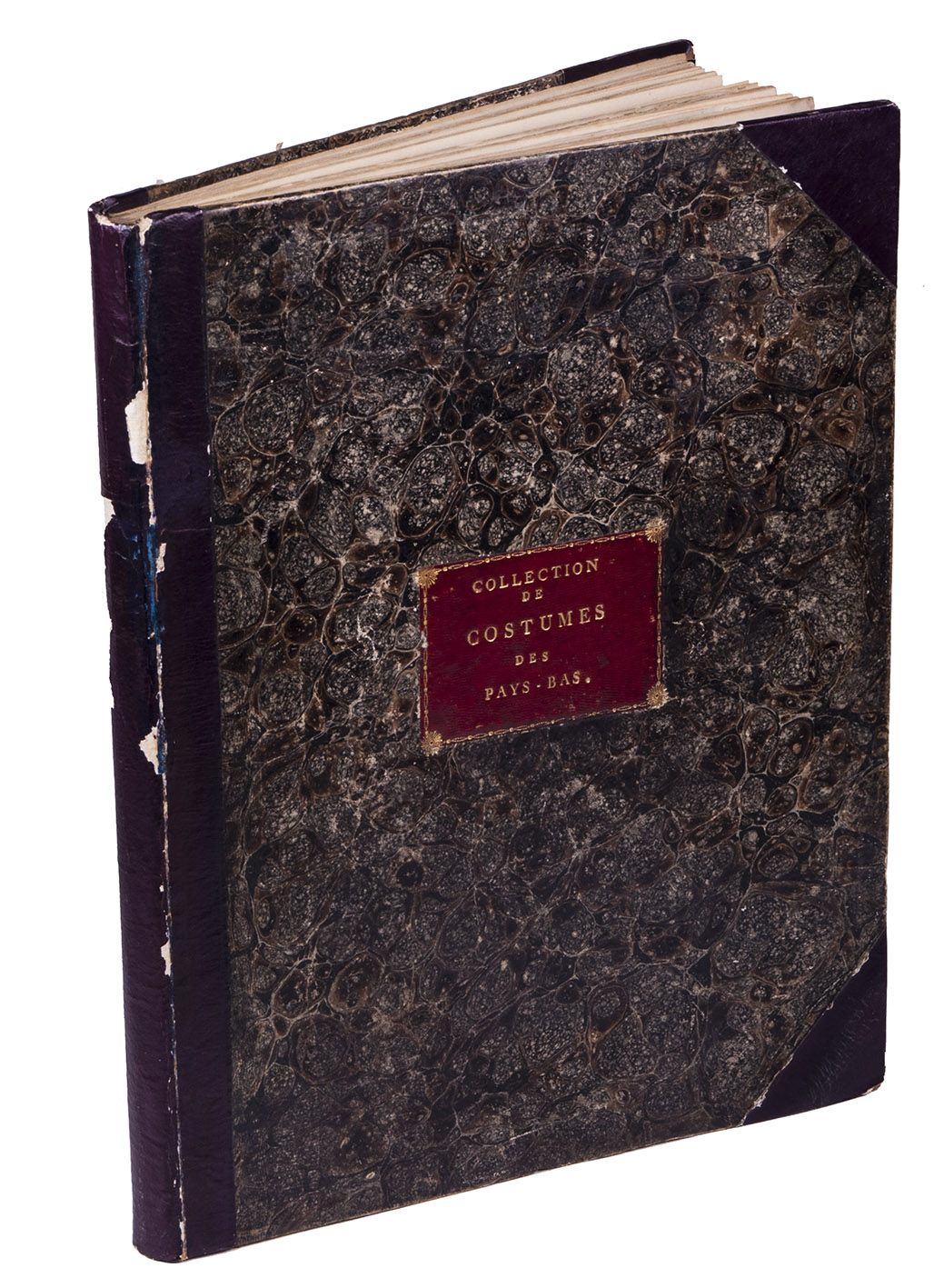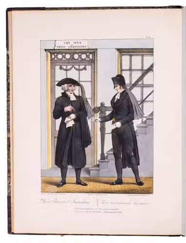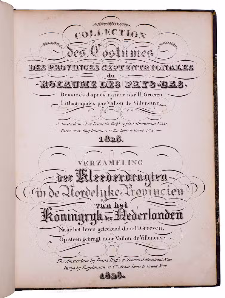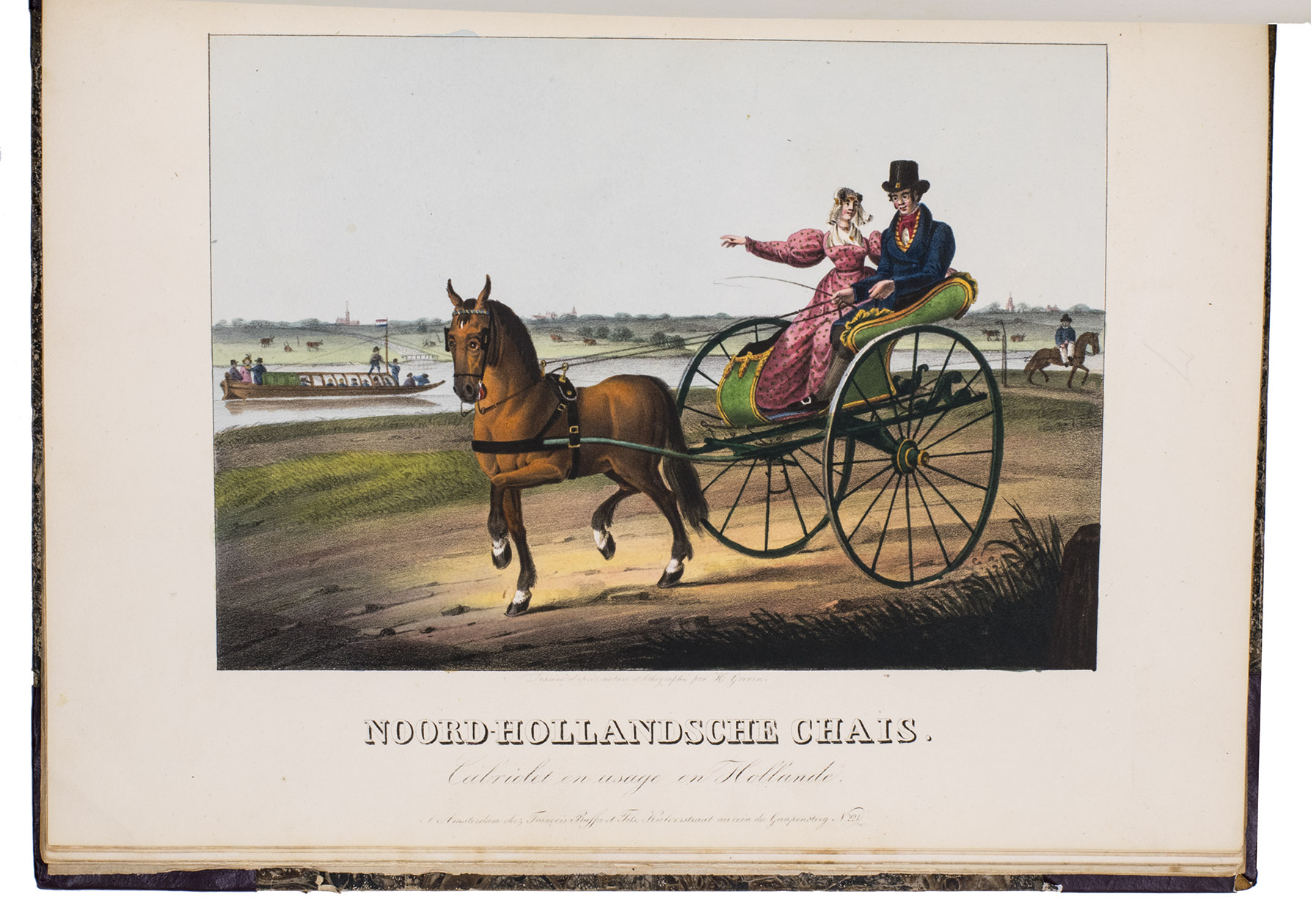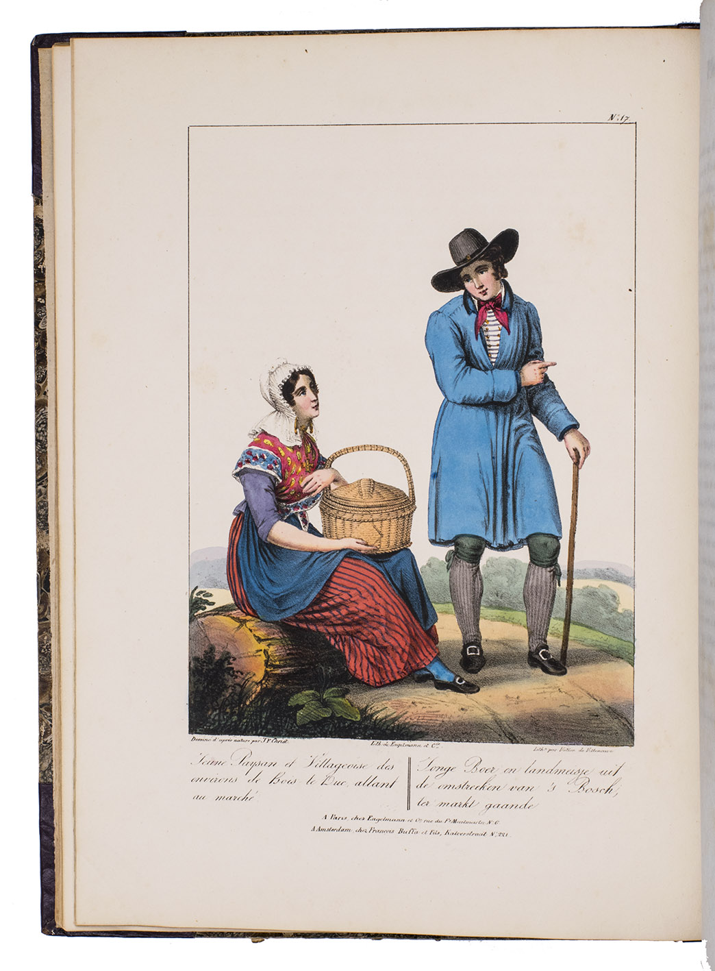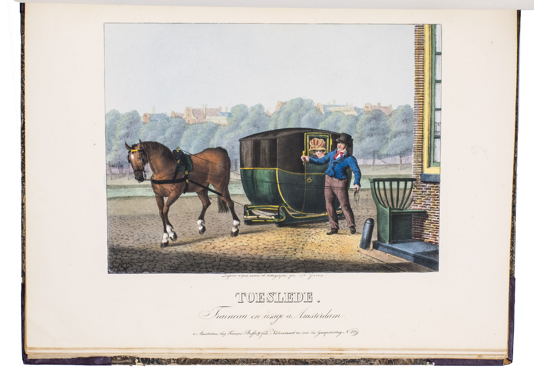 Ad 1: Finely coloured series of folk costumes from the Netherlands (then forming the northern part of a united kingdom with what is now Belgium and Luxemburg), with a preface and explanatory text in French and English. It shows mostly women and couples, but sometimes also children and in one case two men. Heavily inspired by Evert Maaskamp's publications of folk costume prints, the firm of Frans Buffa aimed to compete in this popular genre. The costumes in Buffa's book, drawn by Hendrik Greeven, are nearly identical copies of those in Maaskamp's Afbeelding van kleeding, zeden en gewoonten. However, Greeven's drawings excel in the quality of their composition and drawing and the placement of the figures against scenic backgrounds. The most revolutionary aspect is the use of the modern technique of lithography, produced and coloured in Paris.