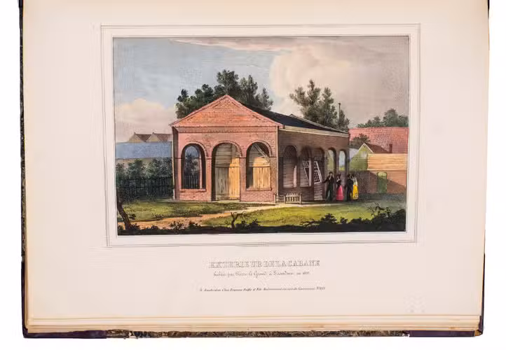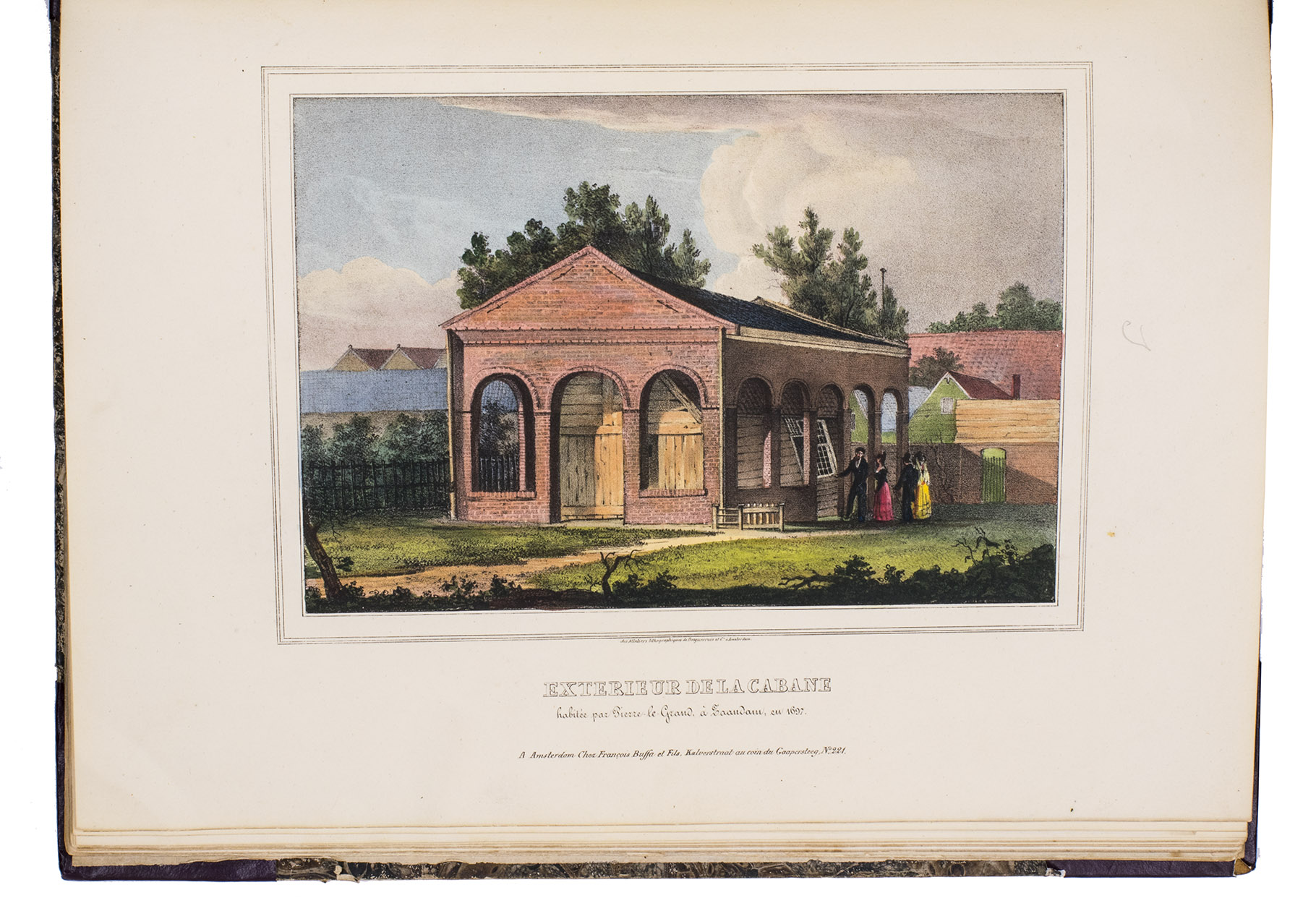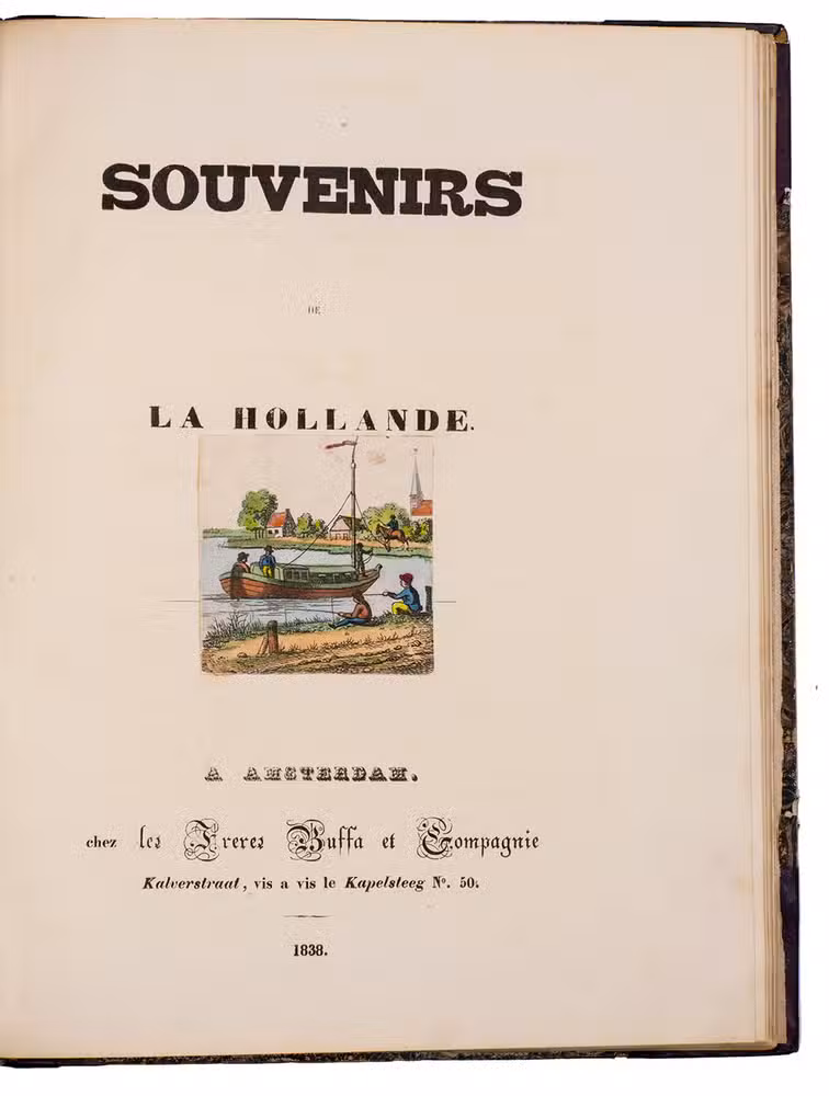 Ad 2: Very rare series of hand-coloured lithographs of Dutch folk costumes (all women) and views, probably intended as a souvenir album for tourists visiting Amsterdam and vicinity. The current issue, with an 1838 title-page, is complete with its present 14 lithographs, for it includes a (letterpress-printed) list of the 14 prints. We have located no other copy with a title-page or idnetical contents. Buffa produced several series, often including the same image in several series, bound in albums with titles such as "Souvenirs de la Hollande" or "Souvenirs des Pays-Bas" and often lacking the title-page. Some may have been assembled ad hoc and the individual prints were sold separately as well. Several of the plates were reissued in Album de costumes des Pays-Bas (1848) and Souvenirs des Pays-Bas (1845).
