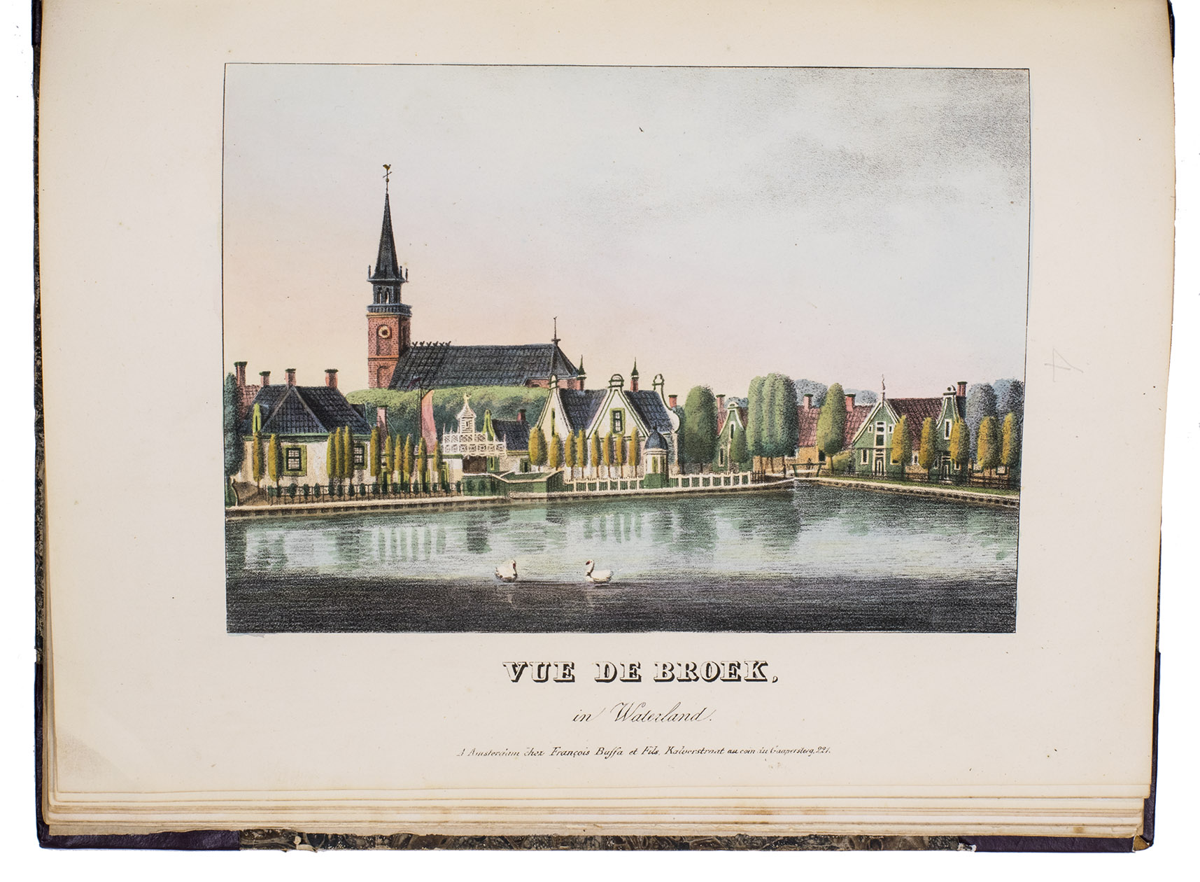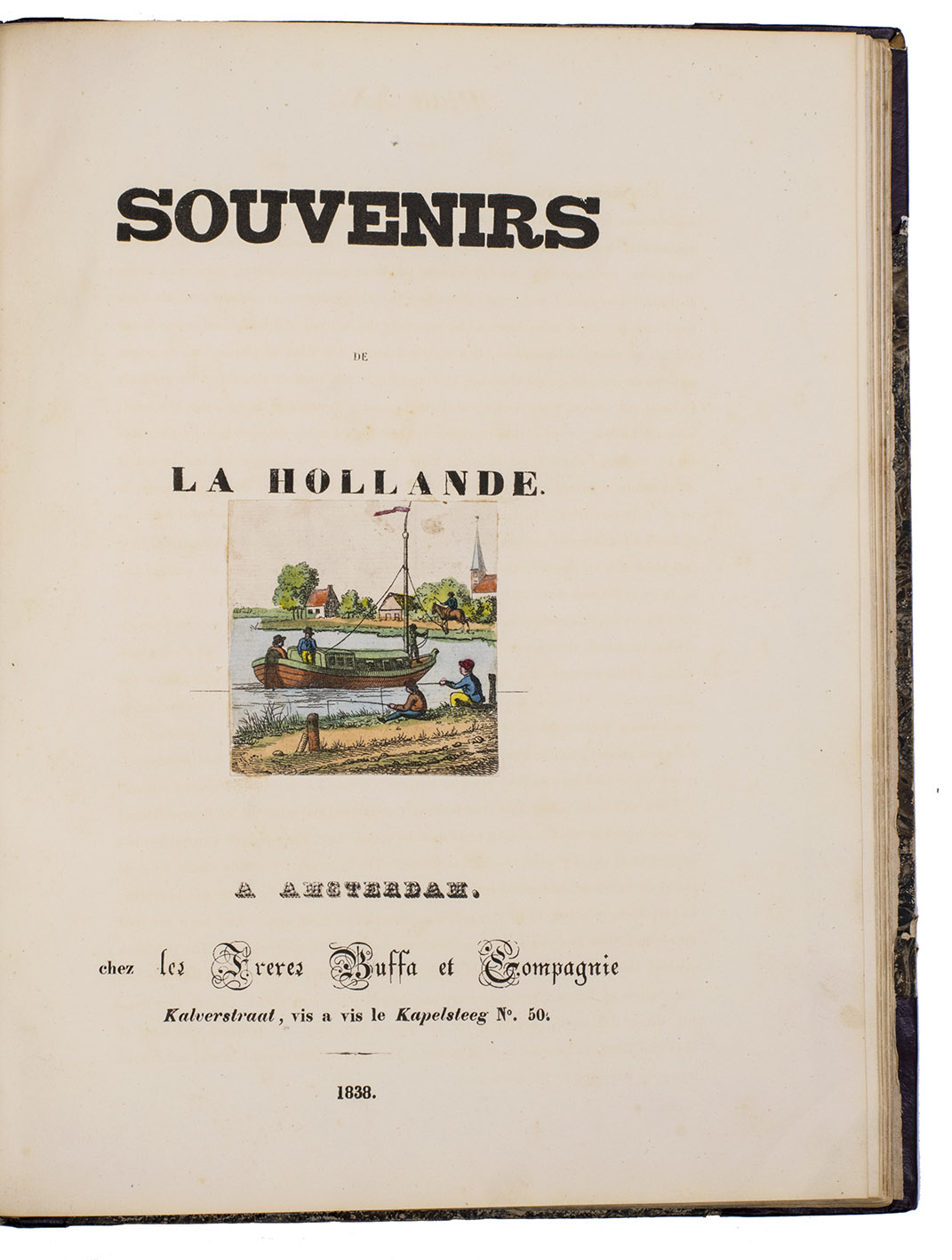 Amsterdam, Buffa brothers and co., 1838. With a hand-coloured engraving mounted on the title-page and 14 hand-coloured lithographed plates (7 of Dutch views and 7 of women's folk costumes). 2 works in 1 volume. Large 4to (32 x 24 cm). Contemporary boards with marbled sides. [24] ll. text in French and English.