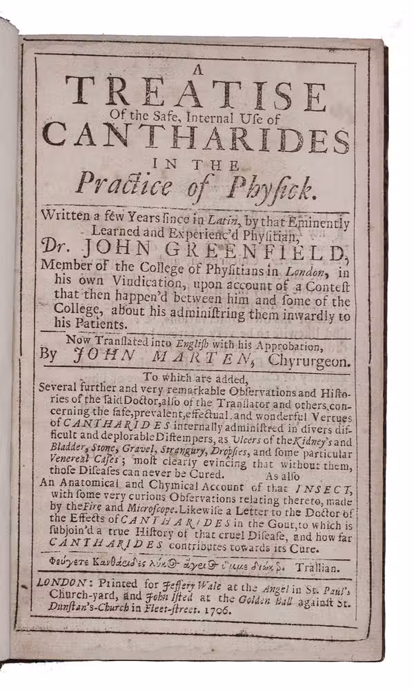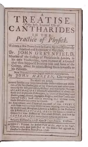 First English edition of a treatise on the medicinal use of Spanish fly (Lytta vesicatoria, traditionally classified in the family Canthardiae). Joannes Groenevelt (1648-1715/16)) was a Dutch-born physician, practising in London from 1675 on. Spanish fly was known for centuries as an aphrodisiac, but was also extremely dangerous, overdoses sometimes causing death. Greenfield, as he called himself in England, strongly advocated the use of Spanish fly, primarily for the treatment of gout and of bladder and kidney diseases. One of his patients accused him of malpractice and Groenvelt was fined and sent to Newgate prison, but obtained permanent freedom through William III's general pardon in 1691. He published the present treatise on the use of Spanish fly as a vindication of his methods. It includes a laudatory poem by Bernard Mandeville, detailed descriptions of the various medicinal uses of Spanish fly, followed by medical observations and several recipes. Blake, p. 187; ESTC T64914; for the author: Cook, "Groenevelt, Joannes (bap. 1648, d. 1715/16)", in: ODNB (online ed.).
