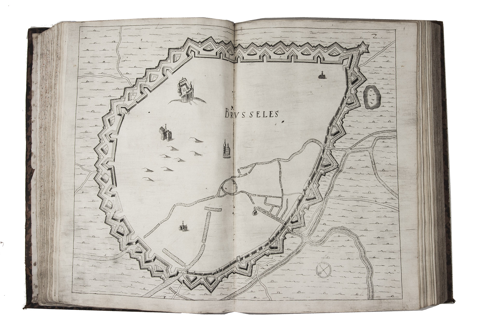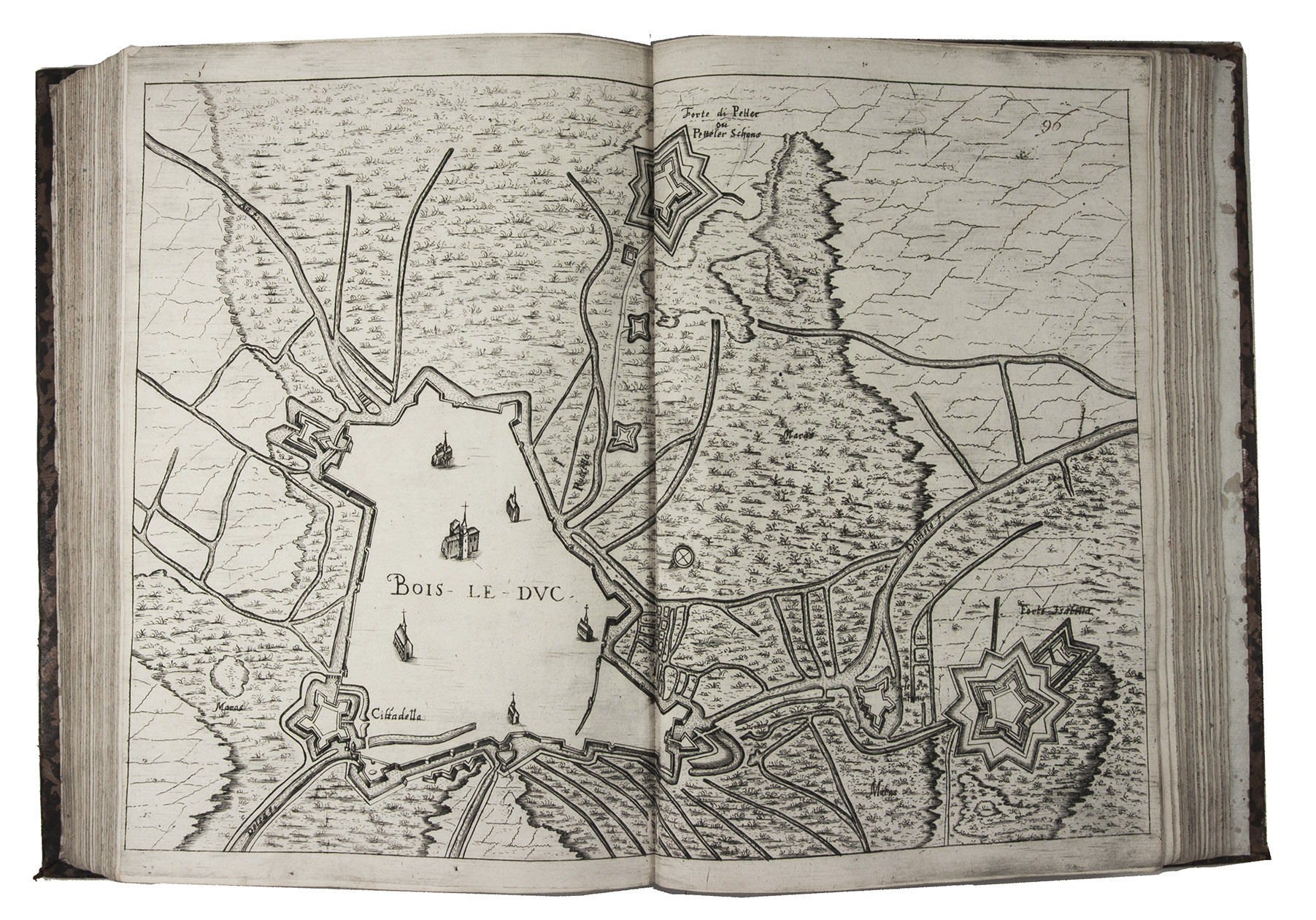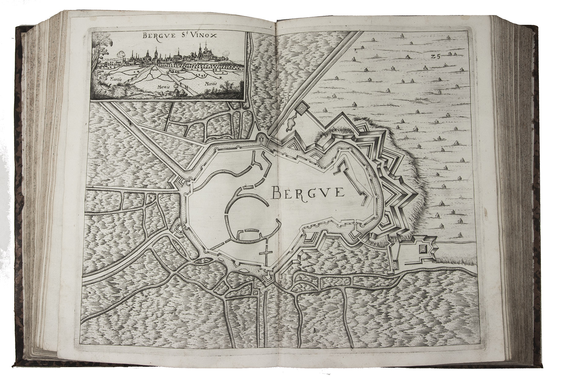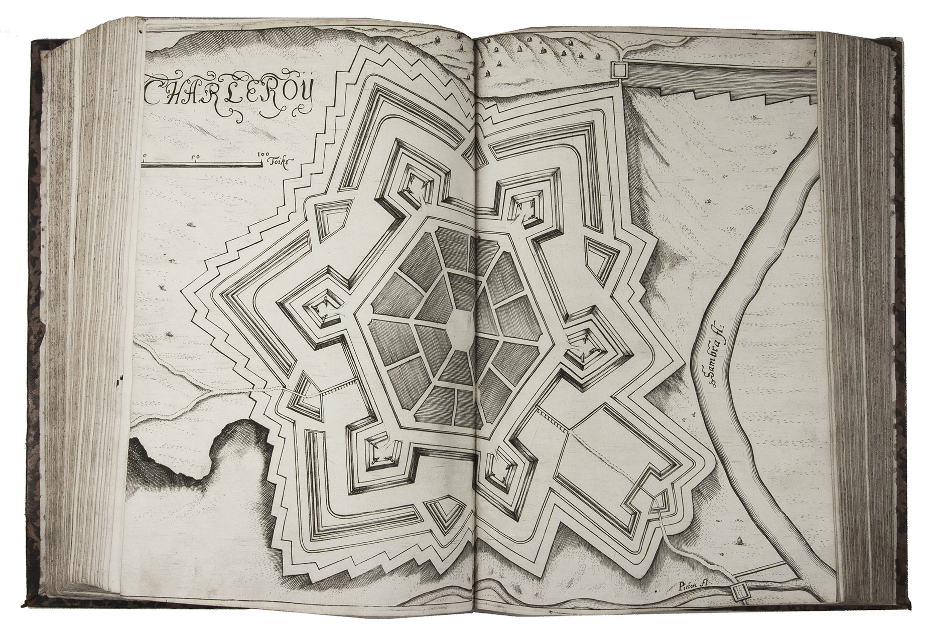Vienna, Michael Thurnmayer, 1673. Folio. With engraved frontispiece with the coat-of-arms of all Seventeen Provinces, engraved military scene on the title-page, folding engraved map of the Low Countries, 2 folding engraved views of a sea-battle and an army crossing the Rhine, and 120 double-page engraved fortification plans. Contemporary mottled sheepskin, gold-tooled spine. [14], 148, [6] pp. text