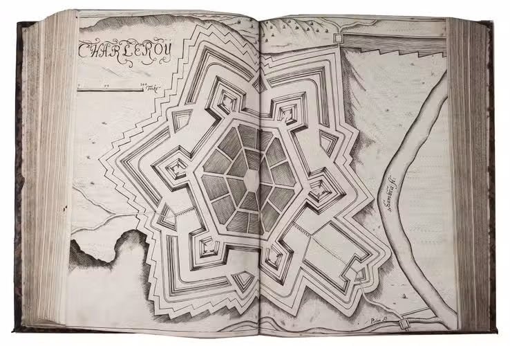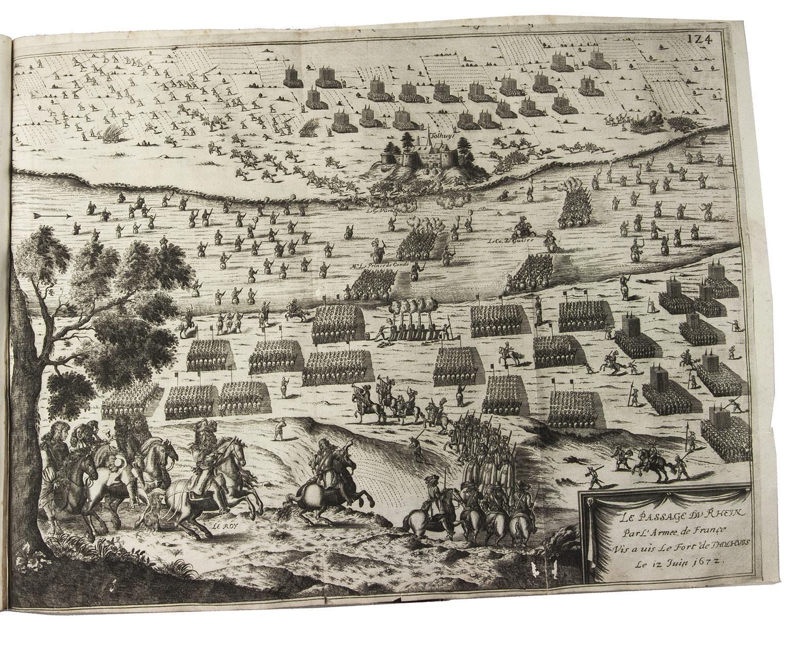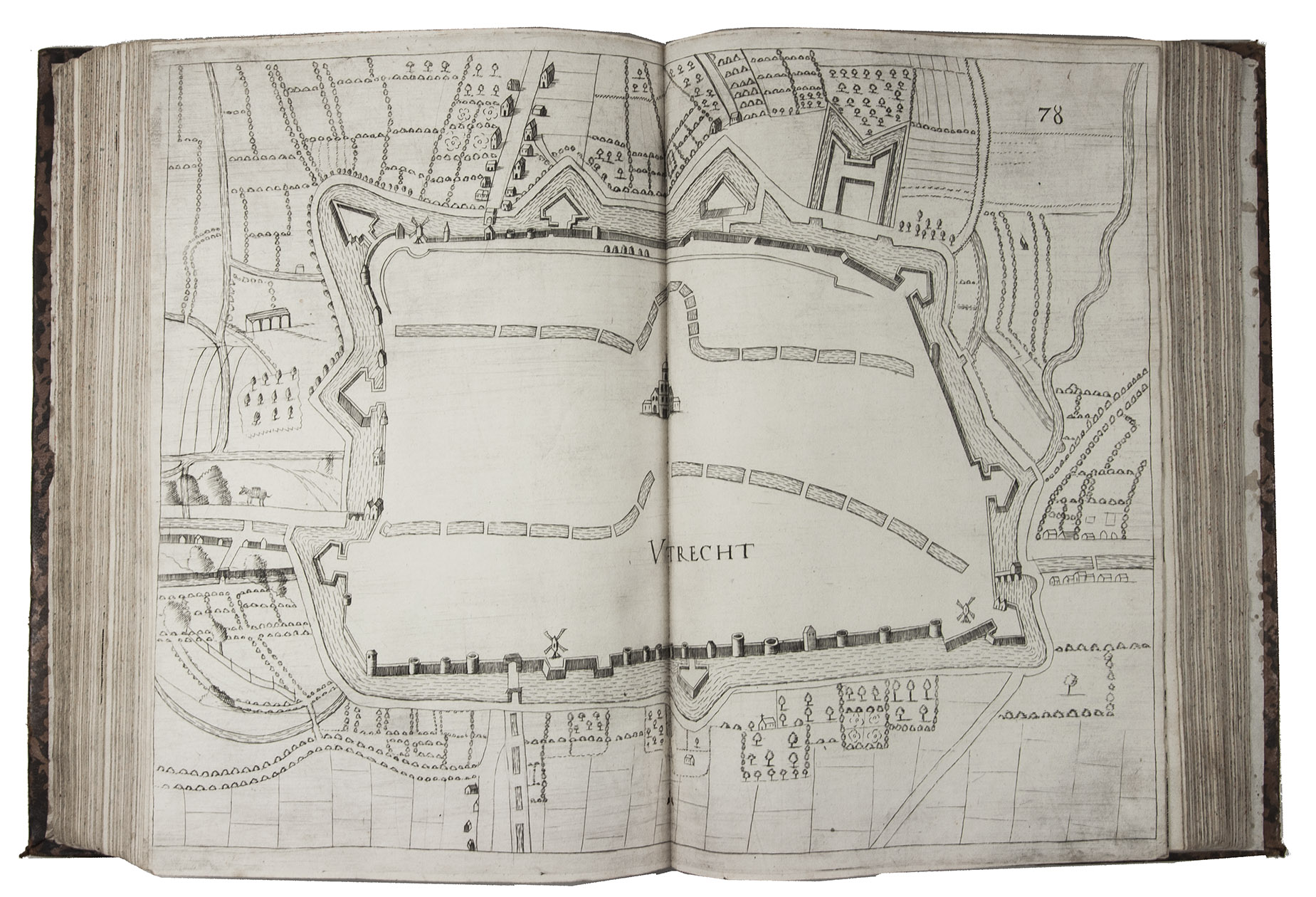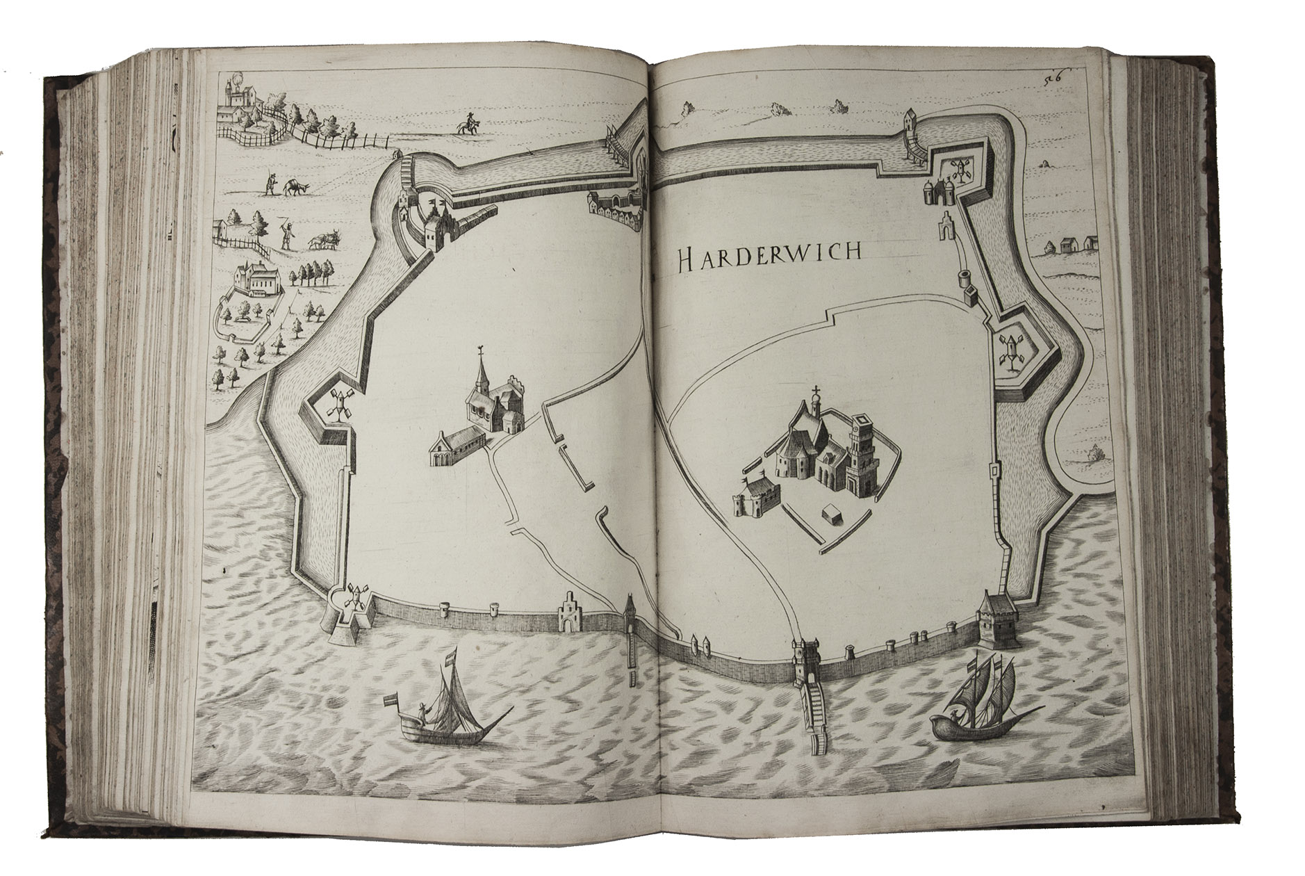 Vienna, Michael Thurnmayer, 1673. Folio. With engraved frontispiece with the coat-of-arms of all Seventeen Provinces, engraved military scene on the title-page, folding engraved map of the Low Countries, 2 folding engraved views of a sea-battle and an army crossing the Rhine, and 120 double-page engraved fortification plans. Contemporary mottled sheepskin, gold-tooled spine. [14], 148, [6] pp. text
