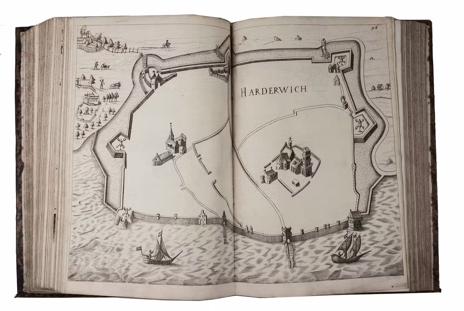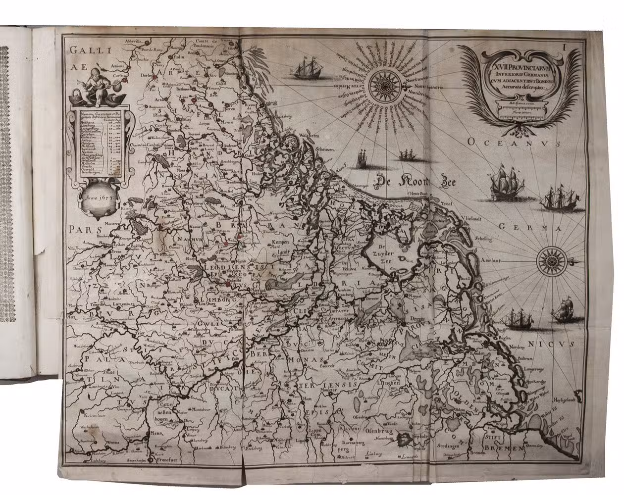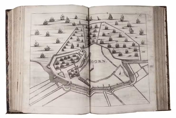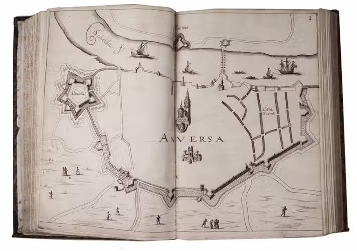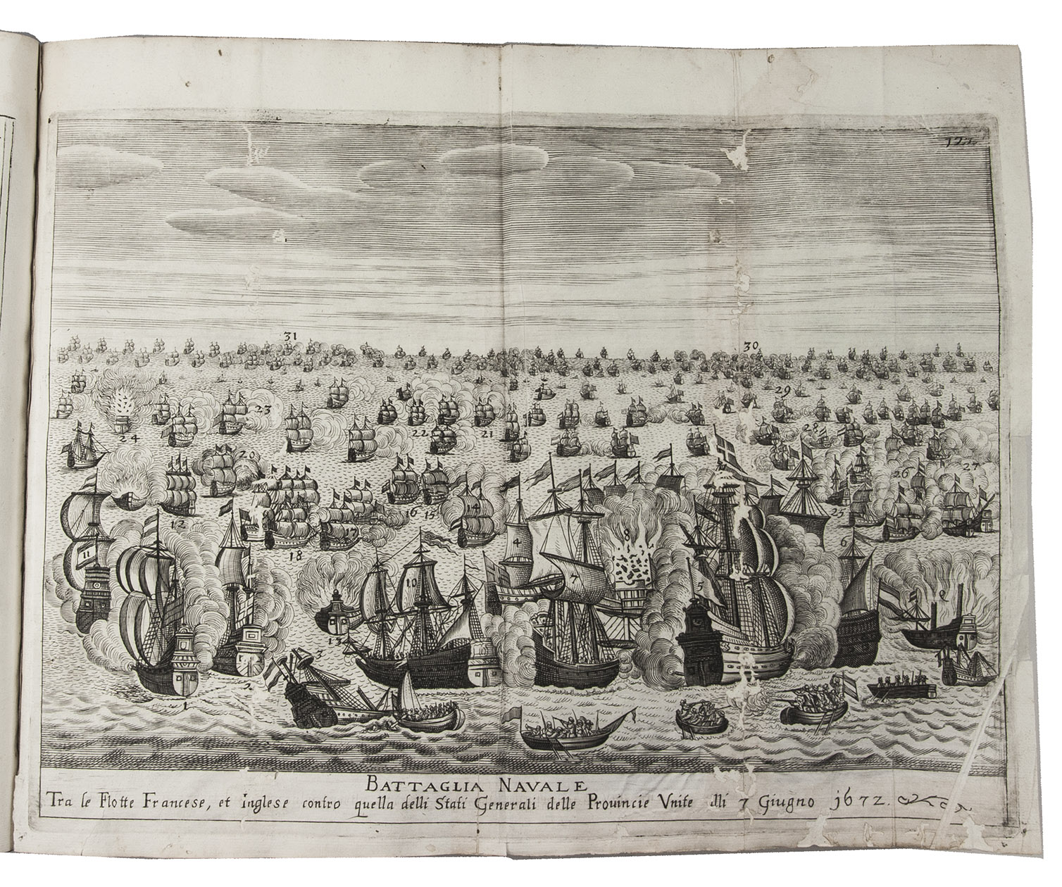 Vienna, Michael Thurnmayer, 1673. Folio. With engraved frontispiece with the coat-of-arms of all Seventeen Provinces, engraved military scene on the title-page, folding engraved map of the Low Countries, 2 folding engraved views of a sea-battle and an army crossing the Rhine, and 120 double-page engraved fortification plans. Contemporary mottled sheepskin, gold-tooled spine. [14], 148, [6] pp. text