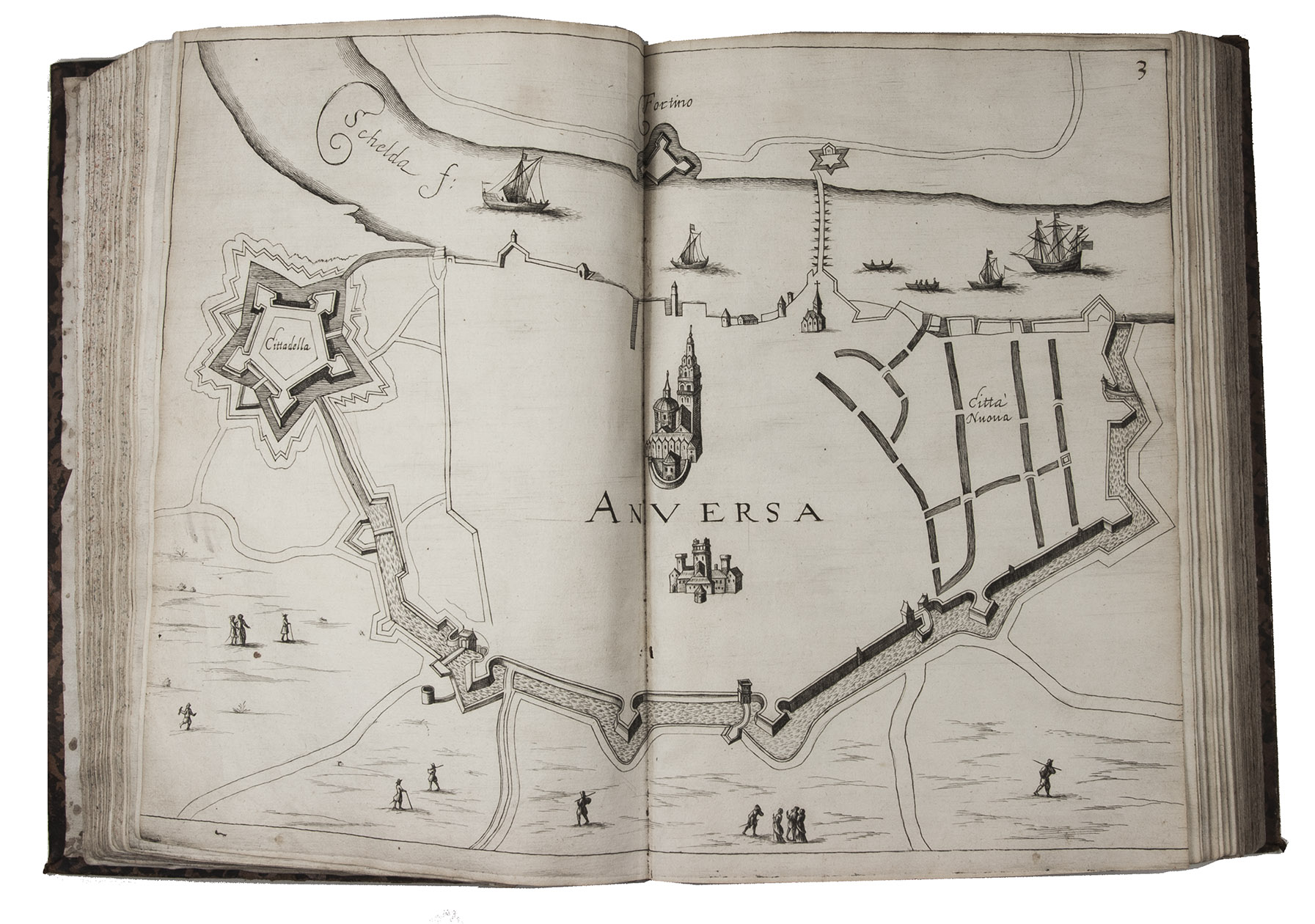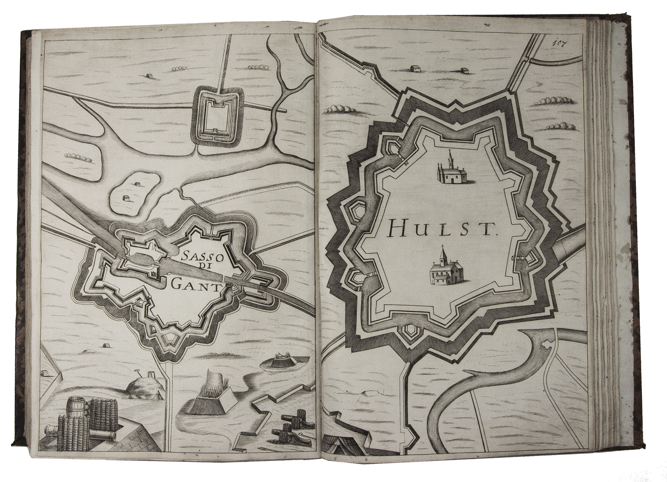 Italian edition, Thurnmayer issue (one of two simultaneous issues), of a fortification atlas of the Low Countries, published in the same year in German as Schau-platz desz Niederlandes. The 120 plans are well engraved and show the fortifications of all important cities and towns. The majority are copies after Blaeu and Beaulieu. They are preceded by a geographical and historical description.