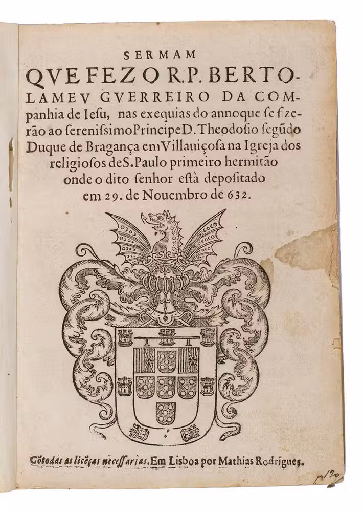 Lisbon, Mathias Rodrigues, [1632]. 4to. With the woodcut coat of arms of Duke Theodosius II on the title page, two woodcut initials and an ornamental head-piece. Plain paper wrappers with a small label on the front wrapper. [4], 28 ll.