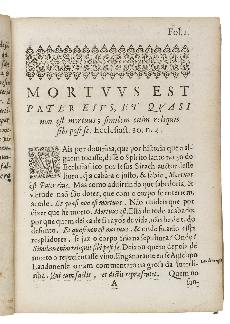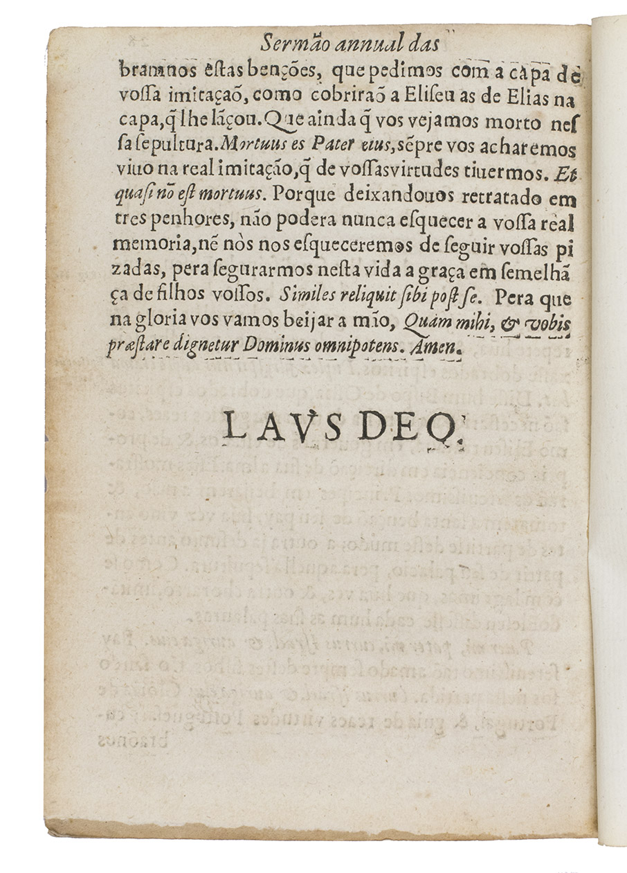 A rare sermon honouring Theodosius II, duke of Braganza (1568-1630), two years after his passing. Theodosius II, the father of King João IV, is mostly known for his courage. In 1578, when he was just 10 years old, King Sebastião (1554-1578) asked him to accompany him to Morocco for a campaign to reconquer lost territory and help former Sultan Abu Abdallah Mohammed II (?-1578) regain the throne. The battle, known as the battle of Alcacér Quibir, took place in northern Morocco. Theodosius stayed at the side of the king until it became too dangerous and he was sent away. However, he took a horse and went back to the front line as soon as he could. The Portuguese spectacularly lost in one of their greatest military disasters overseas, leaving the country nearly bankrupt and without a king. Theodosius himself was wounded and captured, but the new sultan, Ahmad al-Mansur (1549-1603), was impressed by his courage and let him go without ransom. This event, and others from the duke's life, are recounted in this sermon.