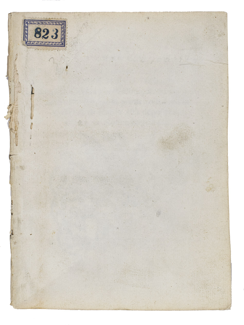 With a label on the front wrapper and a manuscript annotation in the bottom outer corner of the title page. Front wrapper creased, a few worm holes to the spine and gutter of the front wrapper. With small marginal defects, a stain on the first 3 leaves, a waterstain on the top of the leaves in the second half of the work and a larger waterstain on leaf 26, all without affecting the text. Overall in good condition. Iberian books B70709/44865; Innocencio 1, 332; PorBase 1577538 (12 copies BnP); Sommervogel 3, 1912; USTC 5024658; WorldCat 80995846, 905219550; 1002783743, 15930086 (6 copies); Cunha, Mafalda Soares de, Estratégias de distinção e poder social: A casa de Bragança (1496-1640). In: Revista de história das ideas, vol. 19, 1998, pp. 309-337.