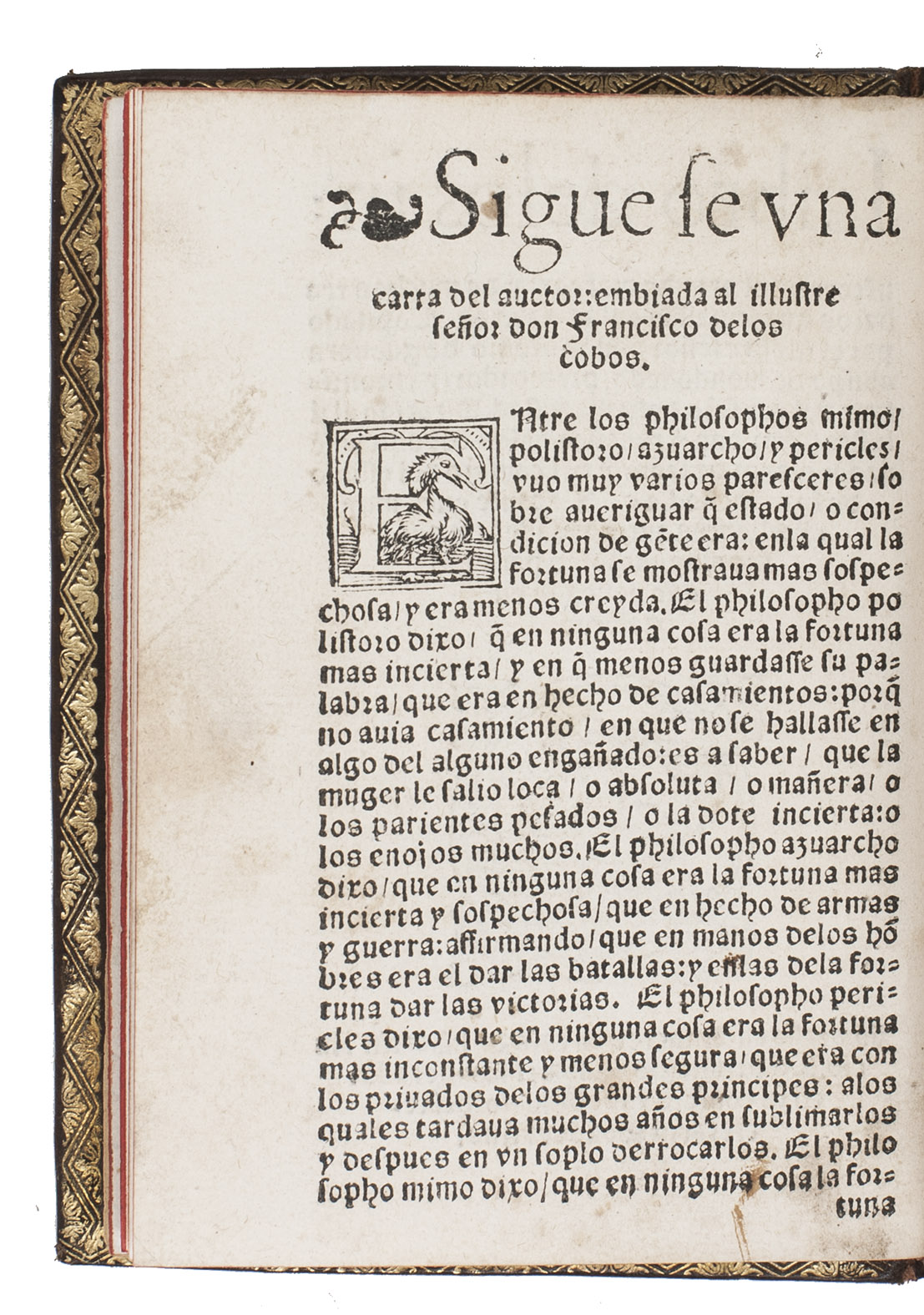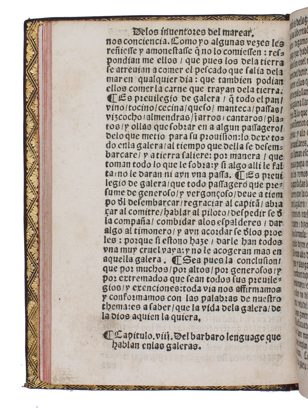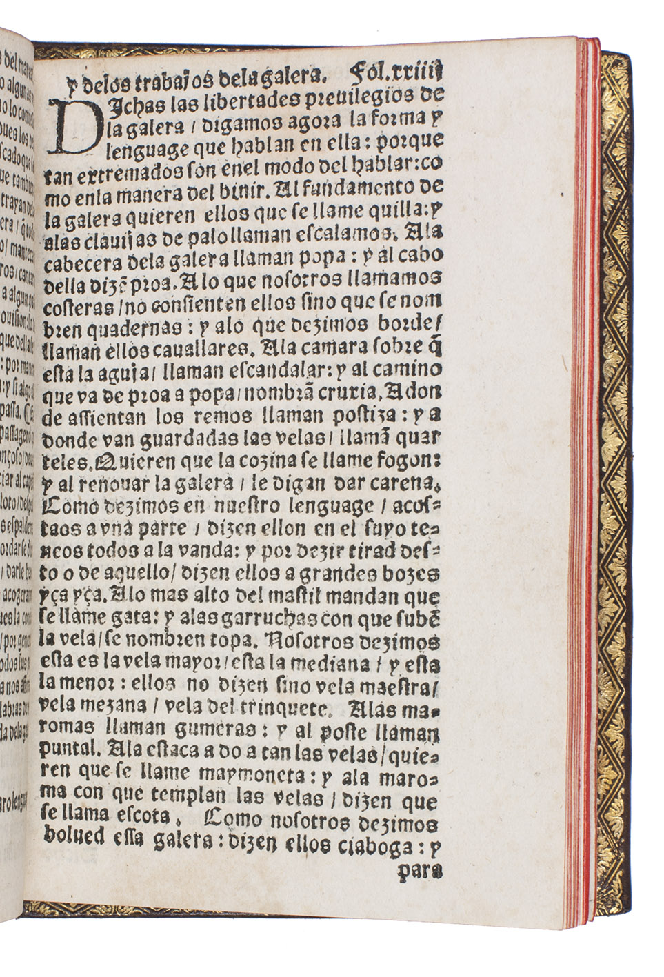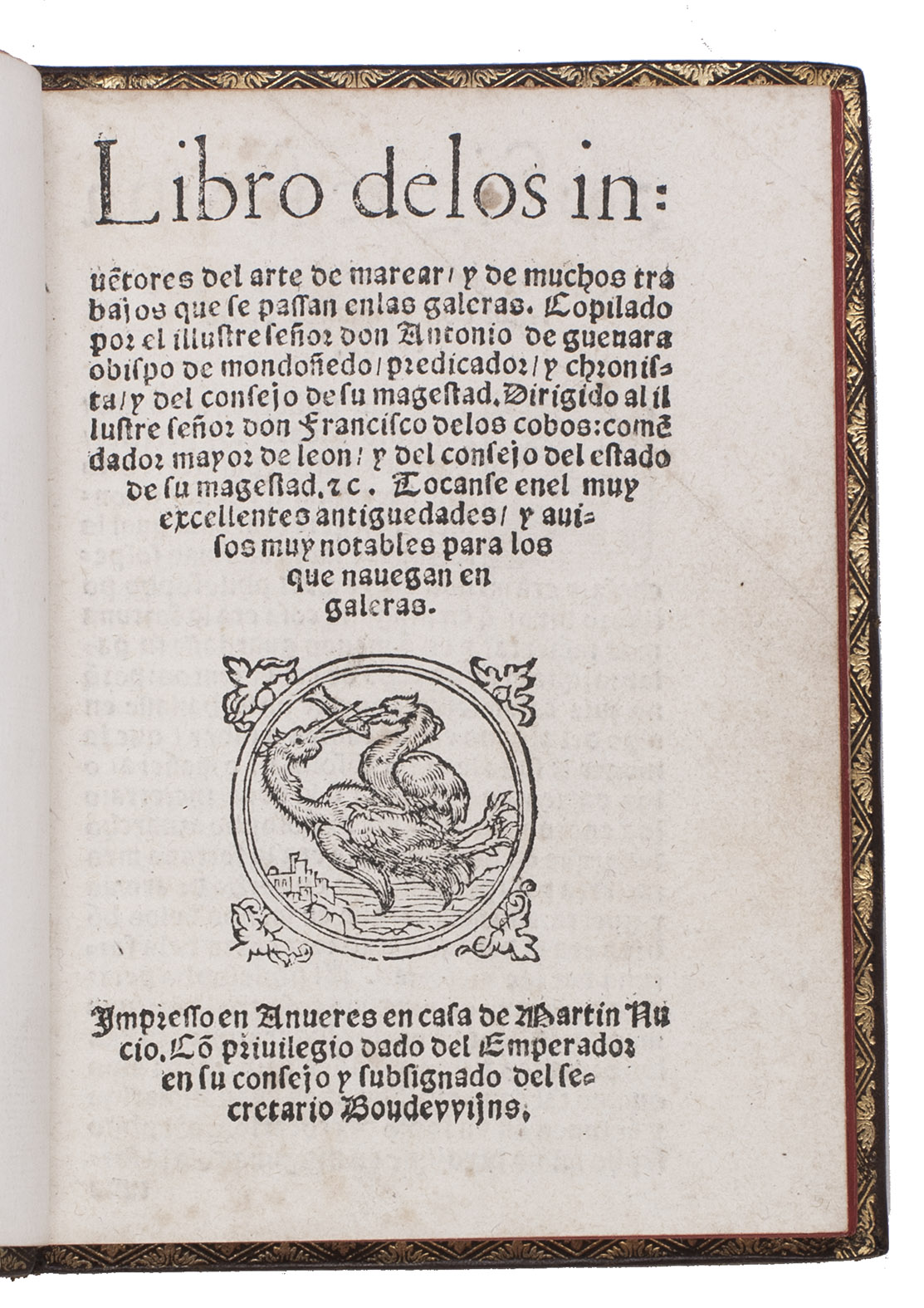 Rare (first?) separately published edition of an early discourse on the art of sailing and navigation, in the original Spanish, first published as part of Libro llamado Menosprecio de Corte. The book discusses the invention and use of the galley, mariners of classical antiquity, the dangers of the sea, pirates, the sea and its properties, and of special interest a chapter on the barbaric language spoken in Spanish galleys: a primary source for their lost maritime dialects. Although it covers sailing from classical antiquity onward, most of the text focuses on Guevara's own era. He includes often humorous descriptions of the horrendous food aboard the galleys, and lists, with tongue in cheek, 58 "privileges" reserved for those who live a life at sea. Ultimately, sailing separates men from beasts, for beasts flee danger while men willingly sail into unknown waters. The present work was later translated into English, French and Italian, the first as A book of the invention of the art of navigation.