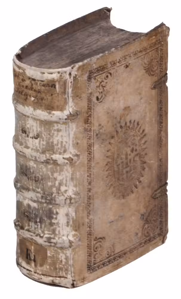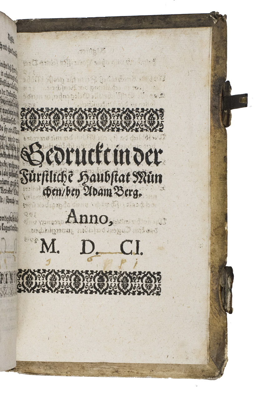 Munich, Adam Berg, 1601. 8vo. Title in red and black. Contemporary vellum over wooden board [12], "414" (= 829), [9] pp.
