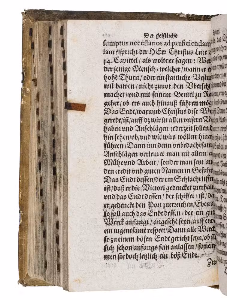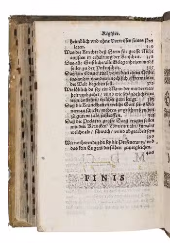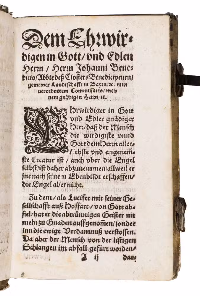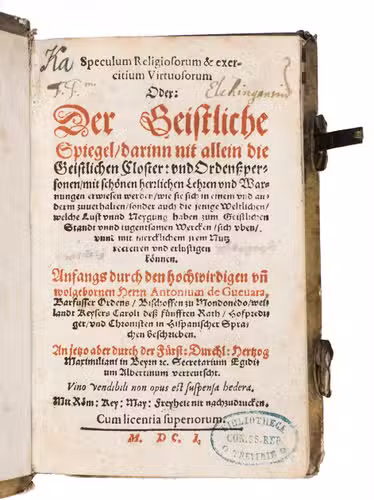 Early German translation of copy of the Oratorio de religiosos y Exercicio de virtuosos by Antonio de Guevara (c. 1480-1545); one of the few religious treatises written by the popular Spanish writer.