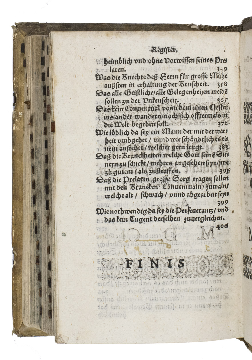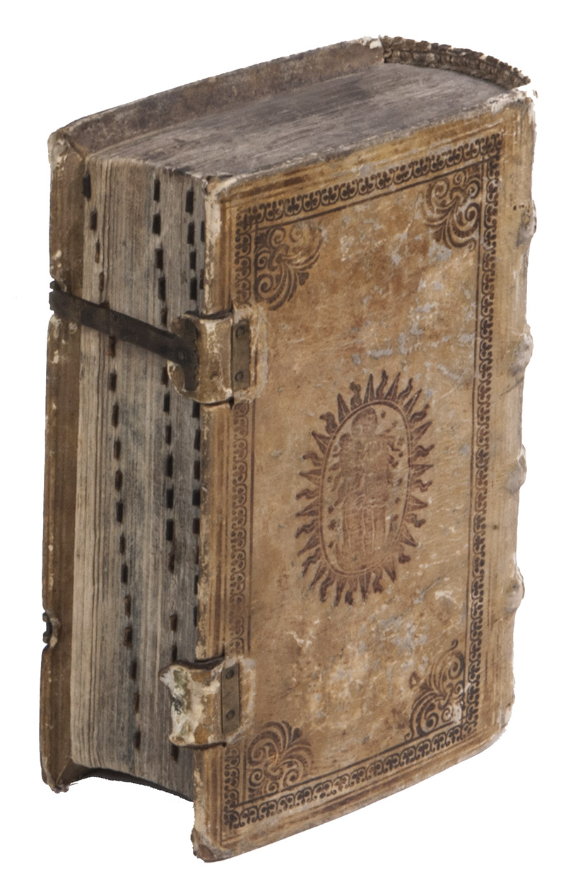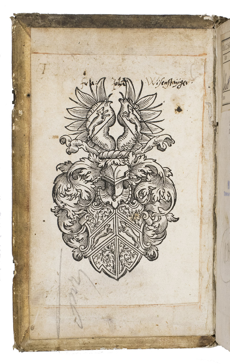 Large early woodcut bookplate on front pastedown. Leaves with tabs for easy access to chapters. Binding rubbed, one claps missing, library stamp and signature on the title page, 2 library stamps on the free endpaper. Internally a very good copy and a pleasant copy of the period in original condition. Dünnhaupt 7.2; USTC 2132830 (3 copies); VD17 12:102987X (2 copies); WorldCat 257830609.