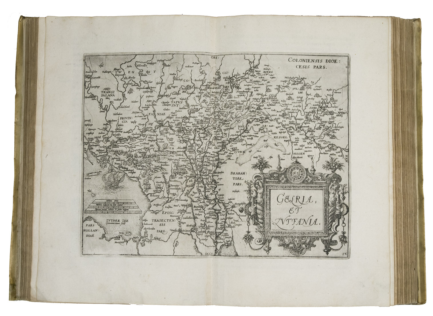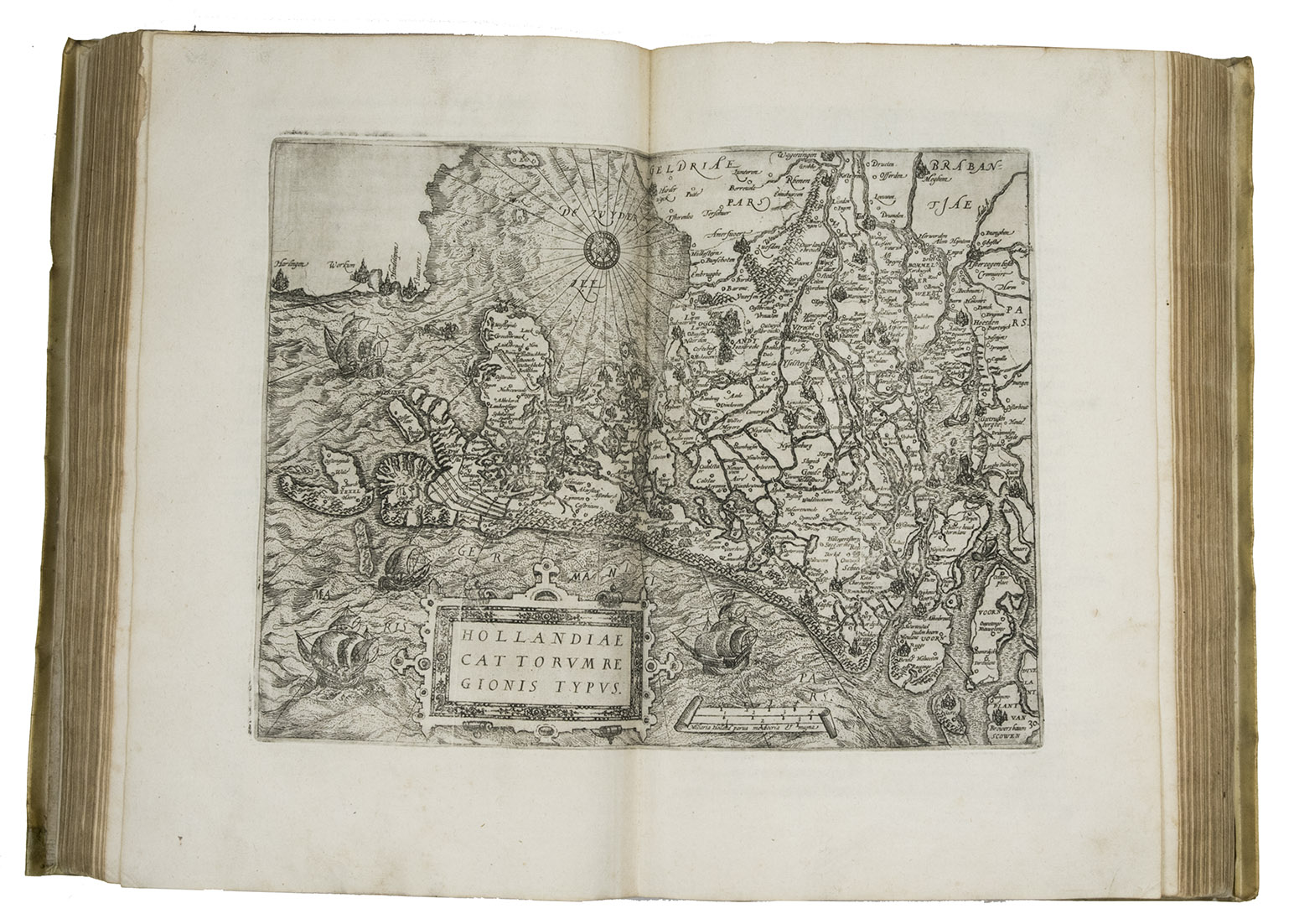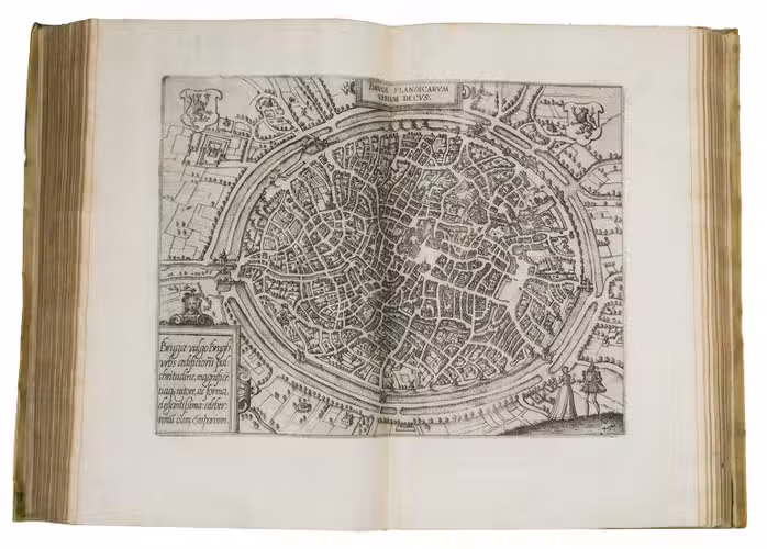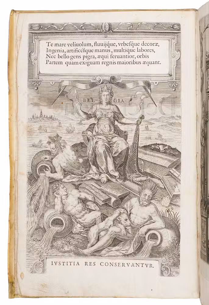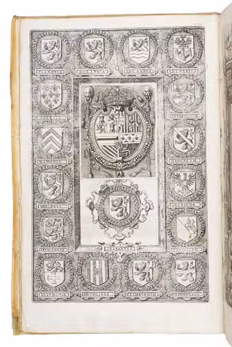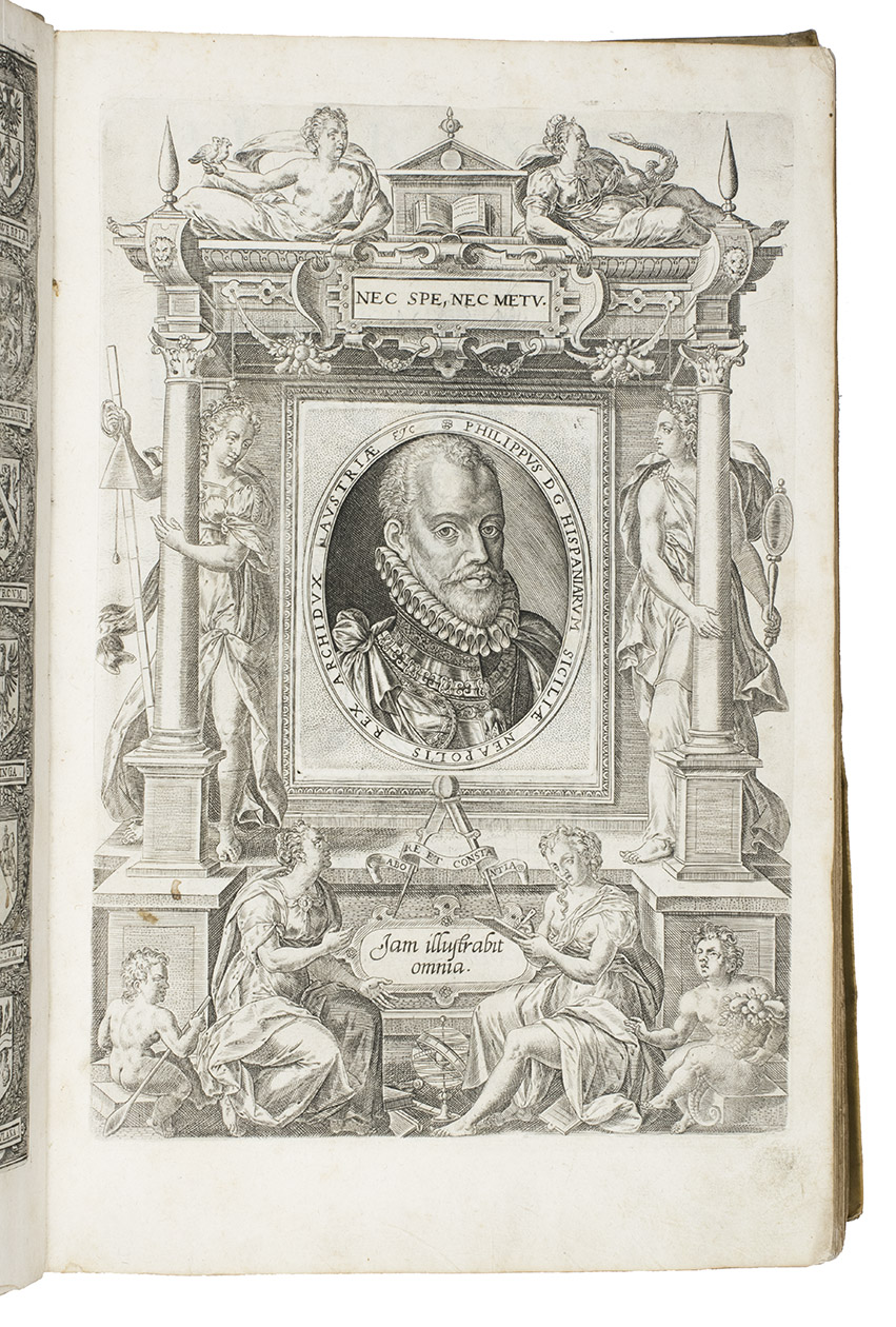 Antwerp, Christopher Plantin, 1588. Folio. With an engraved allegorical frontispiece of the Low Countries (Belgia), an engraved architectural title in its first state with printed text, an engraved plate with a border of the coat of arms of the 16 Provinces and that of Brabant together with the coat of arms of Philip II in the centre pasted in, an engraved plate with an allegorical depiction of the Arts and Sciences and an architectural border with the portrait of Philip II in the centre, a large woodcut coat of arms of Guicciardini, 64 double-page engraved maps and views, 6 full-page engraved maps and views, 4 single pages with on each 2 engraved maps, woodcut headpieces and initials.