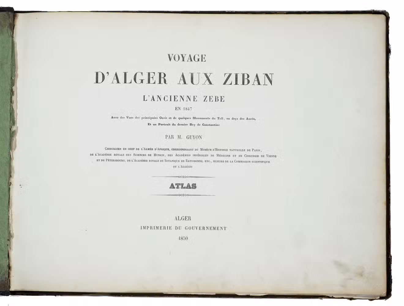 Voyage dAlger aux Ziban lancienne Zebe en 1847. Avec vues des principales oasis et de quelques monuments du Tell, en deça des Aurès, et un portrait du dernier Bey de Constantine. Atlas.
