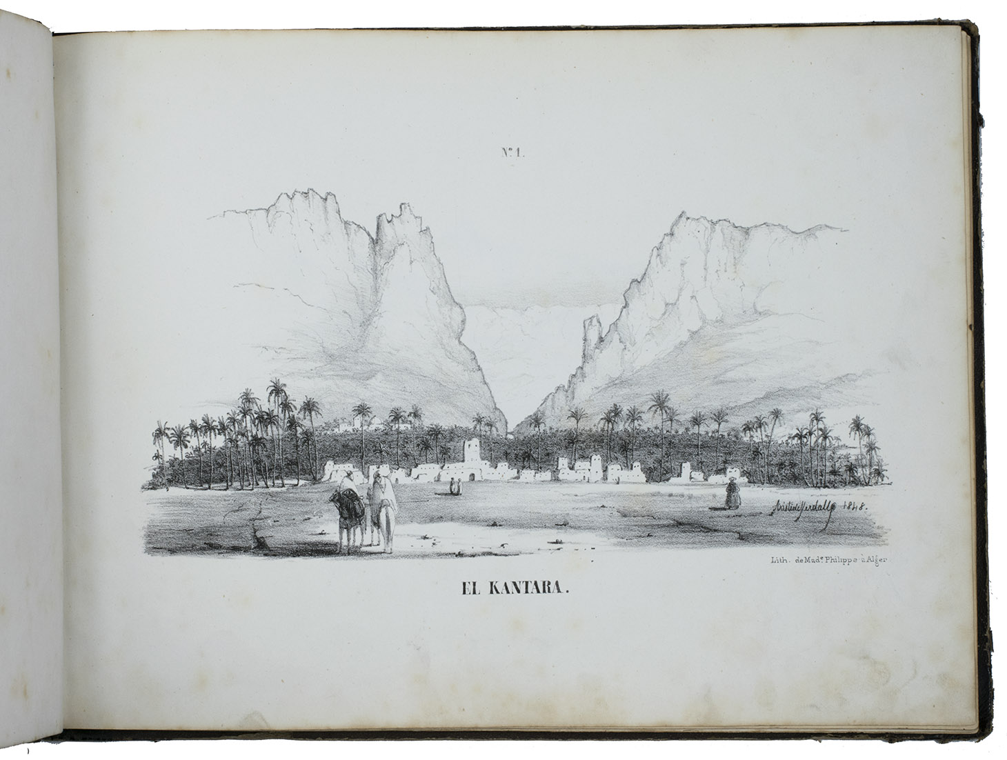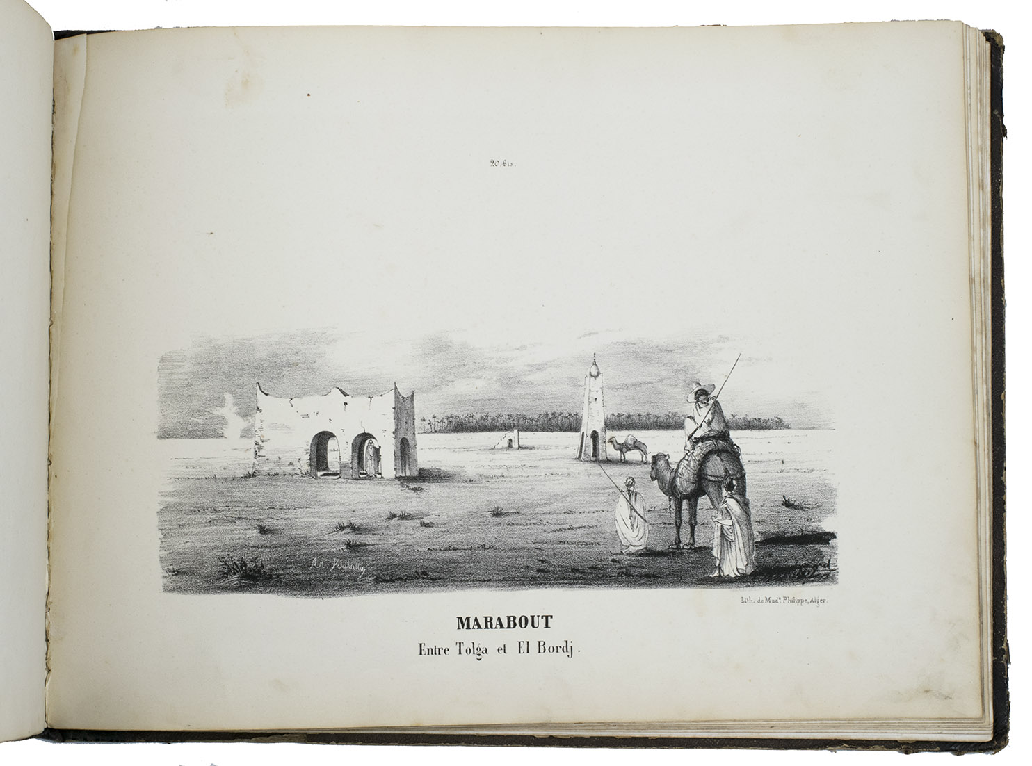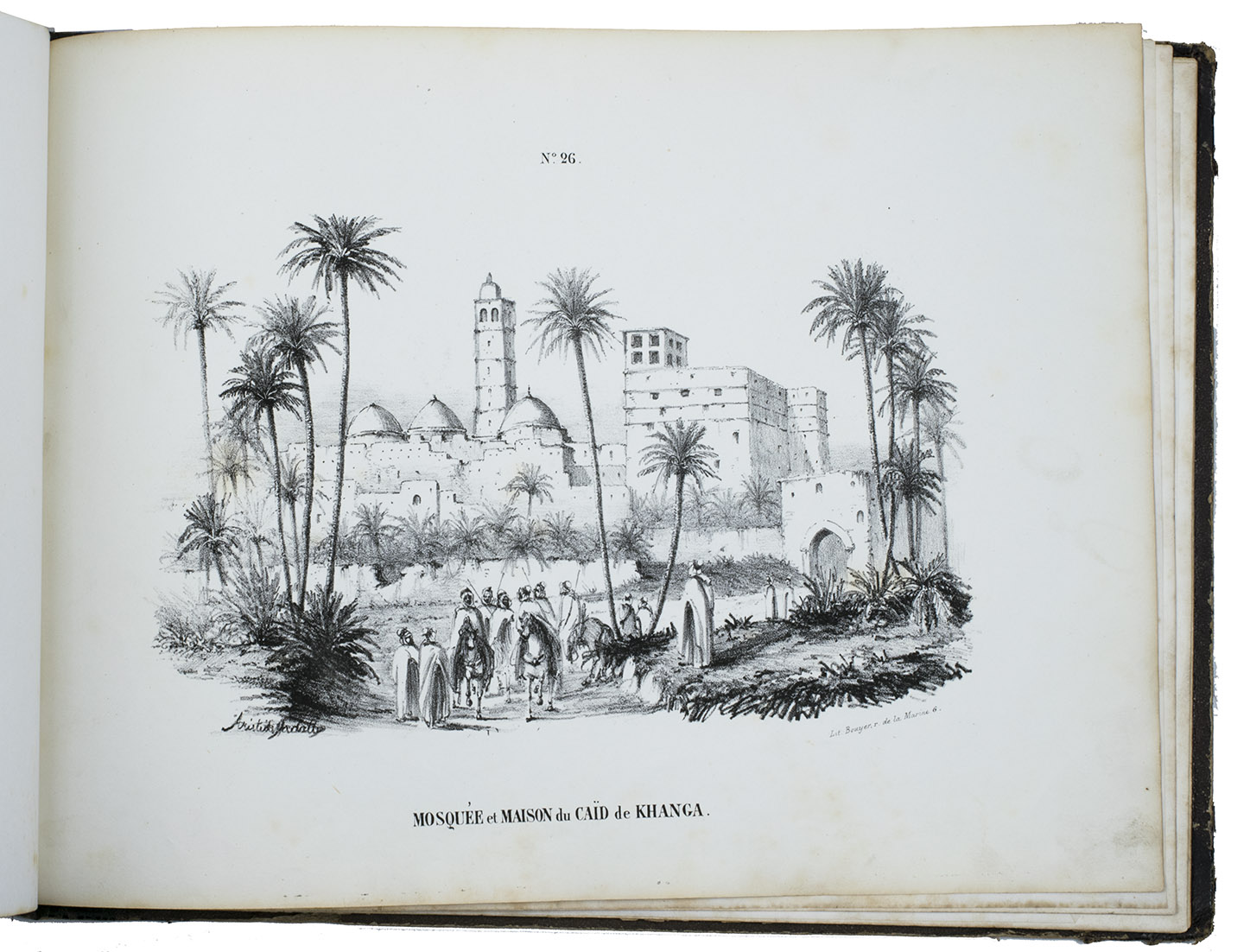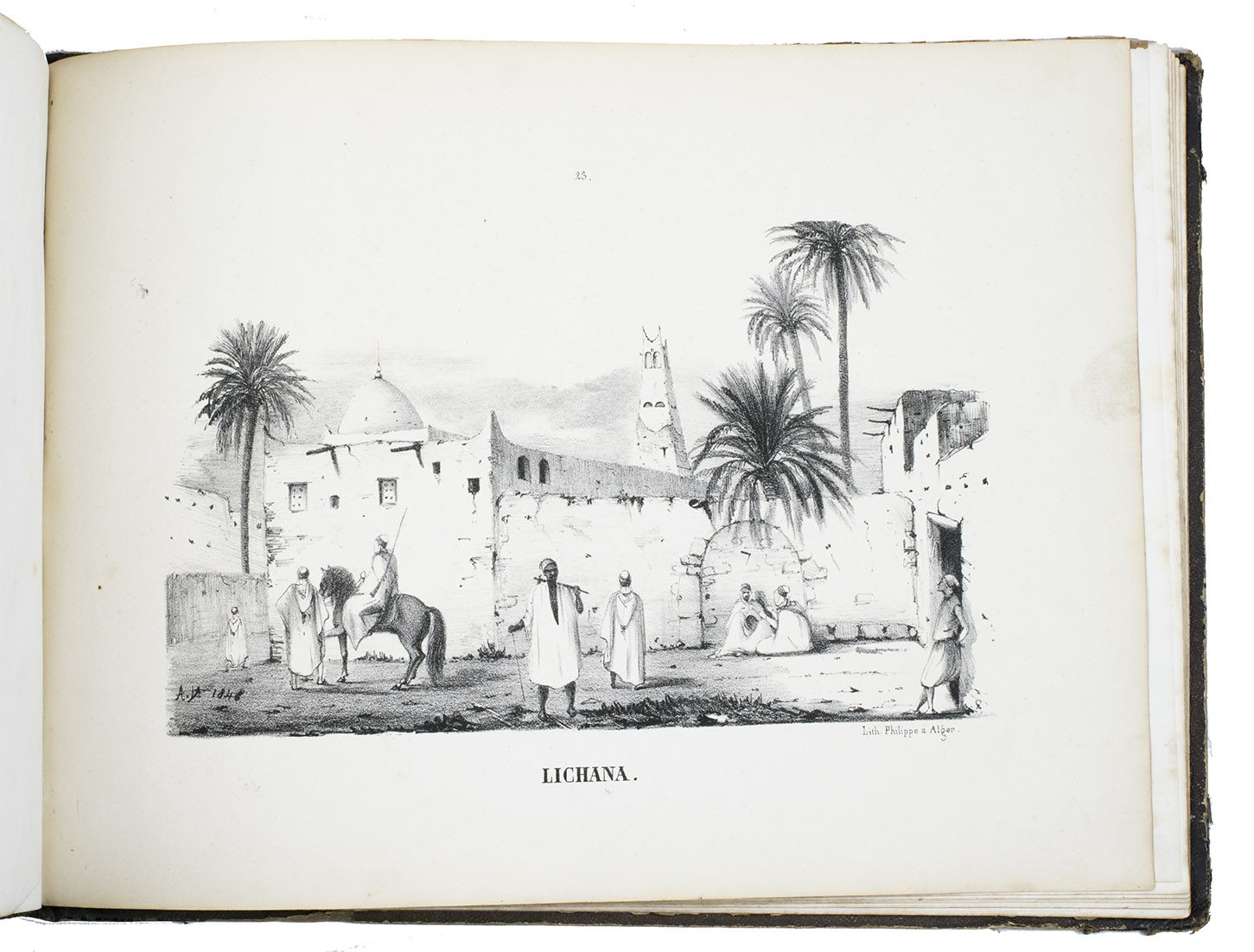 First and only edition of a rare series of 34 views plus a portrait, showing the most important oases and their houses, mosques and other buildings, such as El Kantara, El Outaia, Biskara (5), Zaouia, Toouda, Sidi-Okba (6), Saâda, MLili, Ourlad, Tolga, Marabout, El Bordj, Farfar, Lichana, Bou-Chagroun, Touda, and Caïd de Khanga, and Roman antiquities at Lambasa (Lambaesis) and Diana veteranorum (7: Temples of Victoria and Aesculapius, Arc de Triomphe, etc.) in the region Constantine, northeast Algeria: the Zebe-region as it was called in Roman times.
