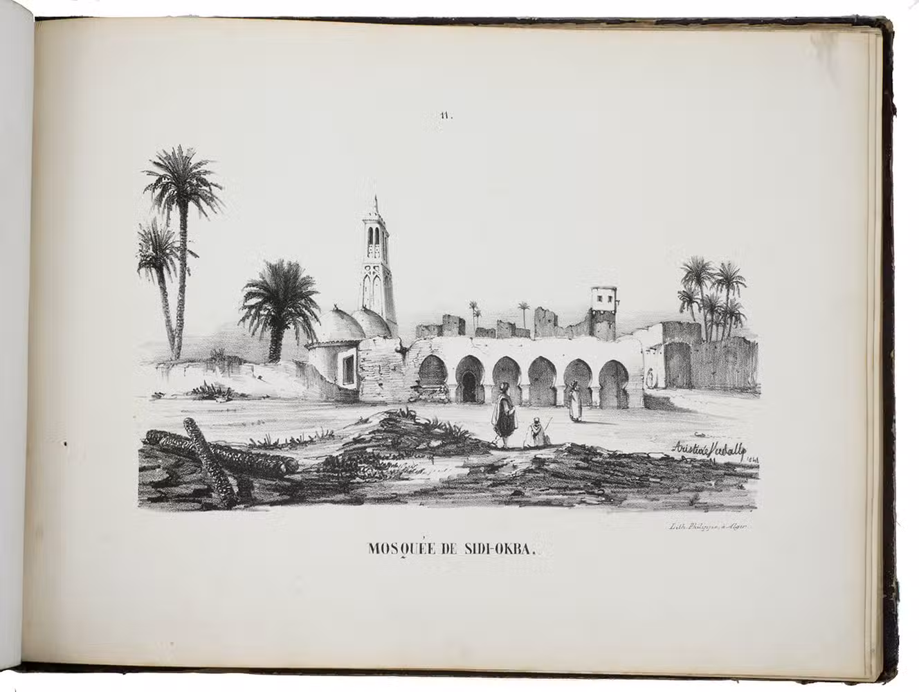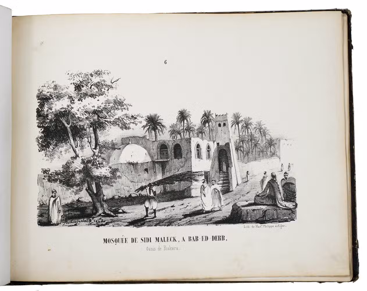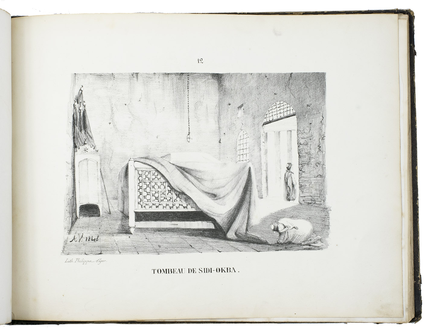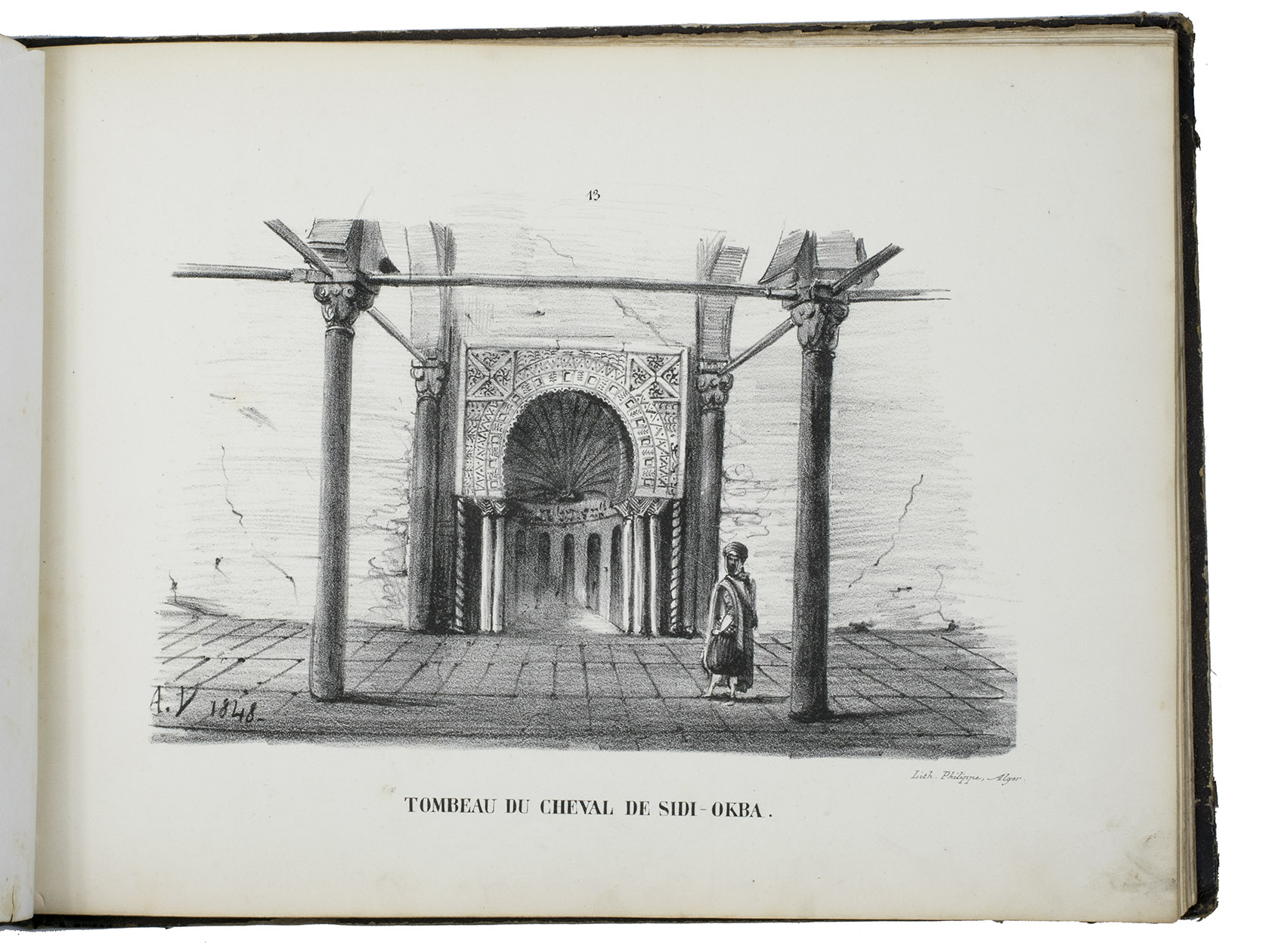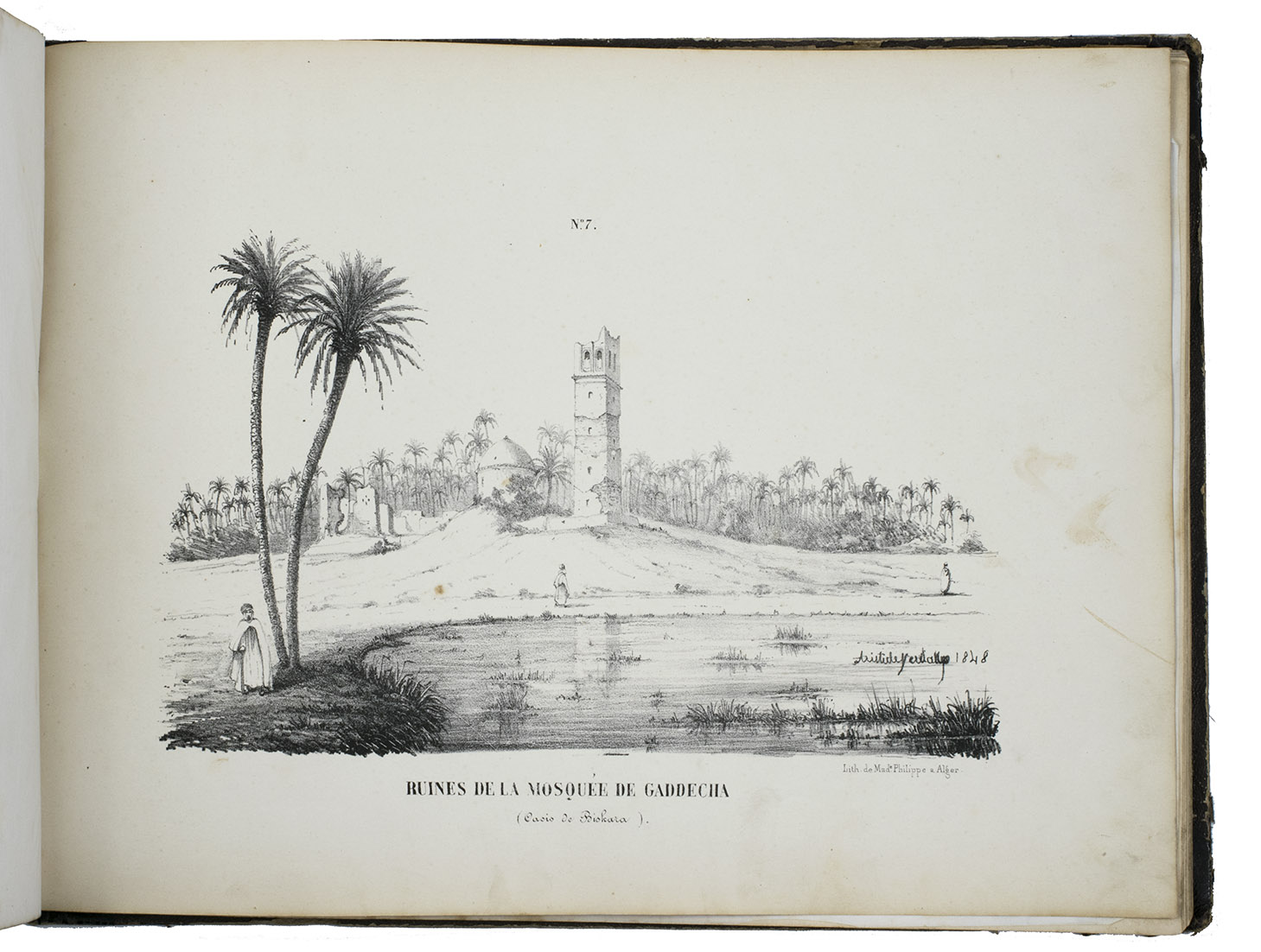 First and only edition of a rare series of 34 views plus a portrait, showing the most important oases and their houses, mosques and other buildings, such as El Kantara, El Outaia, Biskara (5), Zaouia, Toouda, Sidi-Okba (6), Saâda, MLili, Ourlad, Tolga, Marabout, El Bordj, Farfar, Lichana, Bou-Chagroun, Touda, and Caïd de Khanga, and Roman antiquities at Lambasa (Lambaesis) and Diana veteranorum (7: Temples of Victoria and Aesculapius, Arc de Triomphe, etc.) in the region Constantine, northeast Algeria: the Zebe-region as it was called in Roman times.