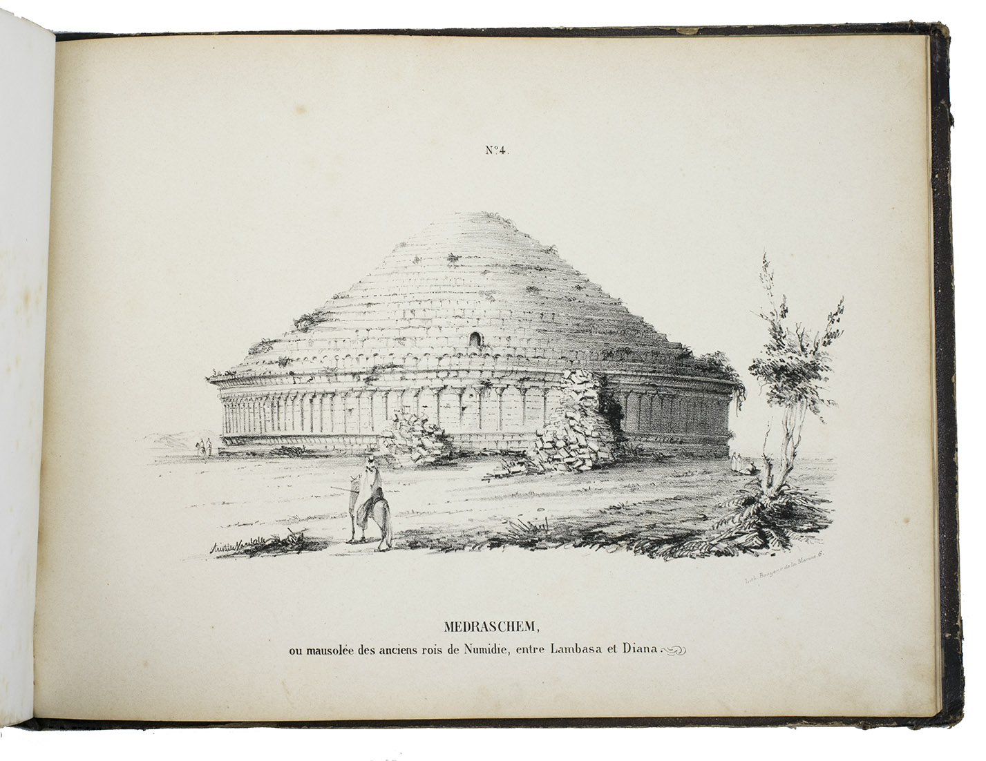 Algeria, Imprimerie du Gouvernement, 1850. Oblong 4to. With 35 plates, namely a portrait of Hadj Hamed (or Ahmet Bey ben Mohammed sherif, the last Bey of Constantine; 1784-ca. 1850), and 34 views of various parts, cities and Roman remains in Algeria (Constantine), Half black morocco, brown cloth sides, gold-tooled spine. [4] pp.