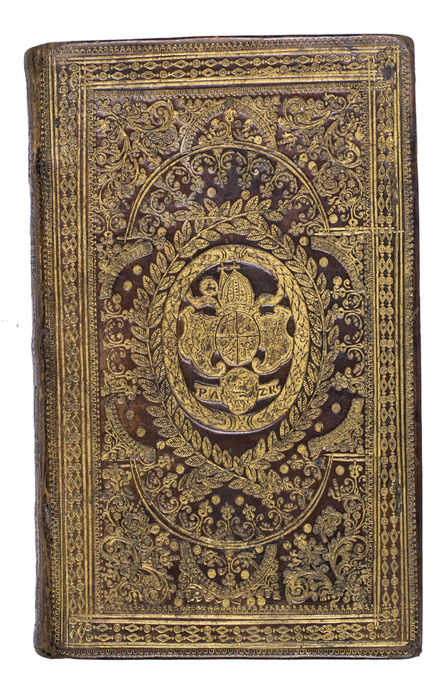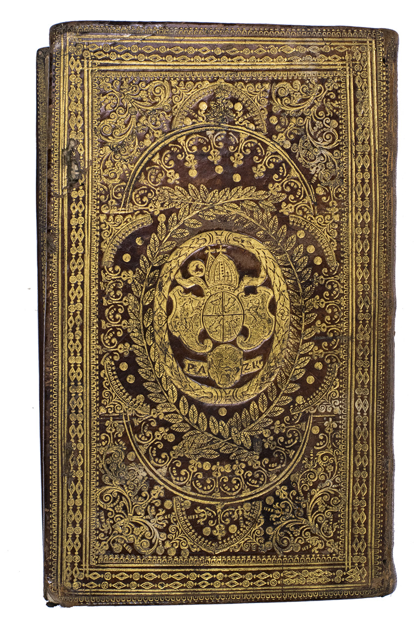 Antwerp, Balthasar Moretus (Officina Plantiniana), 1635. 8vo. With an engraved title page and 38 full-page emblematic engravings. Richly gold-tooled calf (ca. 1665), each board with the arms of (apparently) Abbot Placidus Buechauer (1611-1669) of Kremsmünster, gilt and elaborately gauffered edges. XL, 404, [26], [2 blank] pp.