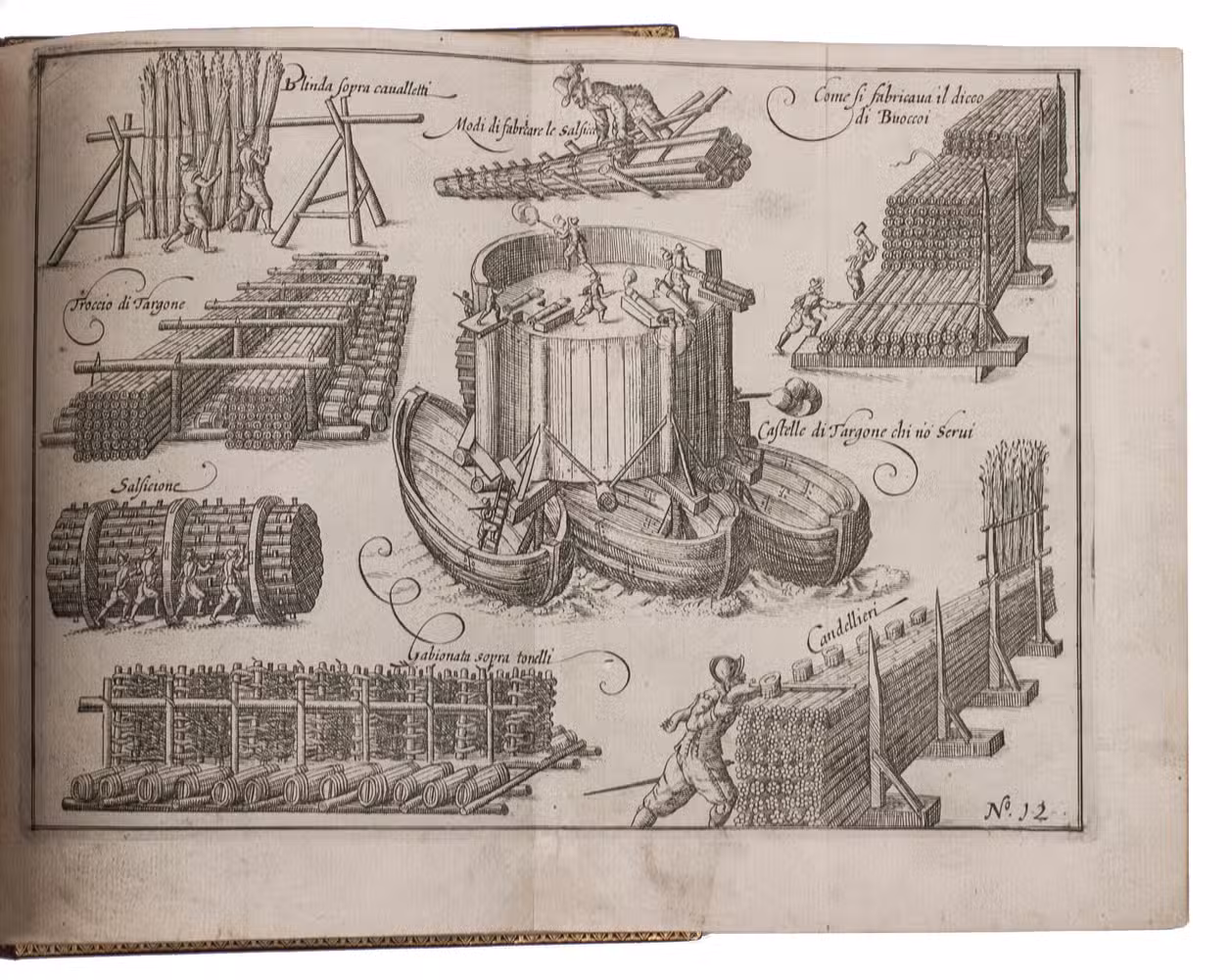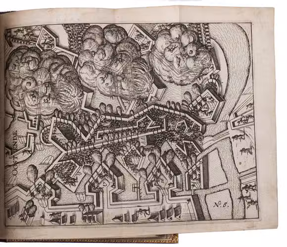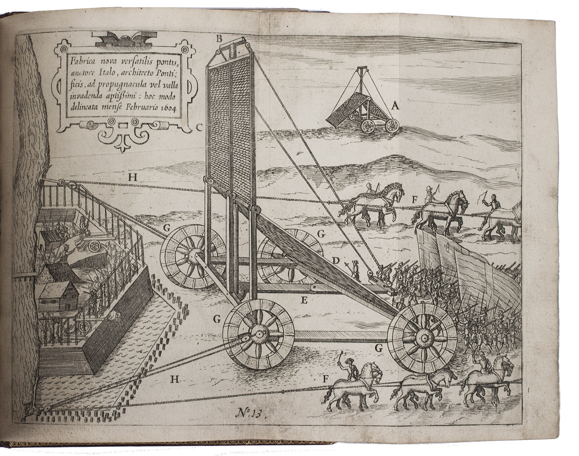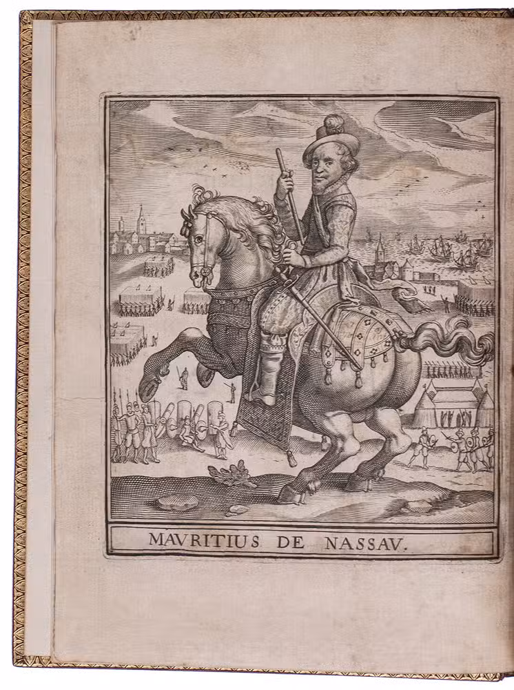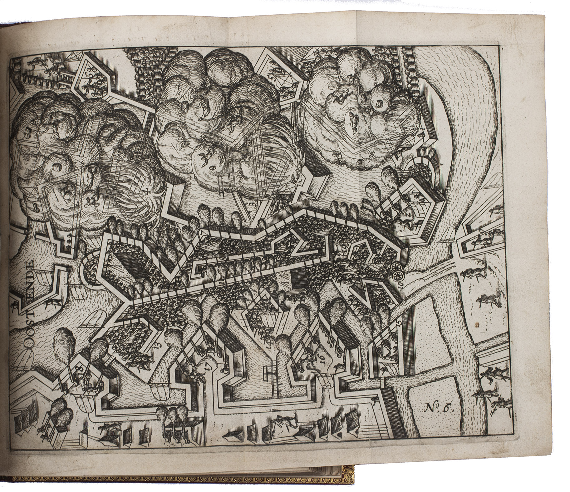 Leiden, Louis Elzevier, 1615. 4to. With an engraved frontispiece portrait of Maurits van Nassau, an engraved vignette on title-page, engraved coat of arms of Maurits van Nassau on the back of title-page and 12 (of 14) folding engraved plates. Gold-tooled red morocco (ca. 1885), richly gold-tooled spine, gilt edges (Riviere & son). [10], 293[= 295], [1] pp.