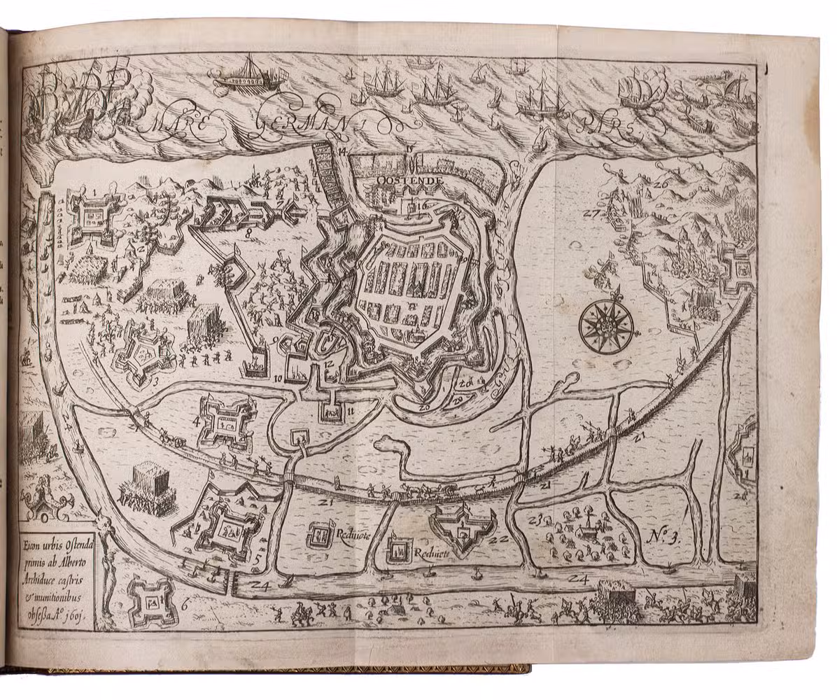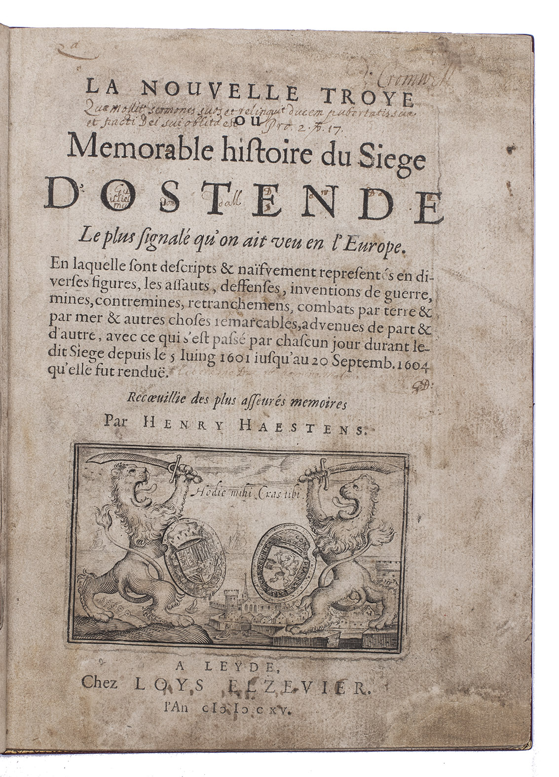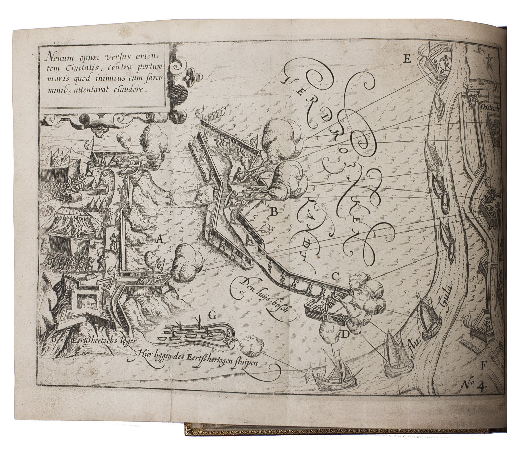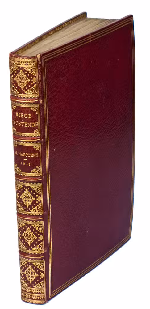First edition of the French translation of one of the earliest accounts of the famous siege of Ostend, Belgium, by the Spanish army. For more than three years (1601-1604) the Spanish Royal Army laid siege to the town and finally conquered it. The siege took so long because the town could still get its supplies by sea and because the army of the States General, under command of Maurits van Nassau, tried to distract the Spanish army by besieging surrounding cities. When Ostend surrendered, the town was no more then a ruin due to all the acts of war that had taken place. The folding engraved plates show the city's fortifications, the Dutch and Spanish fleet, the different stages of the siege, and siege engines, including "Pompee's Chariot".