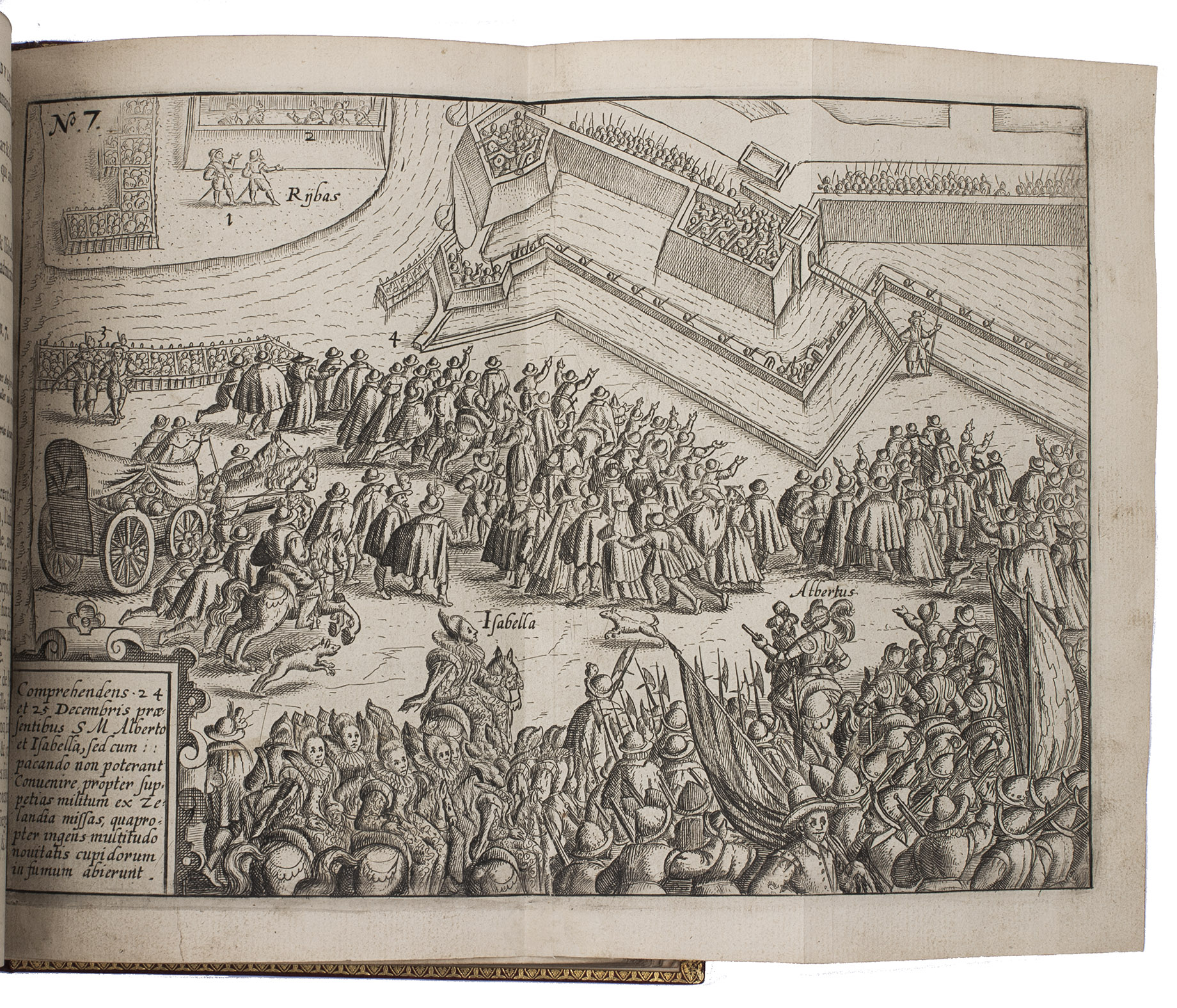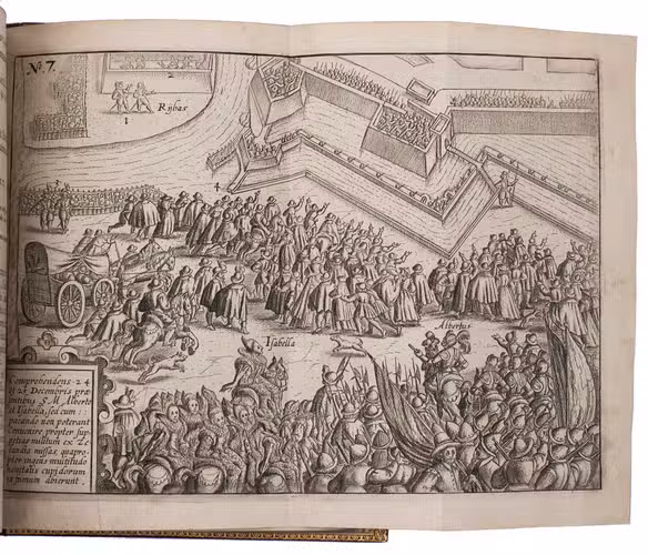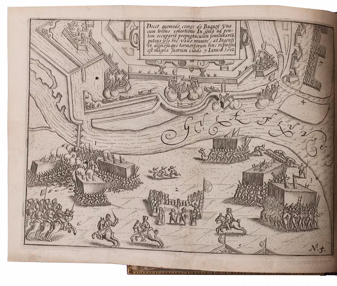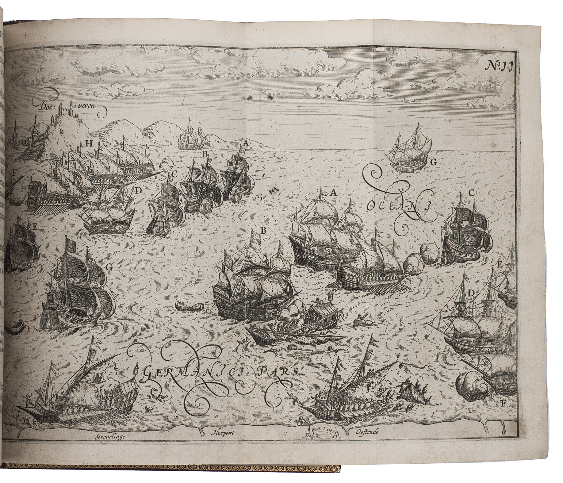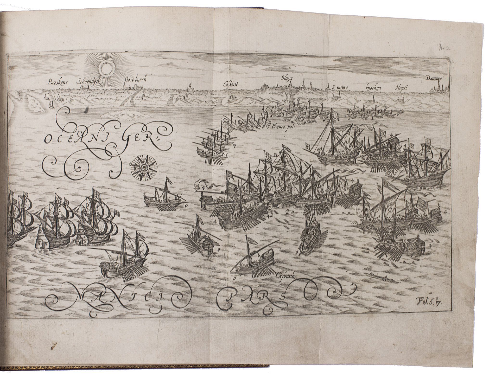 First edition of the French translation of one of the earliest accounts of the famous siege of Ostend, Belgium, by the Spanish army. For more than three years (1601-1604) the Spanish Royal Army laid siege to the town and finally conquered it. The siege took so long because the town could still get its supplies by sea and because the army of the States General, under command of Maurits van Nassau, tried to distract the Spanish army by besieging surrounding cities. When Ostend surrendered, the town was no more then a ruin due to all the acts of war that had taken place. The folding engraved plates show the city's fortifications, the Dutch and Spanish fleet, the different stages of the siege, and siege engines, including "Pompee's Chariot".