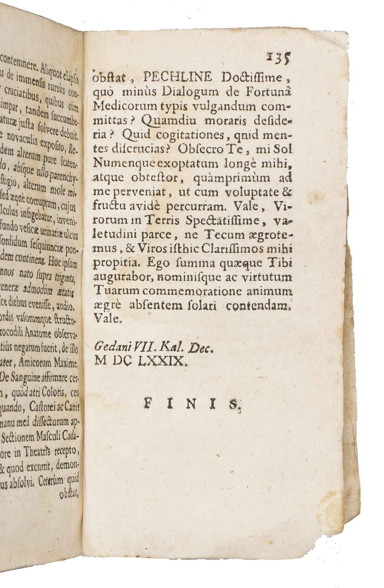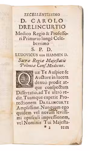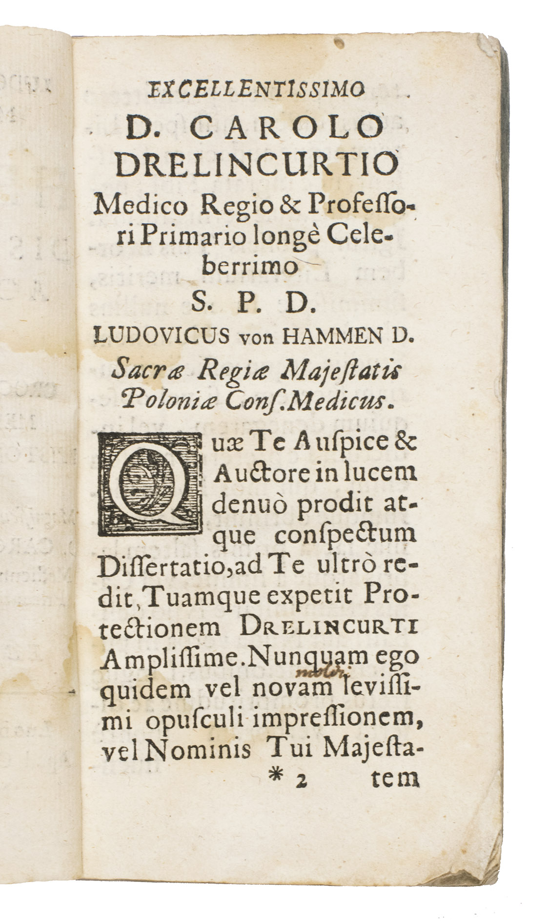 Rare medical dissertation on hernias, including a highly important correspondence between the author and Johann Nicolaus Pechlin (ca. 1644-1706), with a description of one of the first post-surgical microscopic tissue examinations ever performed. The author, Ludwig von Hammen (1651-1689), was a pioneer in the field of urological surgery, and performed possibly the first partial prostatectomy in the history of medicine in 1678, which is described in the present work.