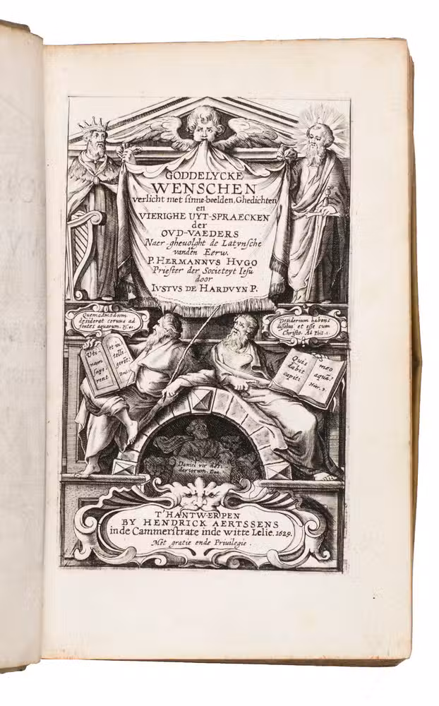 Goddelycke wenschen verlicht met sinne-beelden, ghedichten en vierighe uyt spraecken der Oud-Vaders. Naer ghevoilght de Latynsche vanden Eerw. P. Hermannus Hugo ... door Justus de Harduyn P.